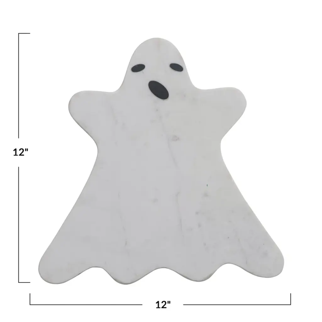 This Ghost-shaped Cheese and Cutting Board, measuring 12 inches by 12 inches, is crafted from durable white and black marble. Perfect for Halloween gatherings, it adds a touch of spooky elegance to any table setting. Hand wash only to maintain its pristine condition. The unique design makes it a great conversation starter and a fun way to serve cheese and appetizers during the spooky season. Its robust and durable construction ensures it will last for many Halloweens to come, providing you with a reliable and long-lasting kitchen accessory.