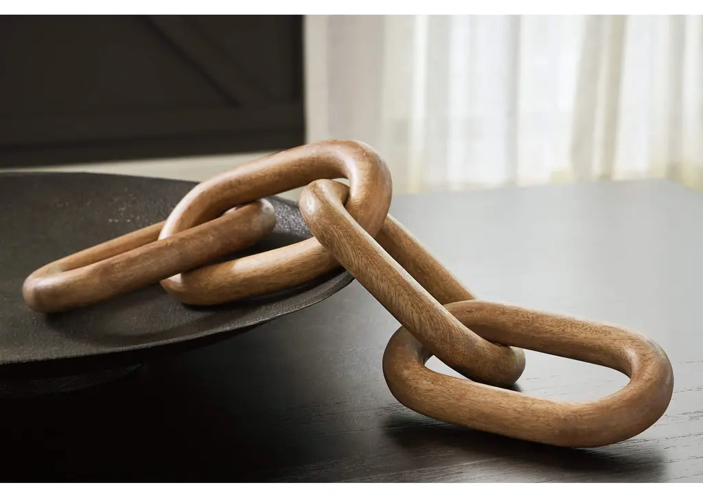 The Mardelby sculpture sets the standard for casually cool art. Interlocking wood rings in a natural brown finish add an organic element to your decor. When displayed on a TV stand or fireplace mantel, or draped across a stack of books, it's such an impressive focal point. Weight 2.000 lbs. (0.9kgs.)