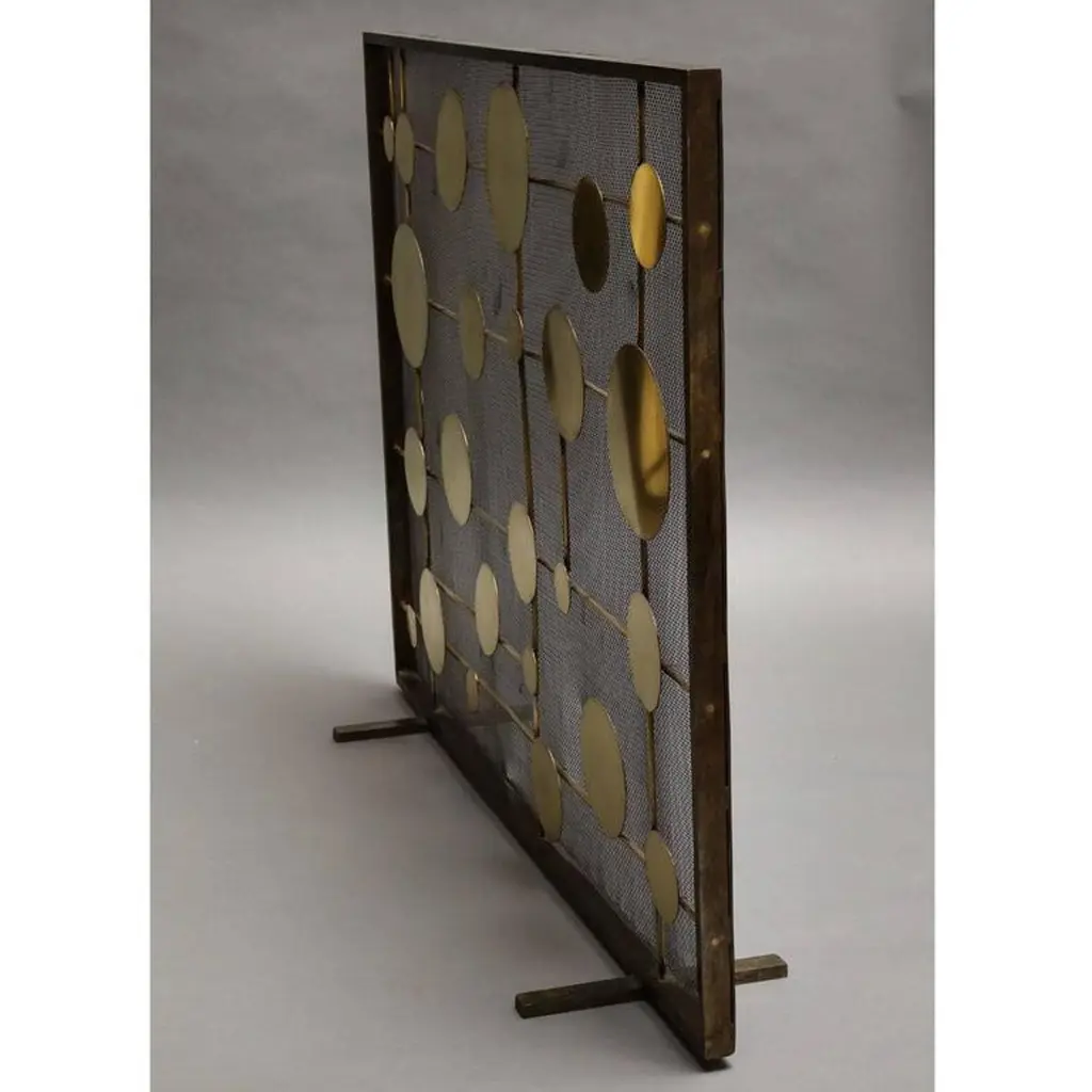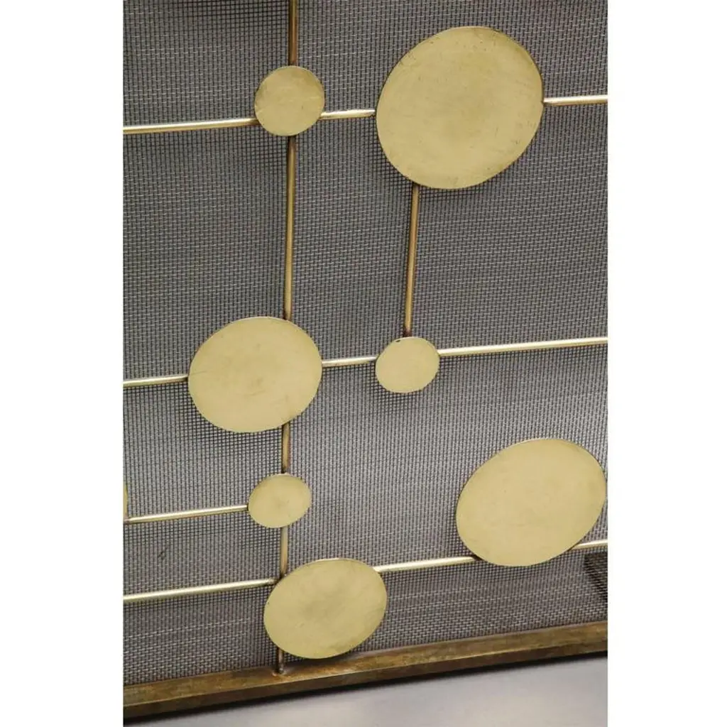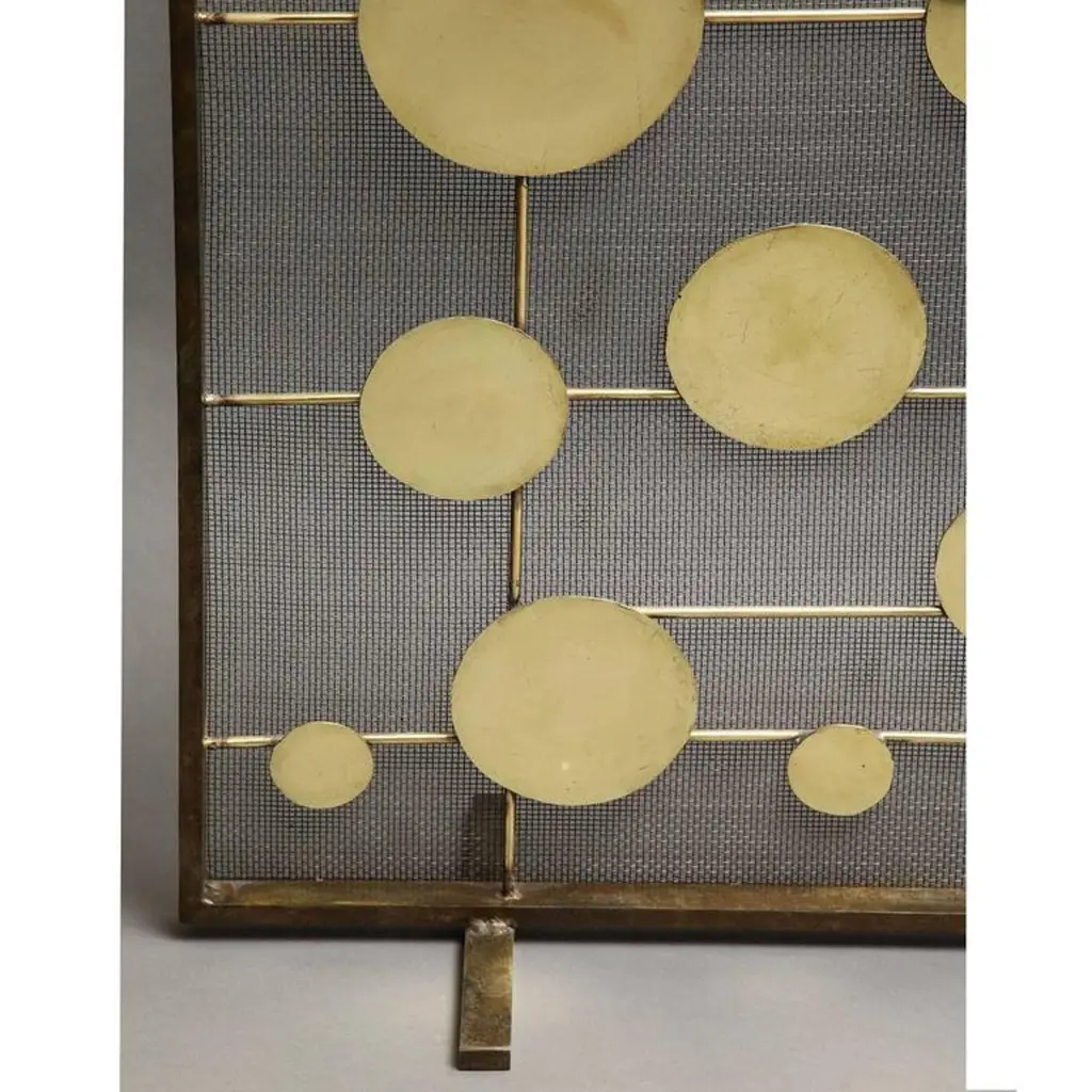 Marie Suri "Cirque" fire screenFire screen with scattered brass disks mounted on brass rods. Mesh backing makes these an excellent choice for wood-burning fireplaces.Custom inquiries welcome.Made to order expressly for Liz O’Brien.Measurements shown: 32.5" H x 44" W x 10" DPlease see Marie Suri's other work: Andirons, mirrors, lighting and wall sculptures.