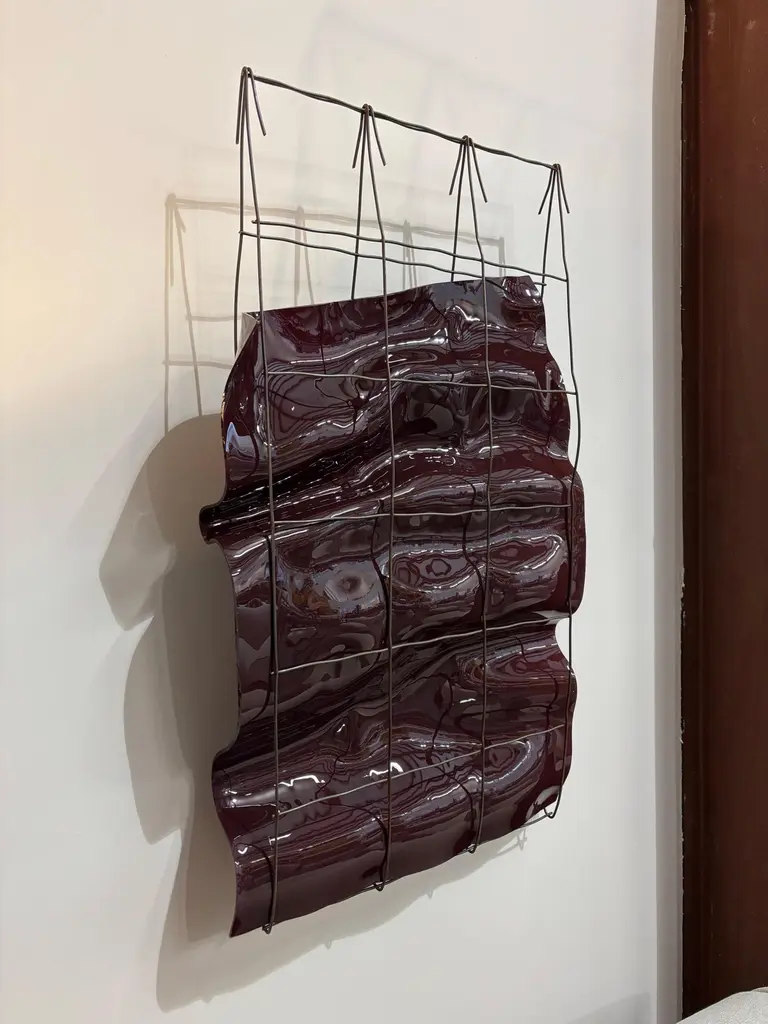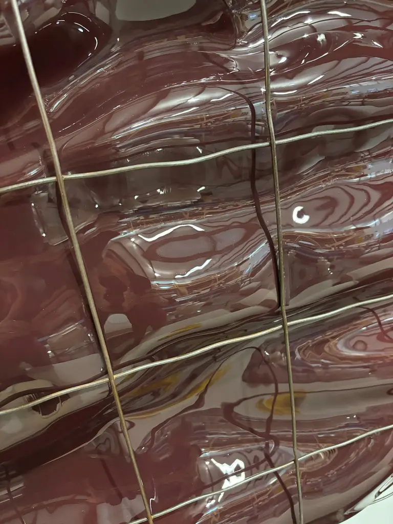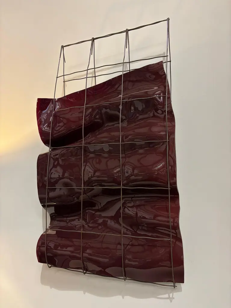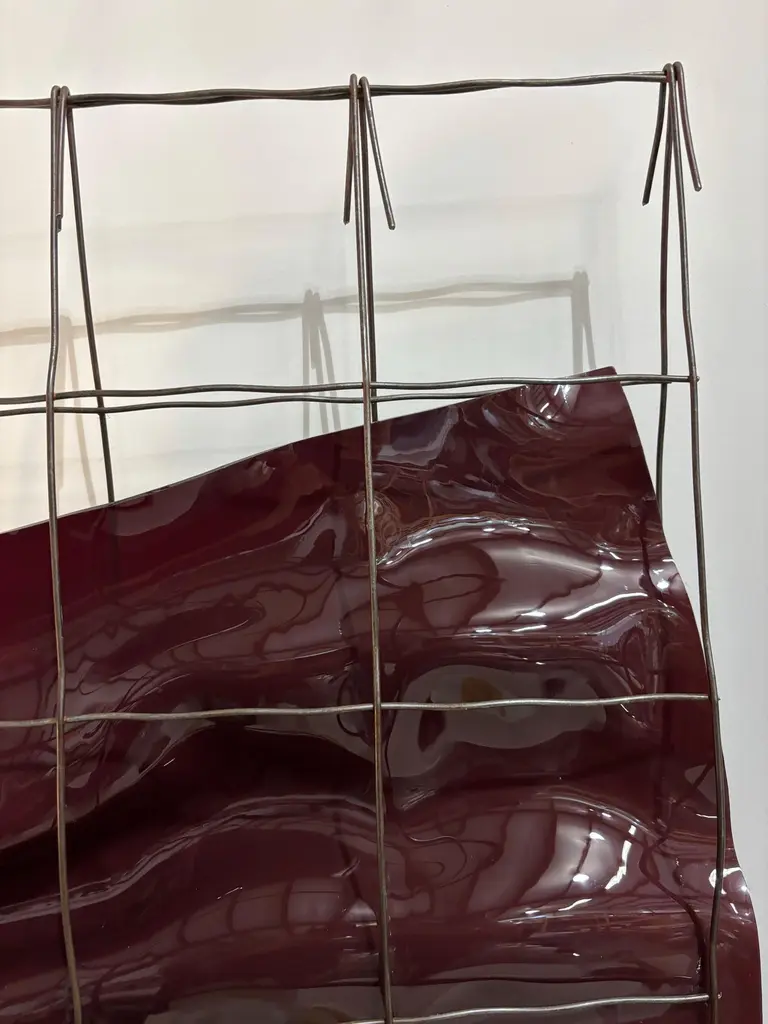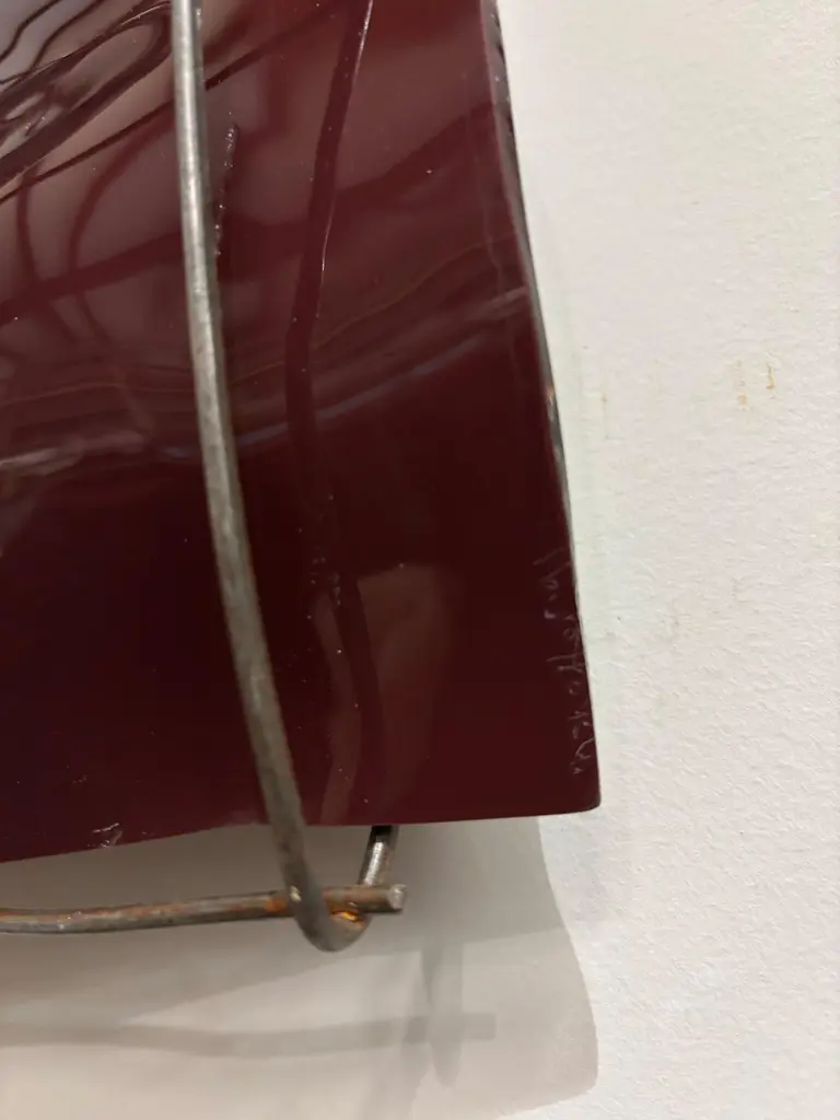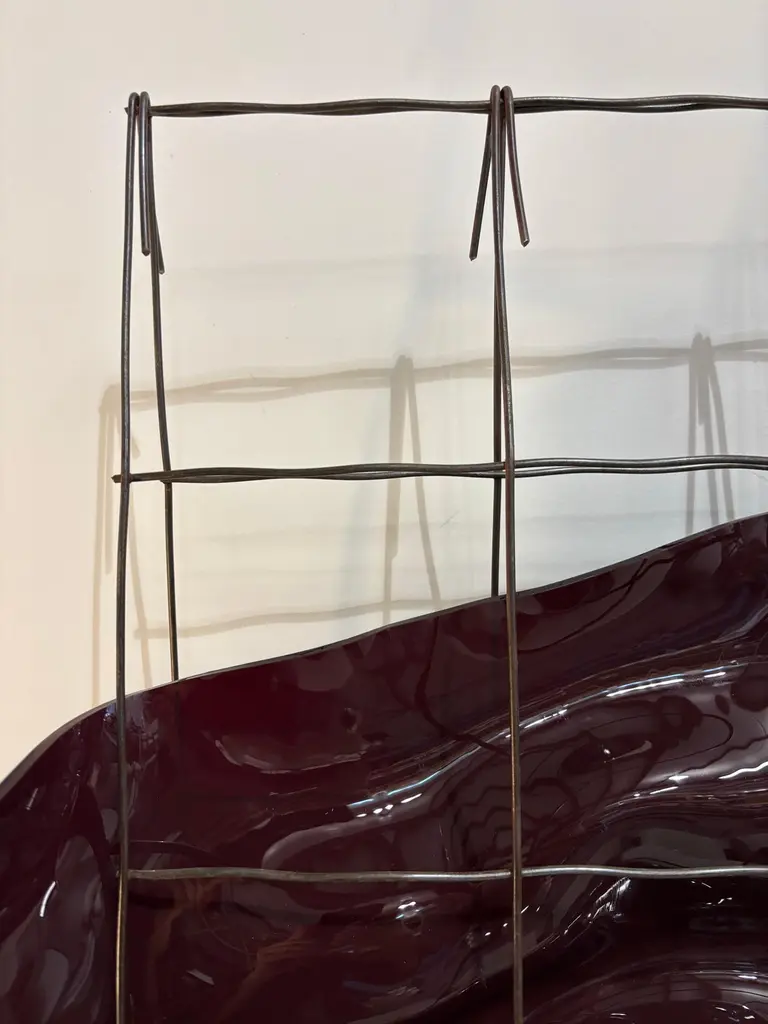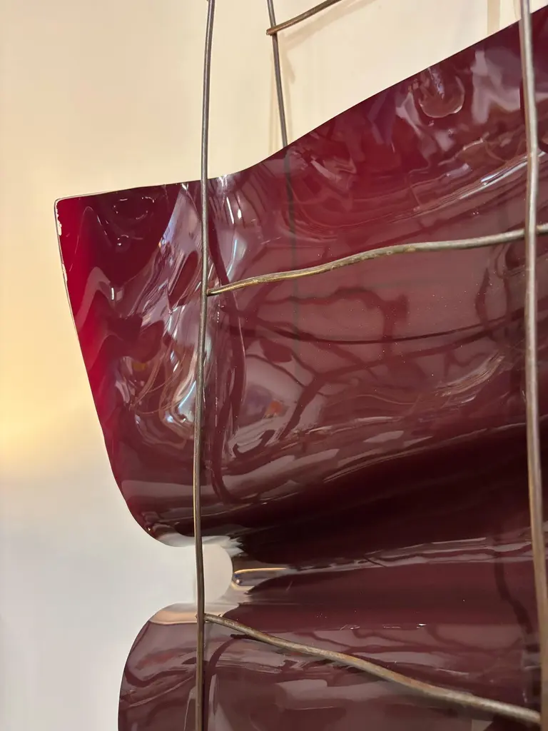 Signed and dated, 1991, an early Mary Shaffer slump glass sculpture. Ox-blood red glass in a wire cage. "What separated Mary Shaffer from other Studio Glass artists was that her work never traded on its novelty alone. Her innovative “mid-air slumping,” as she called it, was a signature feature, but always in service of her highly developed aesthetic, and this has continued throughout her long and storied career, which has seen her work enter the collections of the Metropolitan, MoMA, and MAD museums in New York City alone. Her work was championed by the late critic (and editor of UrbanGlass) John Perreault, who saw in her an example of work in glass that transcended boundaries on the strength of its execution." - Andrew Page, GLASS: The UrbanGlass Art Quarterly