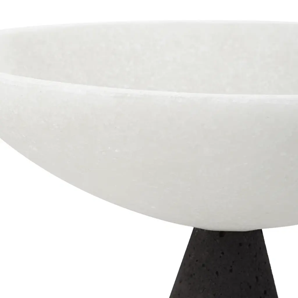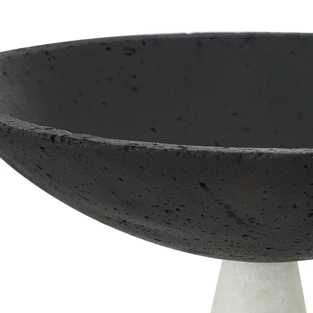 Abstract modern art for your coffee table or console. Arriving as a 2-piece set, this decorative bowl sculpture features a tapered cone pedestal base and a rounded basin up top for a sleek, streamlined look we simply love. Machine-made from stoneware, it shows off a muted two-tone finish of black and white that works nicely with your preferred palette. One of these structures is larger than the other, and the color scheme is flipped between the two for a dynamic addition to any space.