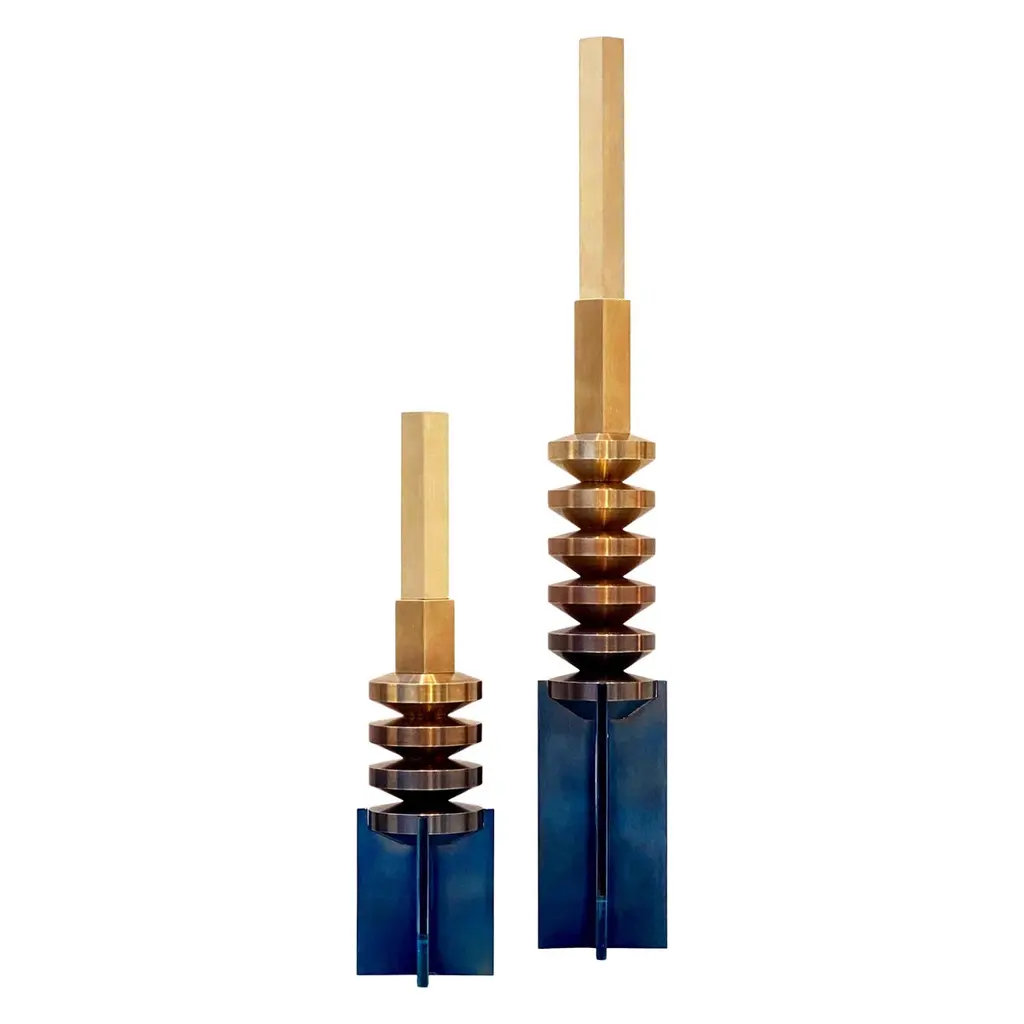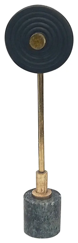 A symbol of protection, the Mati is well known in many cultures around the world as the "evil eye." Two overlapping, concentric circles create the recognizable motif known to ward off evil spirits in the Mati sculpture. This stylized adaptation is crafted from textured cast aluminum bronze finished disks surrounded by an antique brass center. A matching antique brass stem fixes the sculpture to a cylindrical veslana marble base. With three sizes available in this series, the Mata sculpture is best shown in multiples to create a striking display.