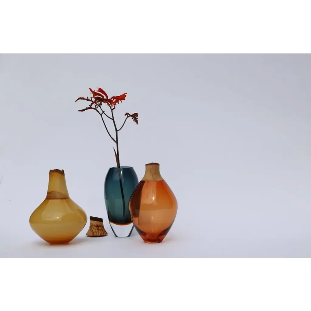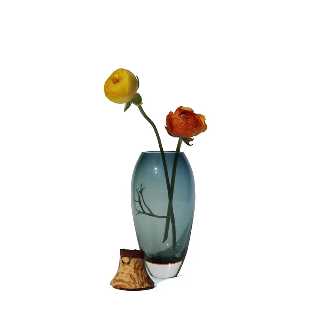 Utopia & Utility's stacking vessel Matisse I is a handcrafted glass sculpture designed by Finnish-German artist Pia Wüstenberg. This exquisite piece features a bulbous glass vessel crowned by a wooden piece with beautiful, naturally unsymmetrical edges. When stacked together, the components form a striking sculpture, and while separate, the glass vessel can be used as a vase for flowers. The Stacking Vessels collection celebrates local craftsmanship, with all its pieces produced in Europe: the glass is mouth-blown in the Czech Republic, the wooden pieces hand-turned in Finland and the metal parts hand-spun in England. The final assembly takes place at Utopia & Utility's own warehouse in Northern Germany. Skillfully crafted Stacking Vessels add a captivating touch to any shelf or dining table and serve as a perfect choice for a memorable gift.