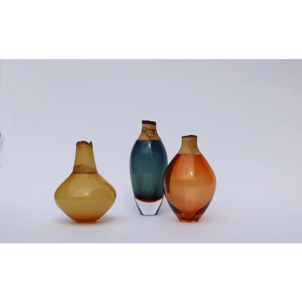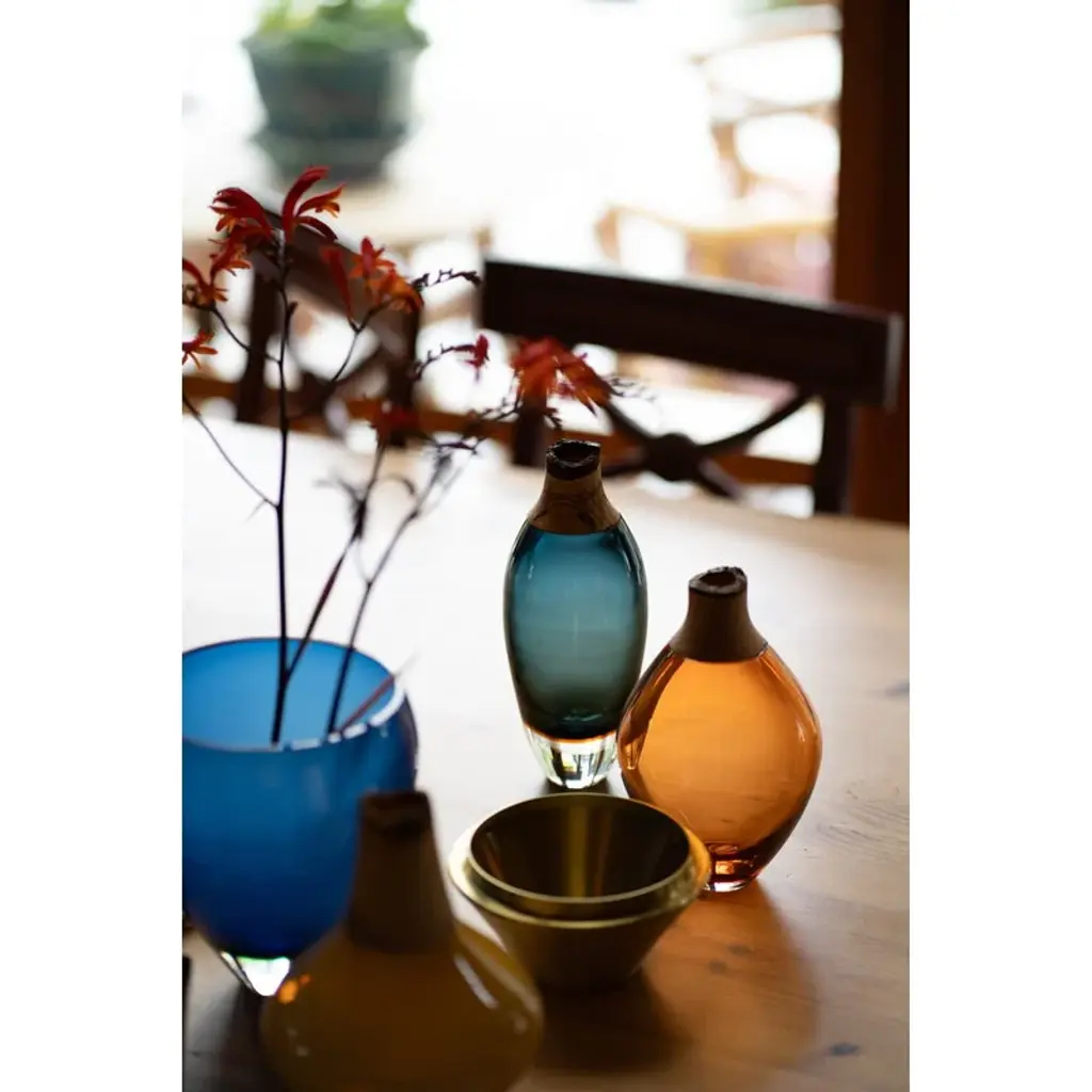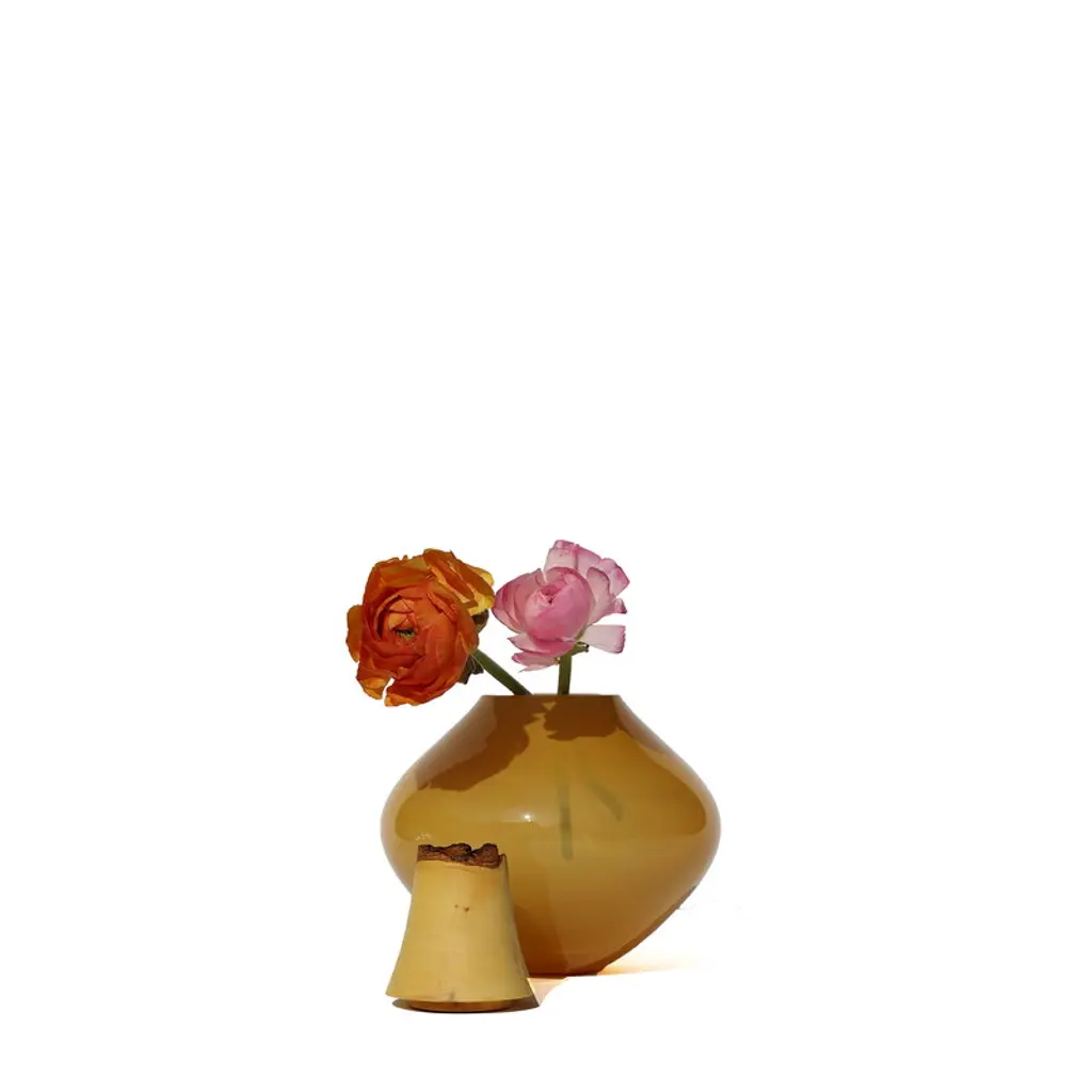 Utopia & Utility's stacking vessel Matisse II is a handcrafted glass sculpture designed by Finnish-German artist Pia Wüstenberg. This exquisite piece features a bulbous glass vessel crowned by a wooden piece with beautiful, naturally unsymmetrical edges. When stacked together, the components form a striking sculpture, and while separate, the glass vessel can be used as a vase for flowers. The Stacking Vessels collection celebrates local craftsmanship, with all its pieces produced in Europe: the glass is mouth-blown in the Czech Republic, the wooden pieces hand-turned in Finland and the metal parts hand-spun in England. The final assembly takes place at Utopia & Utility's own warehouse in Northern Germany. Skillfully crafted Stacking Vessels add a captivating touch to any shelf or dining table and serve as a perfect choice for a memorable gift.