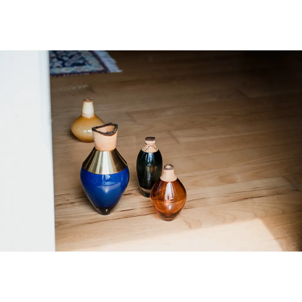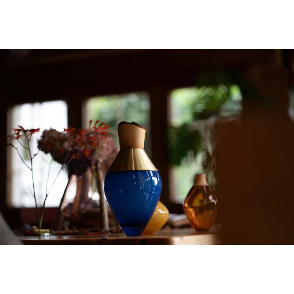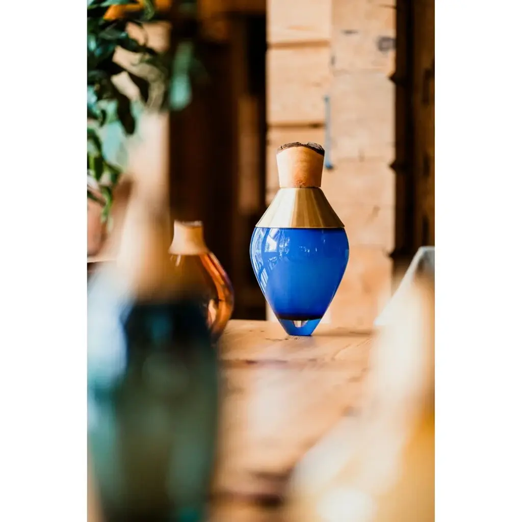 Utopia & Utility's stacking vessel Matisse II is a handcrafted glass sculpture designed by Finnish-German artist Pia Wüstenberg. This exquisite piece features a bulbous glass vessel crowned by a wooden piece with beautiful, naturally unsymmetrical edges. When stacked together, the components form a striking sculpture, and while separate, the glass vessel can be used as a vase for flowers. The Stacking Vessels collection celebrates local craftsmanship, with all its pieces produced in Europe: the glass is mouth-blown in the Czech Republic, the wooden pieces hand-turned in Finland and the metal parts hand-spun in England. The final assembly takes place at Utopia & Utility's own warehouse in Northern Germany. Skillfully crafted Stacking Vessels add a captivating touch to any shelf or dining table and serve as a perfect choice for a memorable gift.