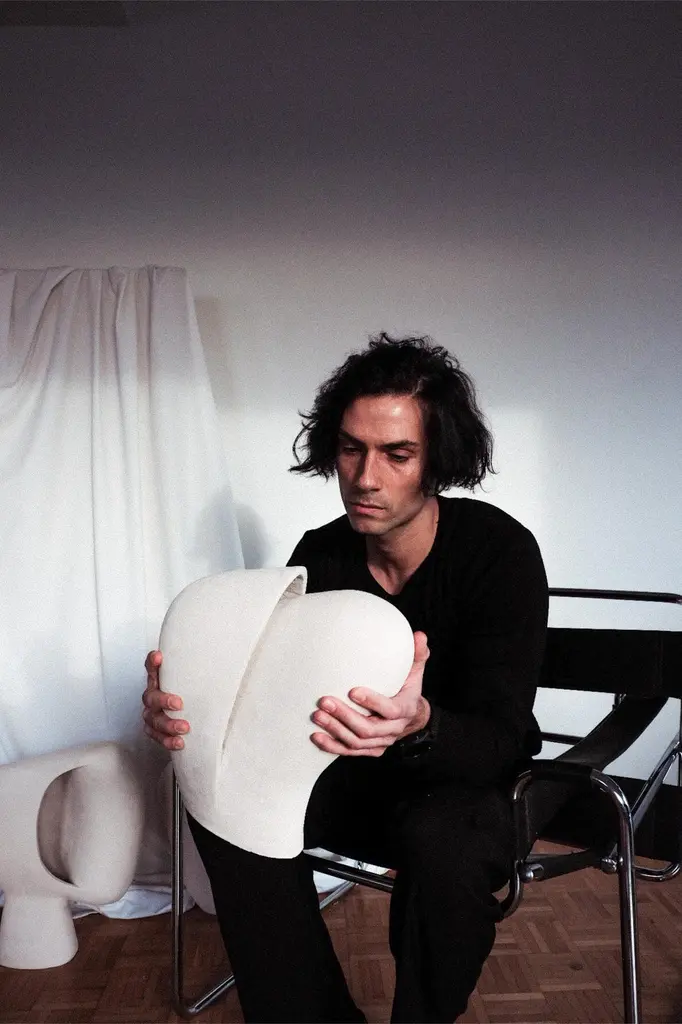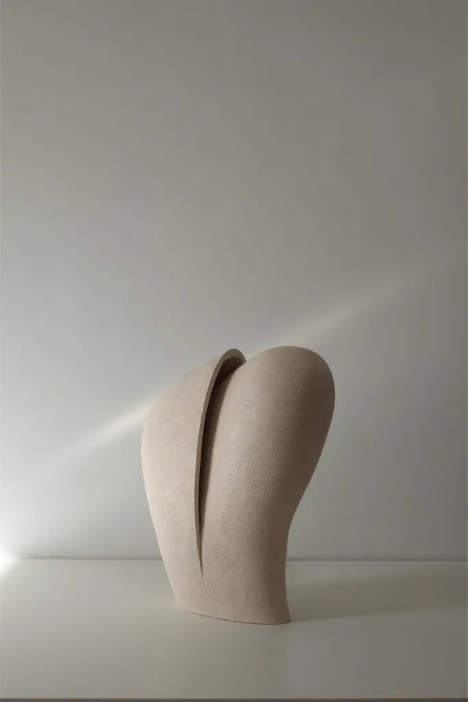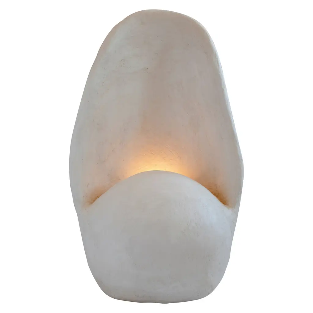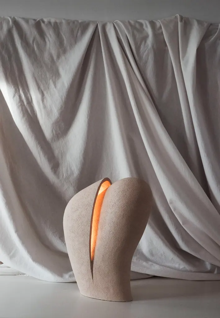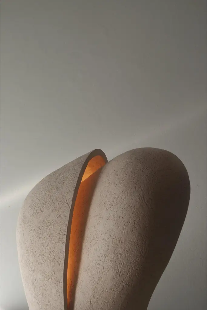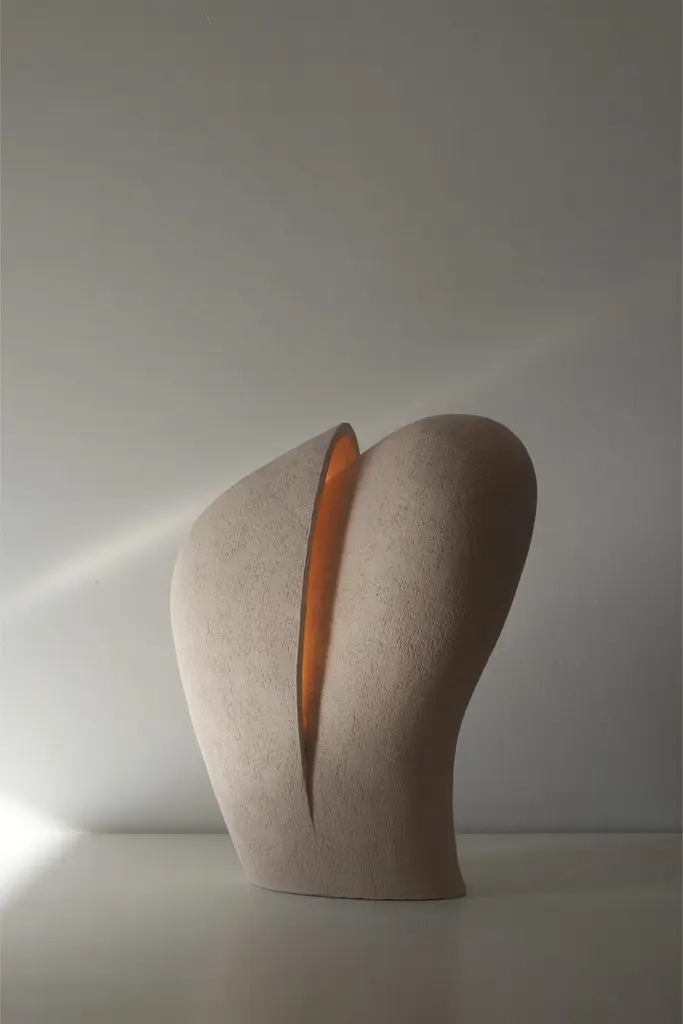 Matra Functional Sculpture by Andrei ClonteaDimensions: W 13 x D 29 x H 36 cmMaterials: CeramicsIt’s important to note that due to the hand-building process, each piece may present slight differences. This adds to their unique charm and individuality.Open for customisation (size and finishes), provided it enhances the overall piece.MĀTRA is a ceramic lamp which draws its inspiration from the intricate layers of sediments, gracefully overlapping, twisting, and curving within the Earth’s crust, offering a glimpse into the geological marvels that have shaped our world.As it casts a gentle, orange, luminous glow, it conjures images of molten lava silently coursing beneath the Earth’s surface.In this ceramic piece, the volatile geological narrative is quietly reimagined, finding its place in the gentle ceramic form, revealing the poetic elegance hidden within our planet’s most intense moments.Andrei Clontea is a self taught artist who has seamlessly transitioned from the world of architecture to the realm of ceramics. Splitting his time between Luxembourg and Brussels, he has embarked on an artistic journey exploring the infinite possibilities that clay has to offer.His work manifests as sculptural forms that draw inspiration from the elegance of nature, the grace of animals, and the complexity of human body. By translating these influences into organic shapes with earthy textures, he brings a harmonious balance between rawness and refinement.While nature serves as a wellspring of inspiration, his artistic vision transcends its mere replication. His architectural background manifests in his approach as he weaves elements of structure, texture and light into his ceramic pieces. It is through this fusion of natural and architectural sensibilities that his art assumes a distinct character – a dialogue between seemingly contrasting elements.Through his sculptural forms he invites viewers to embark on a sensory journey where they can explore the intricate relationship between human, nature, and architecture.