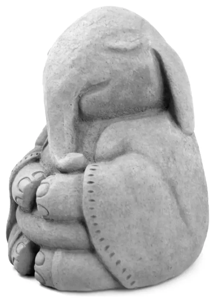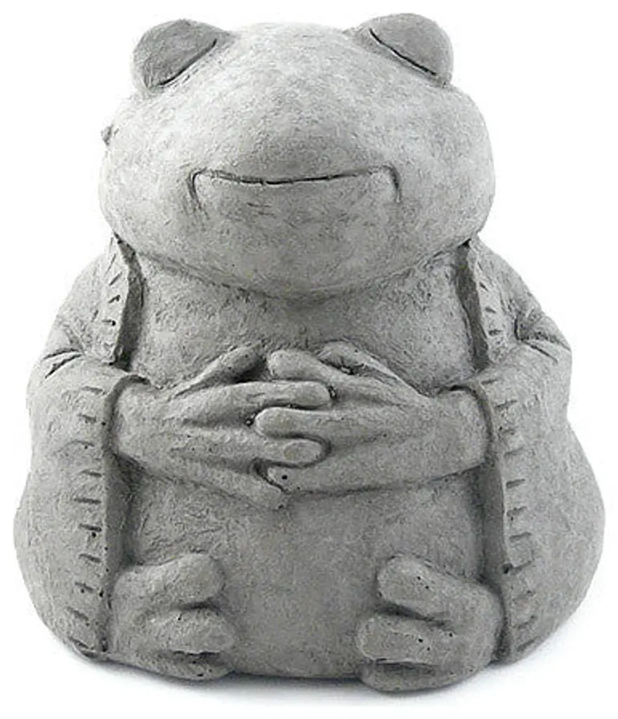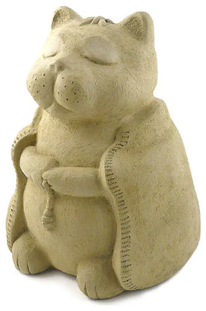 May your life be filled with Independent Spirit"Buddhist thought has long regarded animals as perceptive entities, capable of obtaining a sense of enlightenment. Our Meditating Buddha Cat is a perfect symbol for those who appreciate the independent spirit of zen or those who simply love cats!Cast in strong, high-quality solid concrete - perfect for outdoor use in any climate, the buddha cat adds the perfect dose of delight and tranquility to your patio or garden! Measuring a full 8" tall and 7" wide, the sculpture includes integrated color pigments to create a consistent antiqued color finish that will never flake or fade. Meditating with prayer beads, the cat Includes the Chinese characters for Independence on the reverse of his robe, an appropriate marking for our self-reliant feline friend.Solid cast stoneIntegrated ColorMade in USA