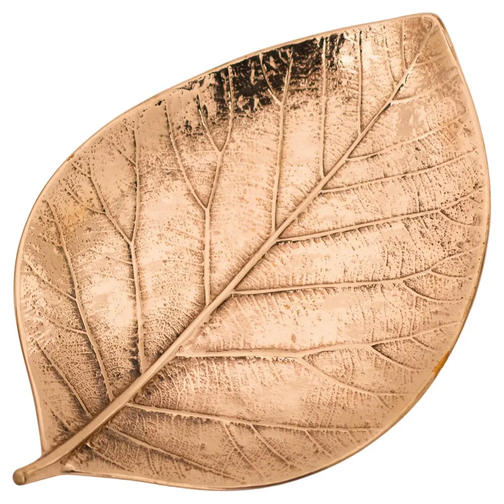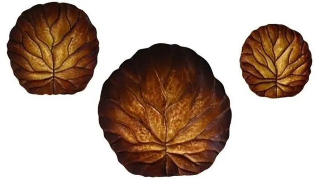Contemporary and classic, our metal leaves have a rich bronze finish. Use them individually or mix and match sizes for a stunning arrangement (each sold separately). Handcrafted of iron with copper bronze finish with gold and brown highlights. Available in three sizes - mix and match for a stunning arrangement. Each sold separately. Edges curve forward for a dimensional effect. Size: 26" Diameter x 1'''' Deep Weight: 3. 5lbs. Heirloom Quality - Expertly hand crafted and hand finished Due to the hand crafted nature of this piece, each piece may have subtle differences.