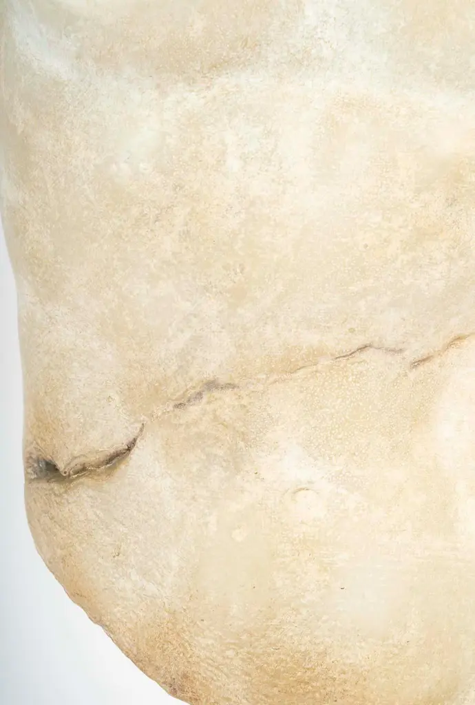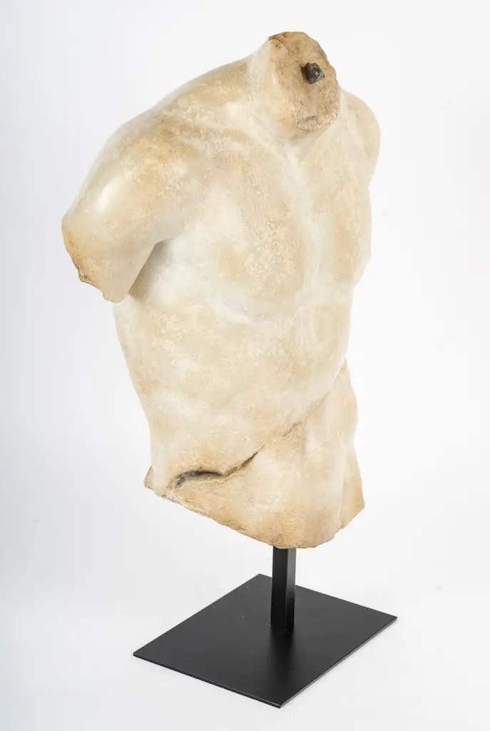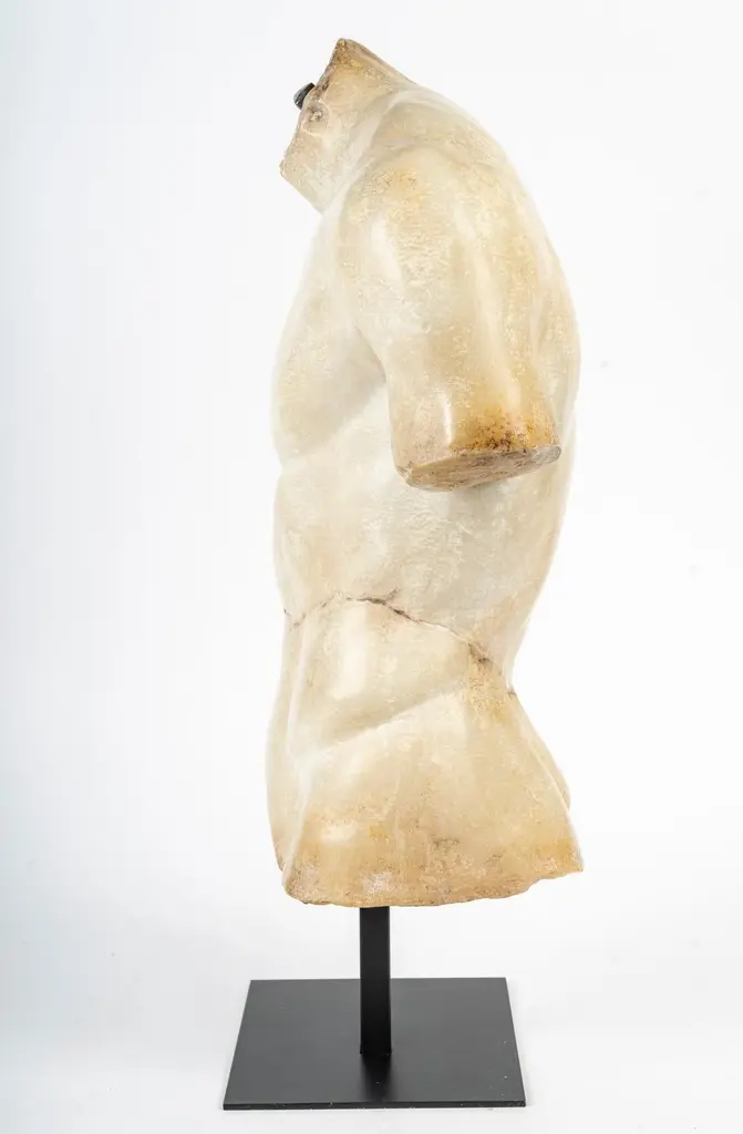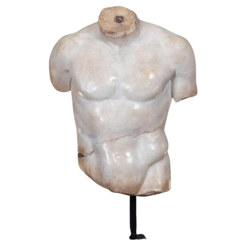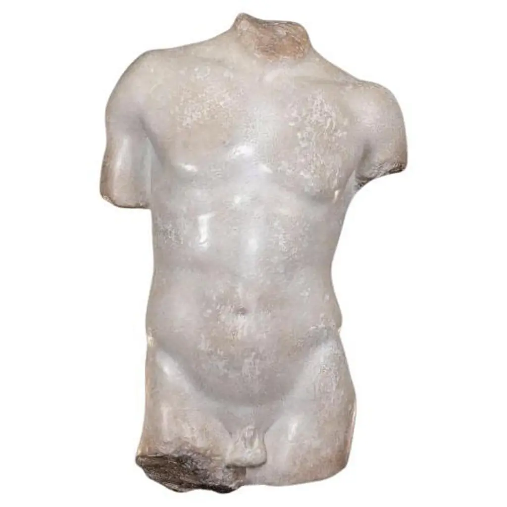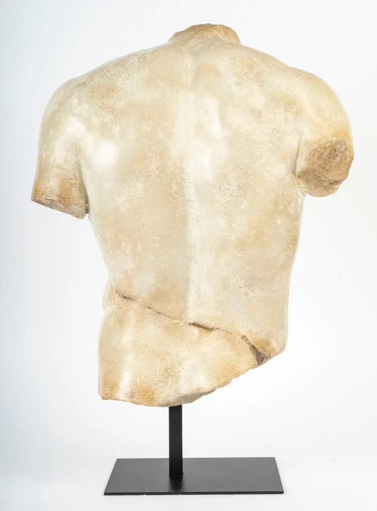 Medium-sized sculpture in the antique style, with a fine patina and white marble effect.This fragment of a discophore bust comes from the reproduction of an original bronze statue (now lost), created by the Greek sculptor Naucydes in the early 4th century BC, the reproduction of which is currently in the galleries of the Louvre Museum.Material: ResinH: 55 cm, W: 35 cm, D: 16 cmWeight: 7 kg