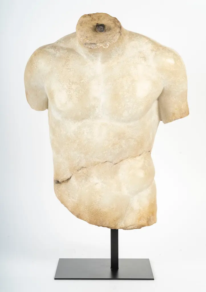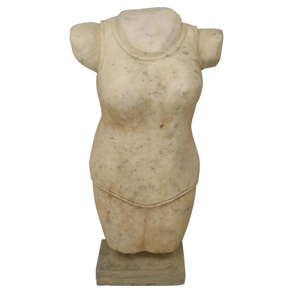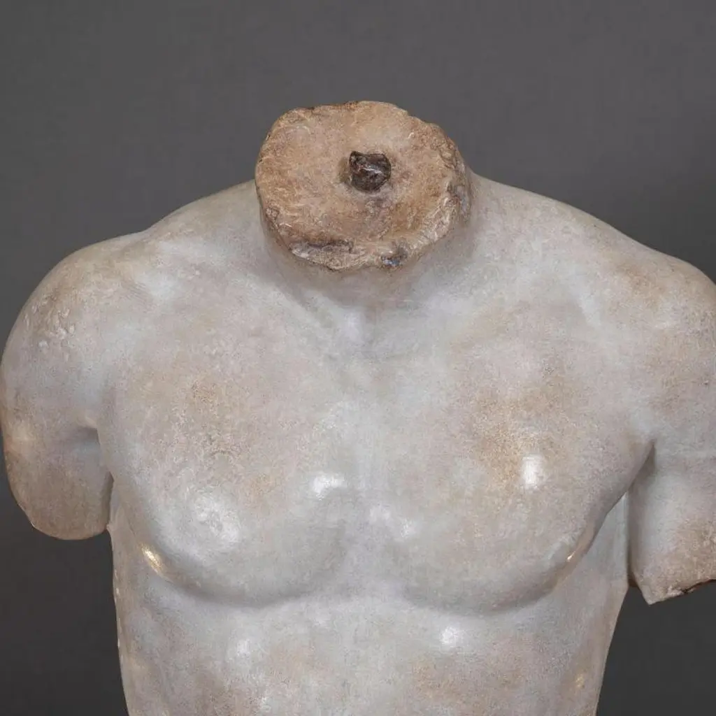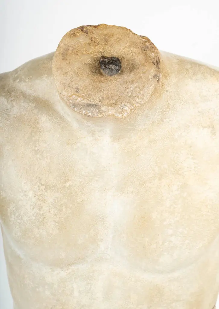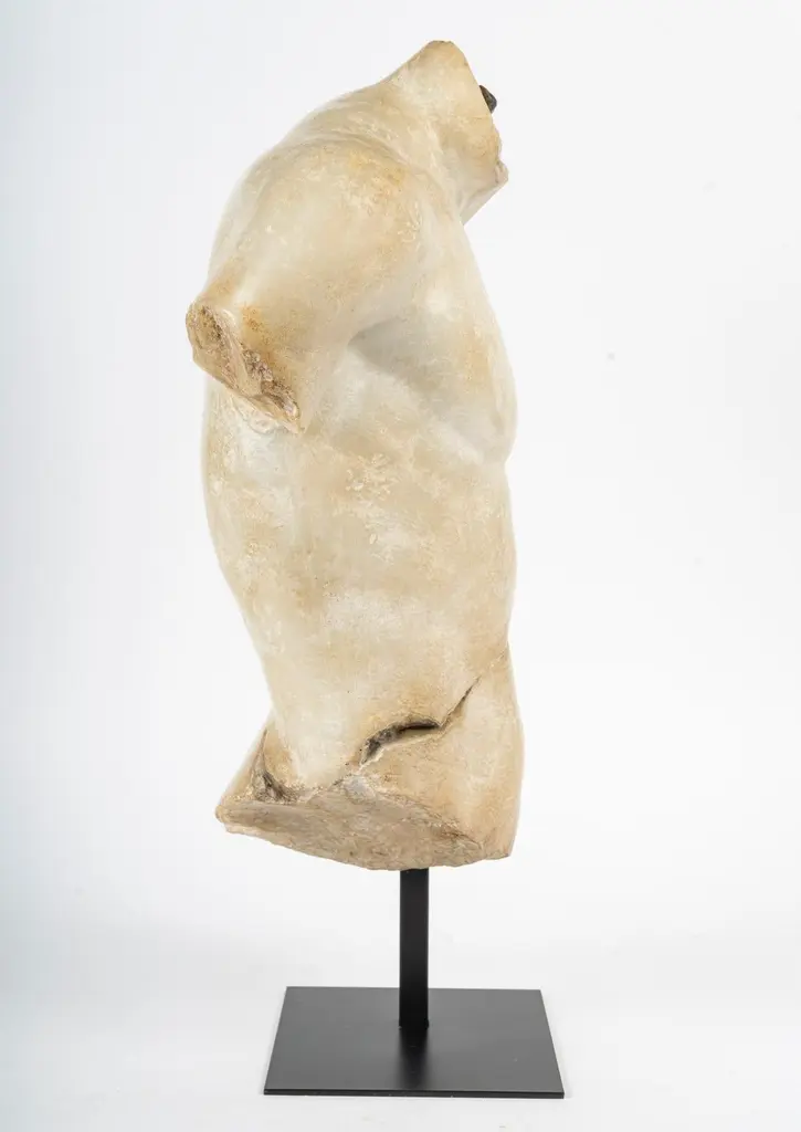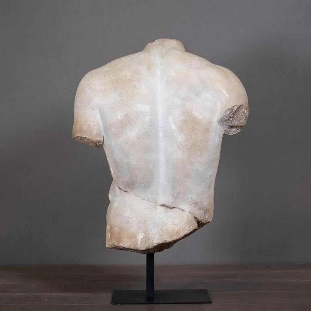 Medium-sized sculpture in the antique style, with a fine patina and white marble effect.This fragment of a discophore bust comes from the reproduction of an original bronze statue (now lost), created by the Greek sculptor Naucydes in the early 4th century BC, the reproduction of which is currently in the galleries of the Louvre Museum.Material: ResinH: 55 cm, W: 35 cm, D: 16 cmWeight: 7 kg