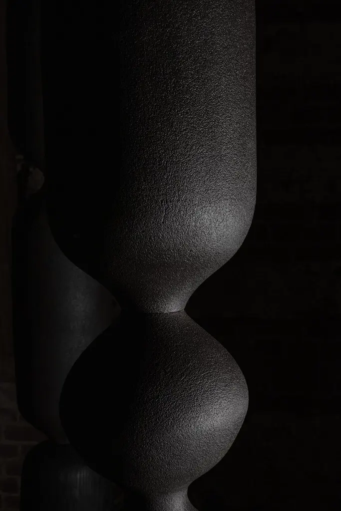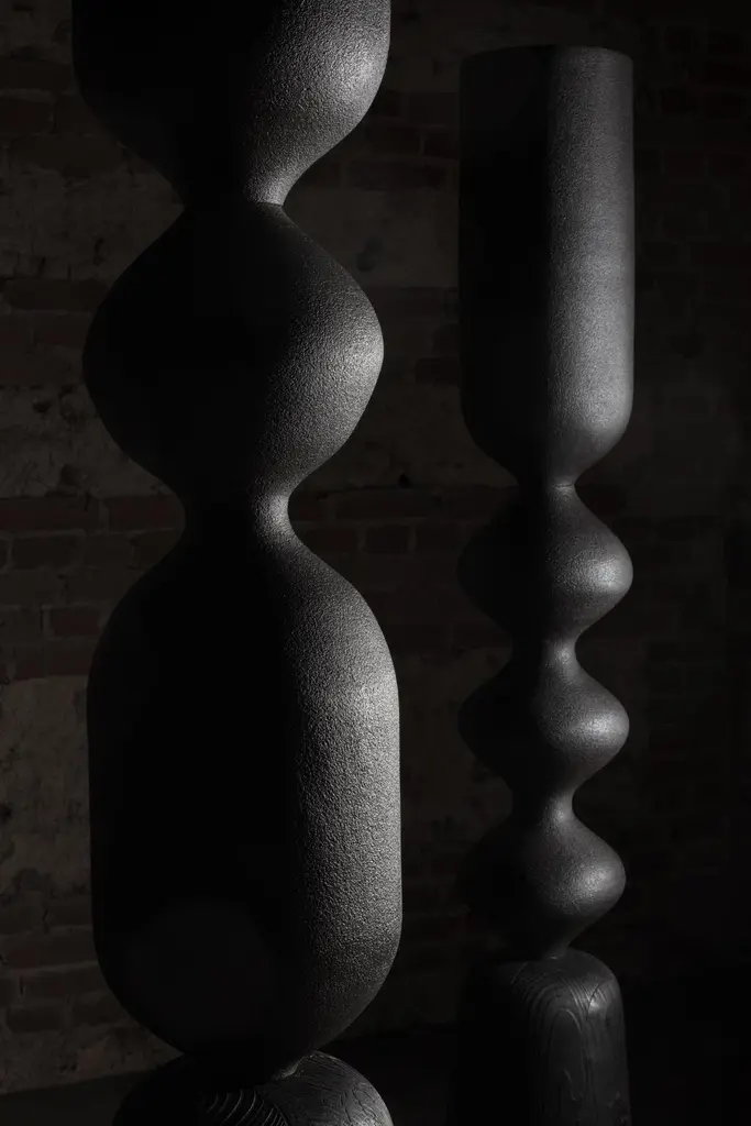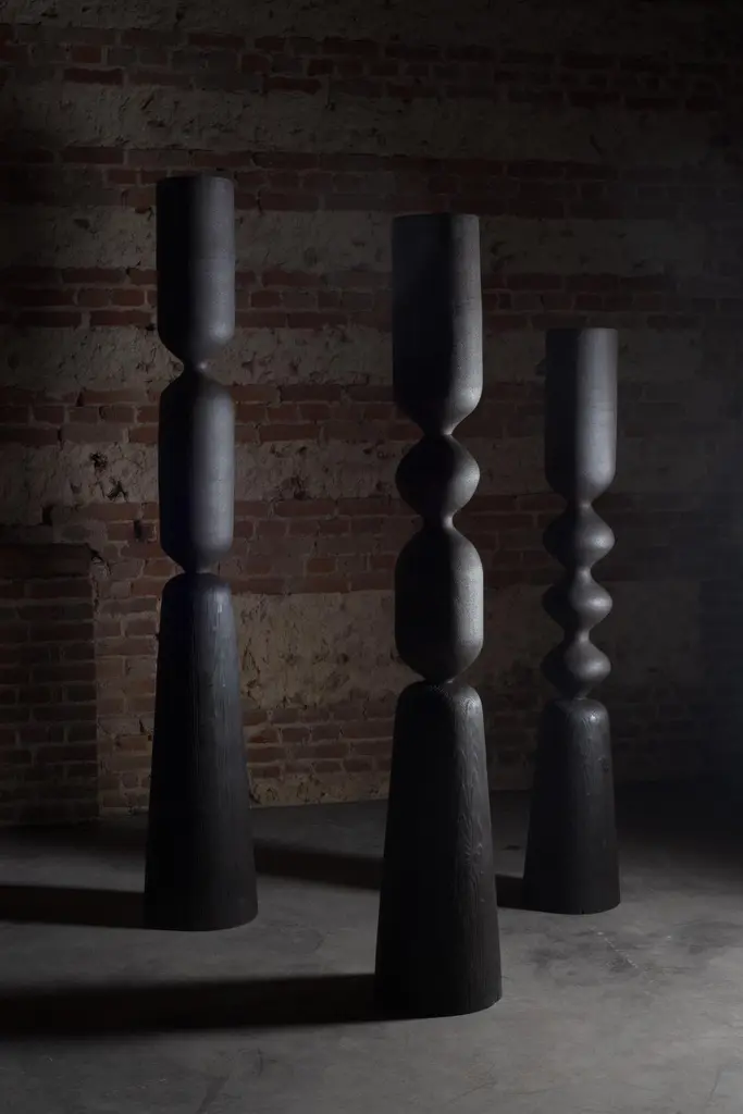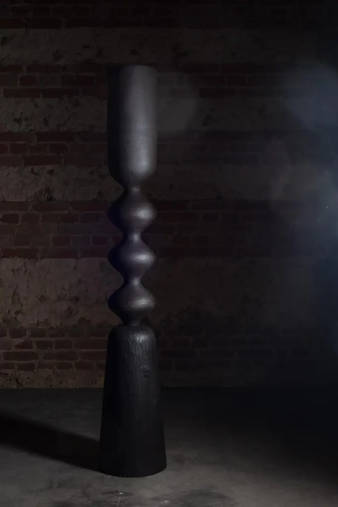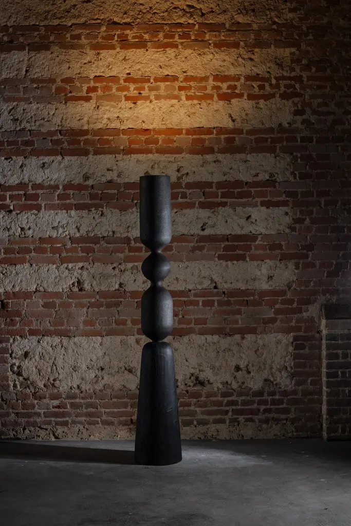 Medium Totem Carbon by Maxence De BagneuxDimensions: D 33 x H 200 cmMaterials: Stoneware, burnt laminated wood.Maxence de Bagneux has devoted his free time since childhood to his passion for learning and practicing the plastic arts and architecture. In 2001, after studying applied arts and obtaining a diploma in interior architecture at the Camondo School in Paris, he set off on a voyage of discovery to the heart of Asia's arts and crafts.Back in France and Normandy, where he was born, he decided to create what he calls "Useful Sculptures", in which they interact with the environment and showcase different skills. In this project, he combines stoneware and wood in a series of Totems that are both decorative and playful, with references to Brancusi and Sottsass, but also, and above all, constructions that can be modulated to order according to the viewer's wishes. Born under the "Mud Mud" label, the constituent elements can be combined via an augmented reality application before being physically assembled by the artist.Based on his anthropological work, his latest series is devoted to masks, pieces this time made entirely in chamotte stoneware and decorated with engobe, as much art as design. As always, for this somewhat iconoclastic creator, it's a question of working artistically on a basically functional object, in order to entertain it from its primary use and show it to us in a different light.