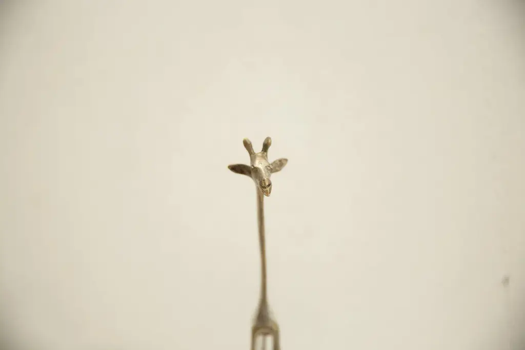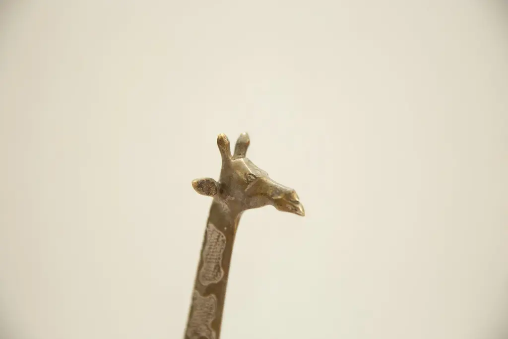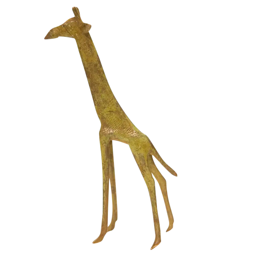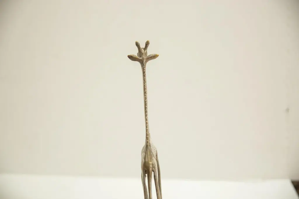 :: Vintage circa mid 20th century African bronze casting sculpture of a giraffe. Covered in a design mimicking the animals true print, this piece is unique and a great collectible.