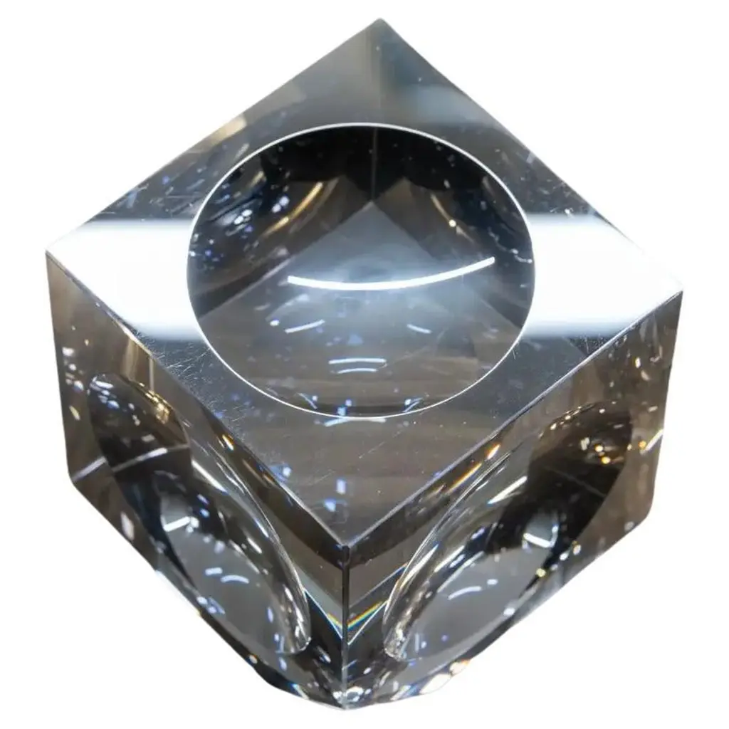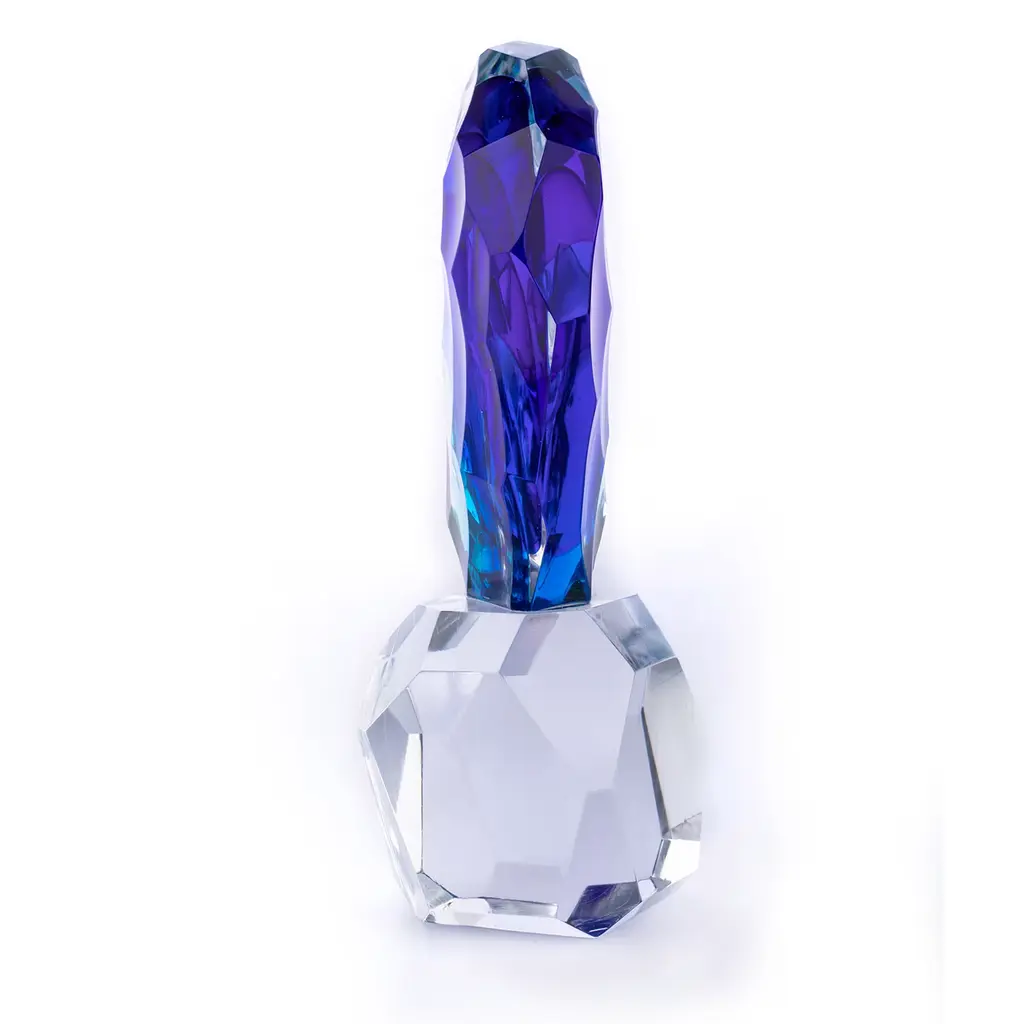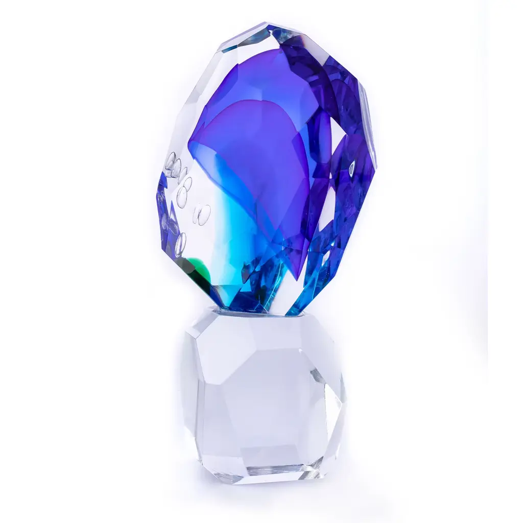 Painstakingly crafted by the expert hands of Venetian master glassmakers, this sculpture in Murano glass is distinguished by a bold yet ethereal silhouette comprised of two piled, rock-like volumes. The larger one incorporates a vibrant, blue-toned element reminiscent of a jellyfish ("medusa" in Italian), an effect achieved by combining deft blowing steps using the traditional "sommerso" technique.