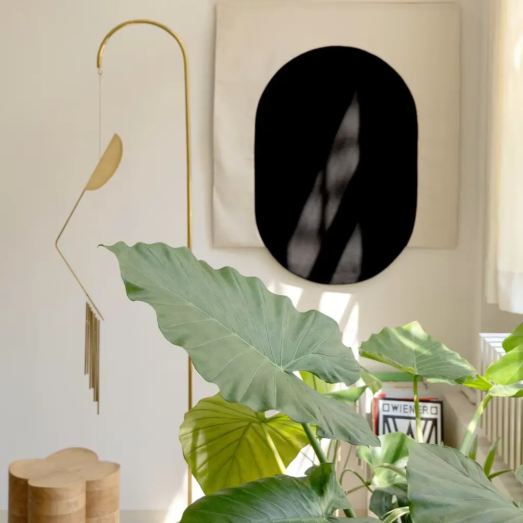 This piece has brass chimes that play celestial tunes when touched or swinged by air currents. Handmade in Italy with satin-finish solid brass and black marquina marble.