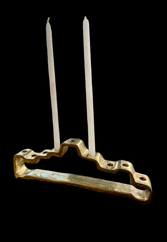The decorative Menorah was created by David Marshall, it is made of sand cast brass. Handmade, mounted and finished in our foundry and workshop in Spain from recycled materials.Certified authentic by the Artist David Marshall with his signature.We can engrave this piece with your Initials or Logo, makes a beautiful Wedding or Company Gift.The Artist is inspired by nature and land scape making functional art and sculptures out of recycled materials.We work with arquitects, interior designers and private clients to create specific designs, signage, staircases etc. for Homes, Hotels, Restaurants.Awards for Charity Foundations like Global Gift,Bespoke Awards for companies with engraved personal Logos, Golf Trophies for Golf Clubs like Finca Cortesin where the important Solheim Cup 2023 took place.One of the qualities of any sculpture and decorative design lies in the ability to bring its surrounding space into order.With more than 50 Years since his first exhibition in Spain, David Marshall has shown his highly individual work throughout Europe and United States.“ After all this years since my first show I am still fascinated by working in3 dimensions – maybe because I cant draw or more likely because sculpture holds some obtuse subconscious obligation. It is still addictive and highly satisfying despite the onus of molding, casting, welding, polishing, fitting in a tough work environment before the final satisfaction of seeing the piece come together as envisaged.Living in the mountains provides the creative impetus, being surrounded by rocks, rivers, the detritus of erosion, geomorphology and all natures destructive force has inspired an eclectic, very personal and organic bias to my work – an appreciation of random forms, diverse textures and all the unexpected creativity of the natural world where no line is perfect.”Metal , Abstract, Gold, Modern, Contemporary,
