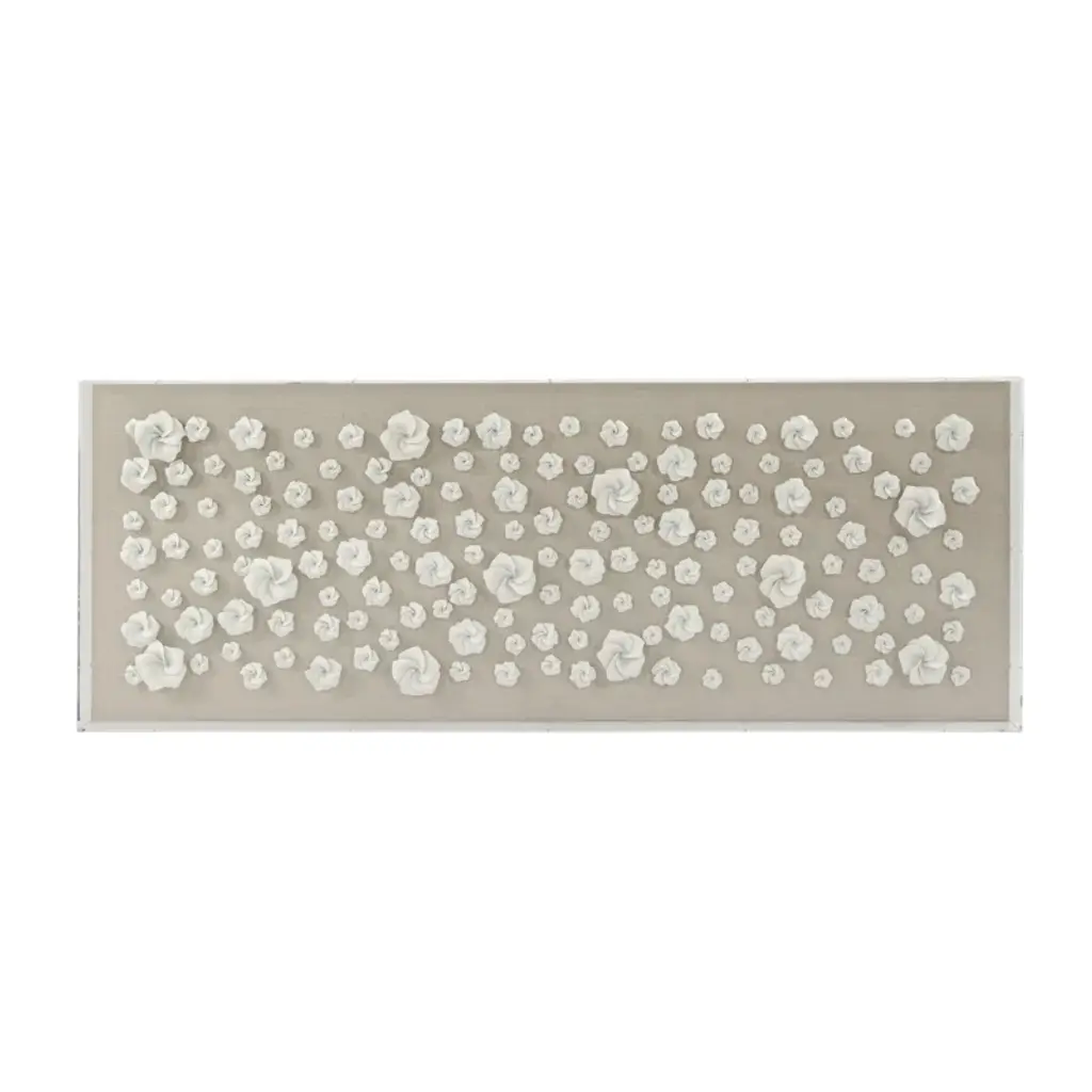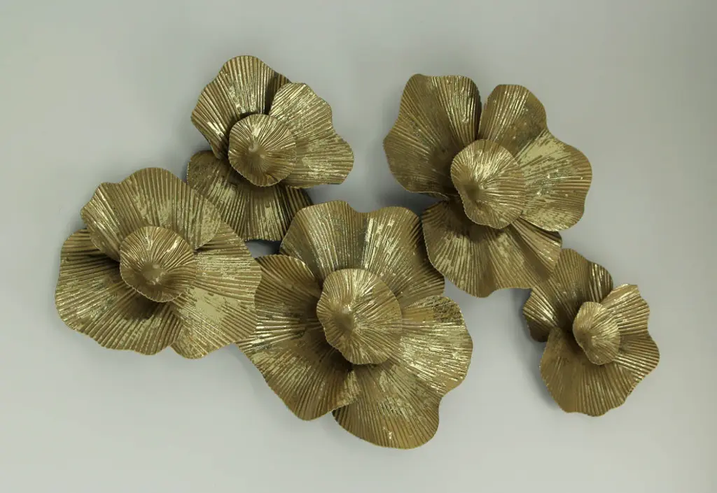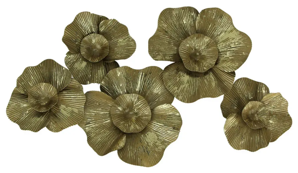 26.5 inch Long, 14.75 inch High, 2.5 inch WideCreatively Crafted of Metal Flowers with a Ribbed Texture Attached to a Metal Wire FrameFeatures a Beautifully Distressed Finish that Gives it a Wonderfully Weathered Appearance3 Built-In Ring Loop Hangers Let You Effortlessly Attach it the Wall in Any PositionAdds a Fun Flourish and a Simply Elegant Burst of Floral Excitement to Any RoomReminiscent of flowers you might find in exotic gardens, this uniquely beautiful piece of wall art will have any room blooming with garden beauty. Artistically crafted of metal, it features 5 undulating flower medallions attached to a metal wire frame with 3 built-in ring loop hangers that let you attach it to the wall in any position. Between the abstract shape and the wonderfully weathered metallic gold finish, these eye-catching works of art are nothing less than stunning. From retro to modern styles, this 26.5 inch long, 14.75 inch high, 2.5 inch wide flower art wall sculpture is perfect for anyone with an eye for the unusual and a modern sense of style.