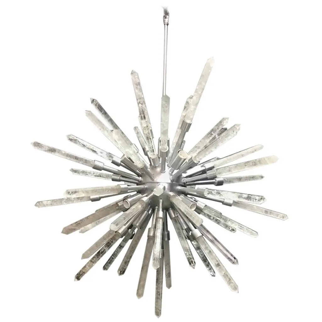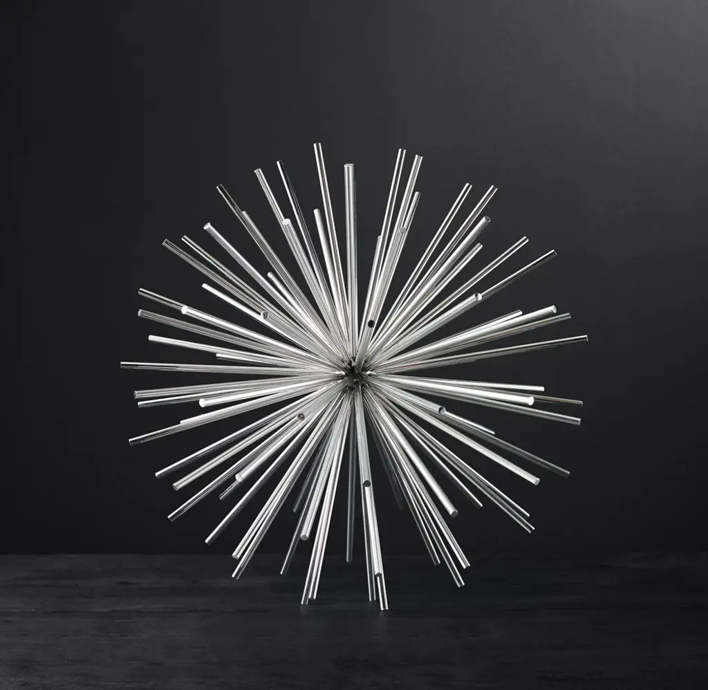 Exuberant and radiant, our metallic sculpture glimmers like an earthbound star. Crafted by hand from dozens of metal rods, its flat tips refract the form with light.