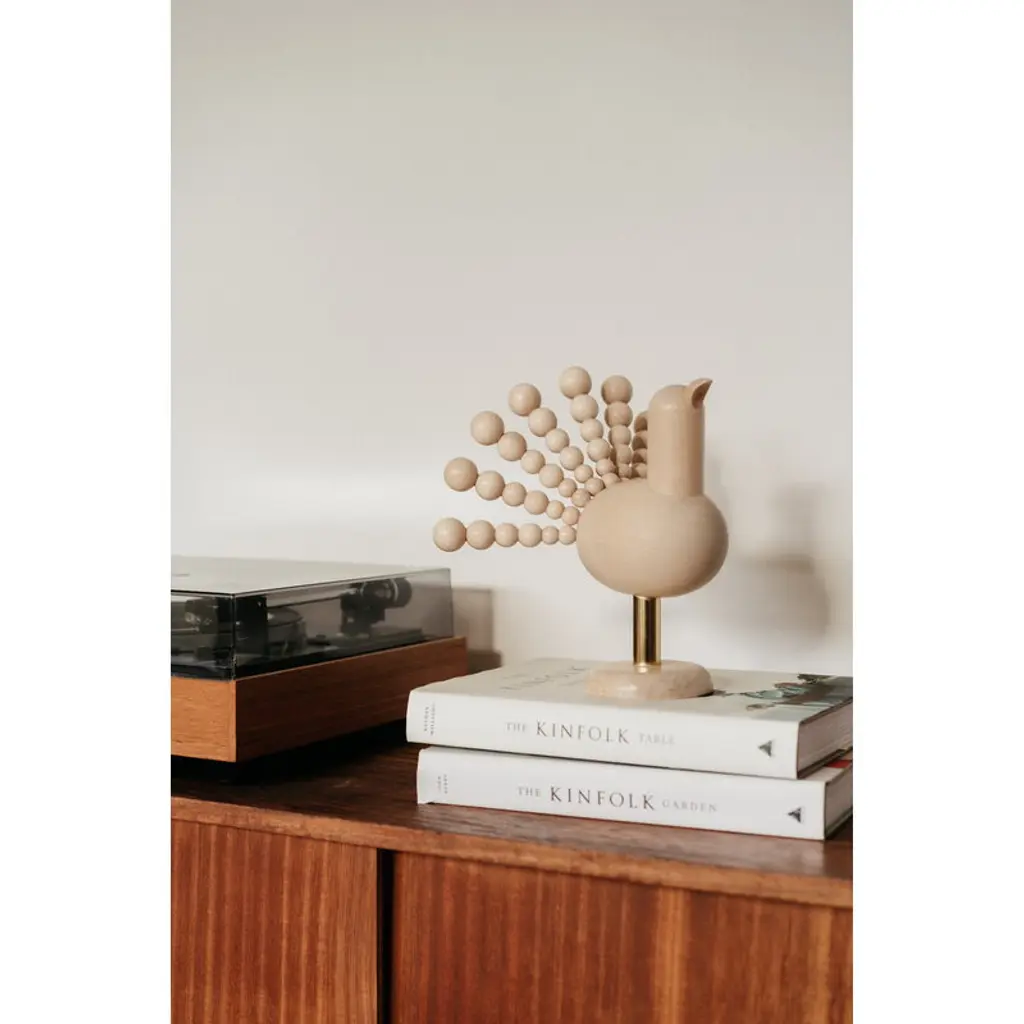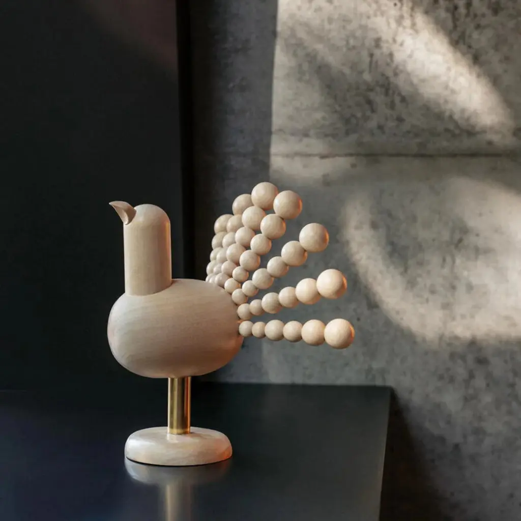 Aarikka's Metso sculpture is Kaija Aarikka's interpretation of the western capercaillie, the largest existing grouse species. Originally released in 1966, Metso has been reintroduced with an updated design and materials. Proudly standing on a brass leg, the wooden bird is made from light-colored maple and birch. The fan-like tail is composed of Aarikka's signature wooden balls. This wooden capercaillie makes a memorable gift or decorative piece that brings joy for decades to come. Each Metso sculpture is handcrafted in Finland.