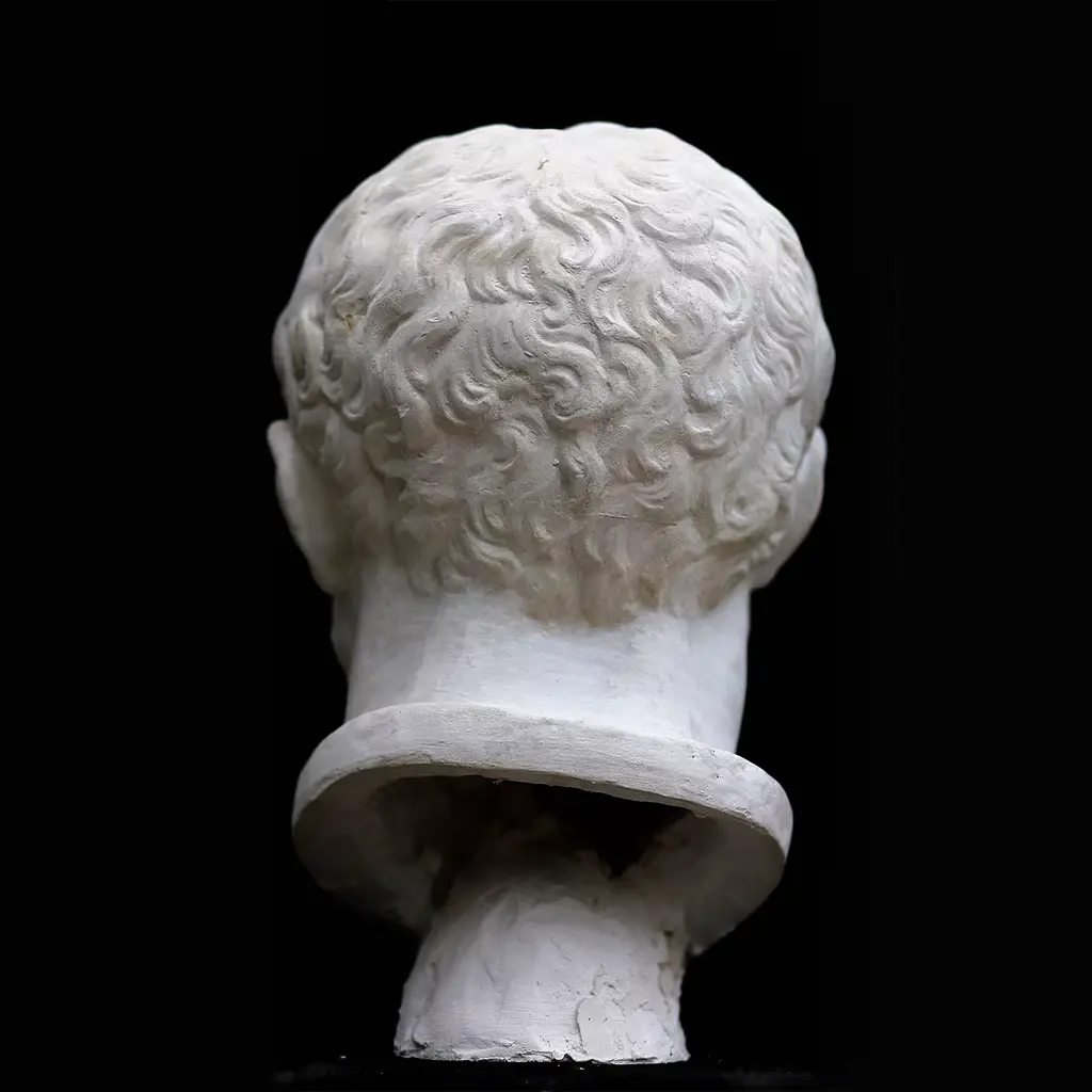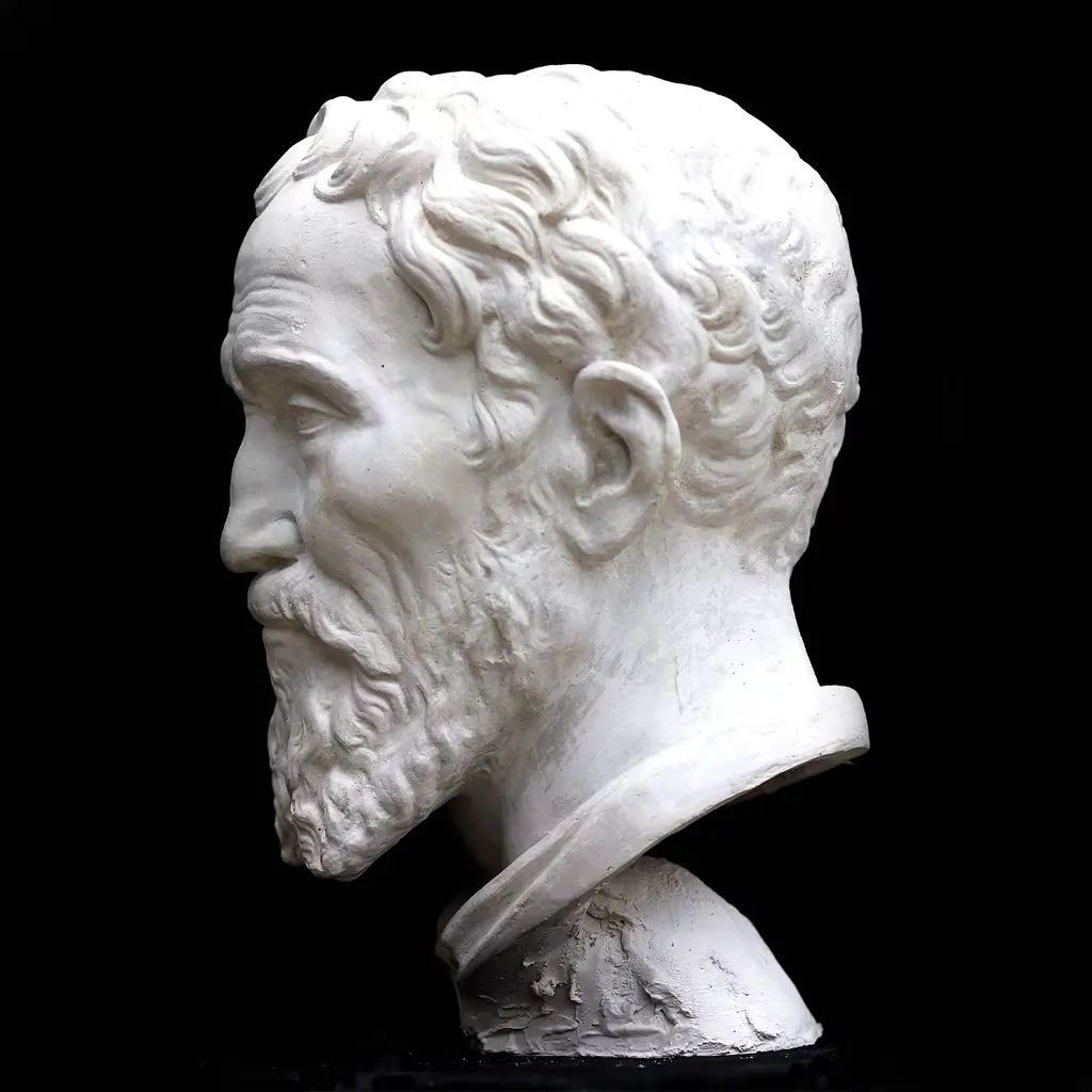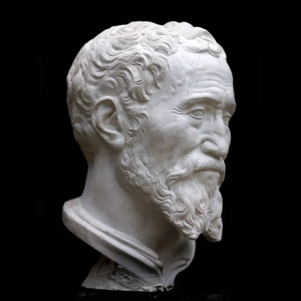 Handcrafted by the artists of the Romanelli workshop, this stupendous bust is entirely fashioned of gypsum. A veritable work of art, it is a reproduction of Michelangelo's visage, originally made by Daniele da Volterra (1509-1566) commissioned by Leonardo Buonarroti and today exhibited at the Galleria dell'Accademia of Florence. It depicts the visage of an old Michelangelo, deep eyes brimming with wisdom of a long life.