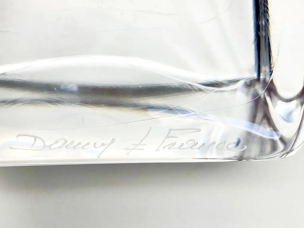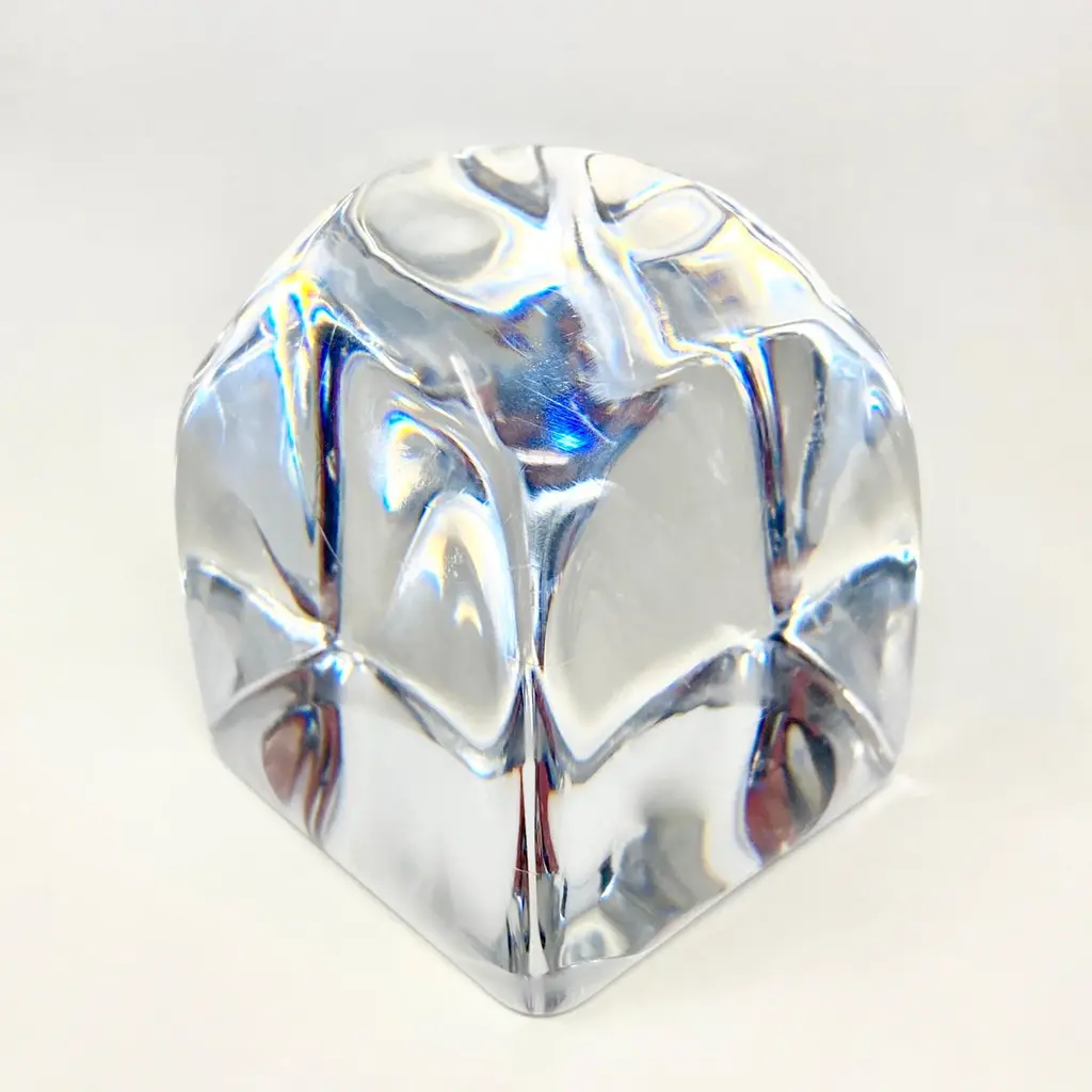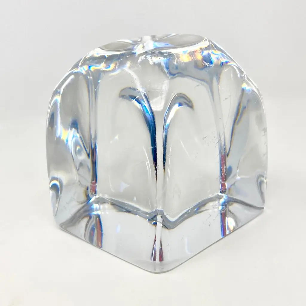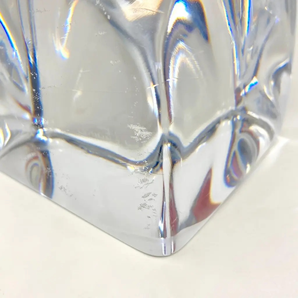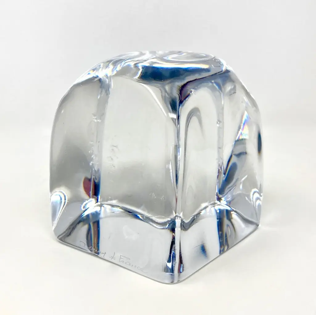 A magnificent, crystal desktop paperweight by renowned French crystal maker Daum. This is a unique, hand-made piece in transparent crystal, engraved on the bottom edge with the recognizable acid-etched "Daum France" maker's mark (see photo). There is a Cross of Lorraine in between the two words which indicates that this is an early piece. This particular paperweight has an irregular, rectangular shape with rounded corners. This kind of more-or-less abstract shaped paperweights date from around the 1950s. With an impressive clarity and a weight of 1.6 kg/3.5 lb it does not only fulfill its' paperweight function but it is also highly decorative. Daum is one of France's most prominent crystal studios. It was founded in 1878 in Nancy by Jean Daum. It is one of the only crystal manufacturers to employ the pâte de verre (glass paste) process for art glass and crystal sculptures,In fair vintage condition. The paperweight has visible scratches and dents on one of the corners (see photos). Otherwise in overall good condition: scratches consistent with age and use (see photos). Dimensions: height 9 cm/ 3 1/2", length 8 cm/ 3 1/4", depth 8 cm/ 3 1/4". Weight: 1577 g/ 3.48 lb