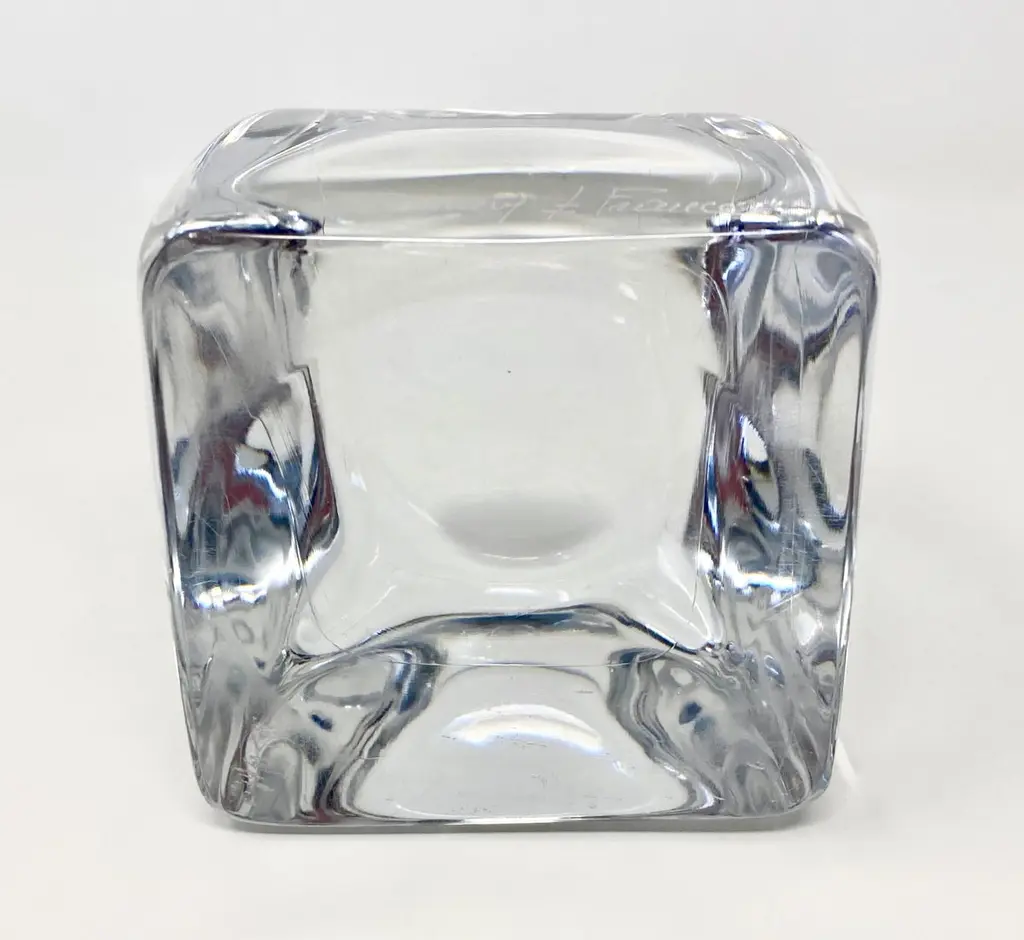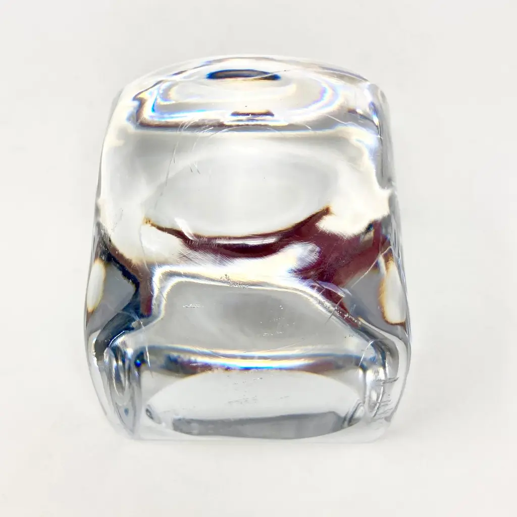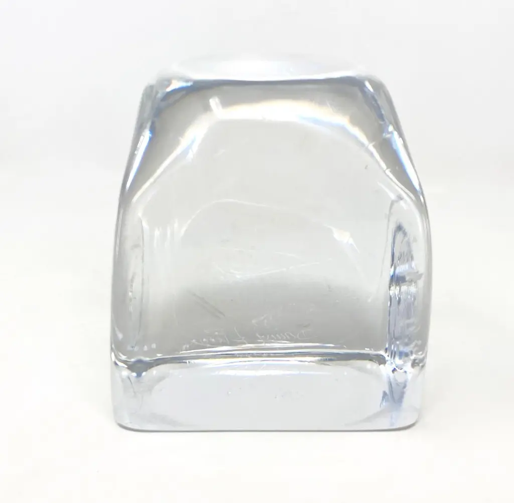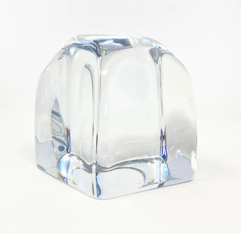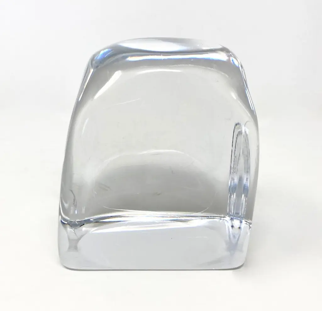 A magnificent, crystal desktop paperweight by renowned French crystal maker Daum. This is a unique, hand-made piece in transparent crystal, engraved on the bottom edge with the recognizable acid-etched "Daum France" maker's mark (see photo). There is a Cross of Lorraine in between the two words which indicates that this is an early piece. This particular paperweight has an irregular, rectangular shape with rounded corners. This kind of more-or-less abstract shaped paperweights date from around the 1950s. With an impressive clarity and a weight of 1.6 kg/3.5 lb it does not only fulfill its' paperweight function but it is also highly decorative. Daum is one of France's most prominent crystal studios. It was founded in 1878 in Nancy by Jean Daum. It is one of the only crystal manufacturers to employ the pâte de verre (glass paste) process for art glass and crystal sculptures,In fair vintage condition. The paperweight has visible scratches and dents on one of the corners (see photos). Otherwise in overall good condition: scratches consistent with age and use (see photos). Dimensions: height 9 cm/ 3 1/2", length 8 cm/ 3 1/4", depth 8 cm/ 3 1/4". Weight: 1577 g/ 3.48 lb