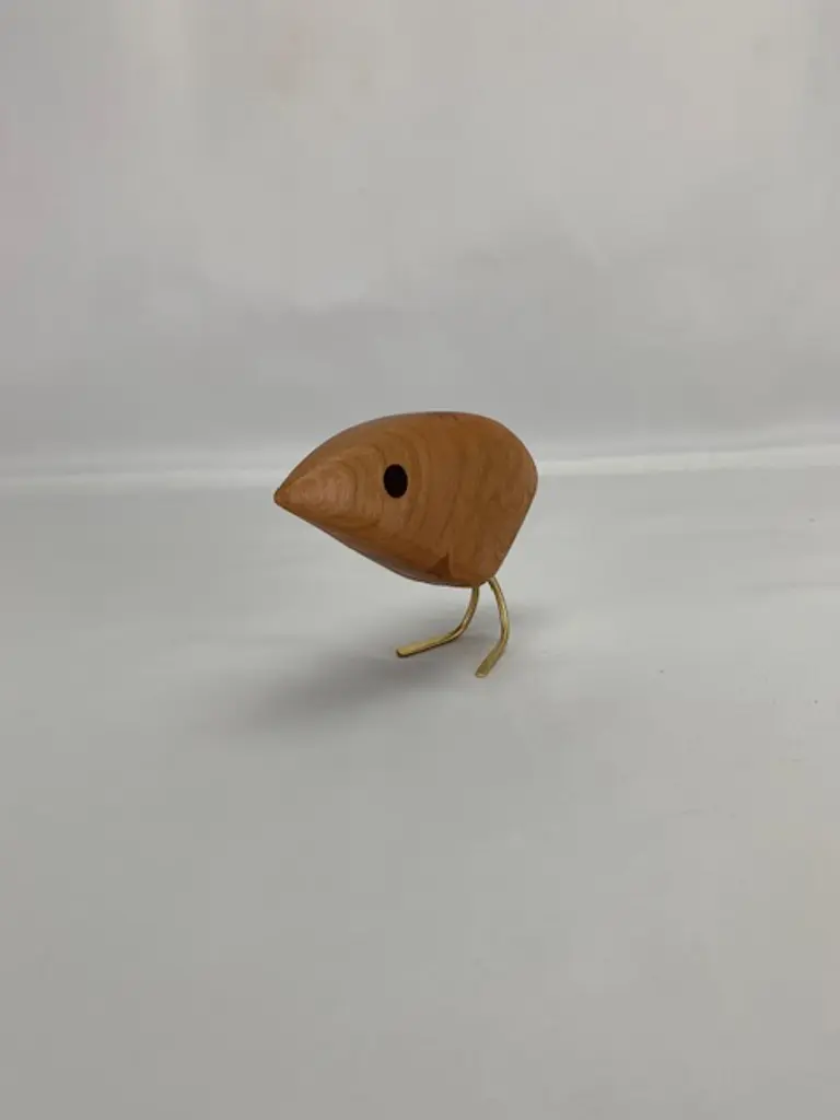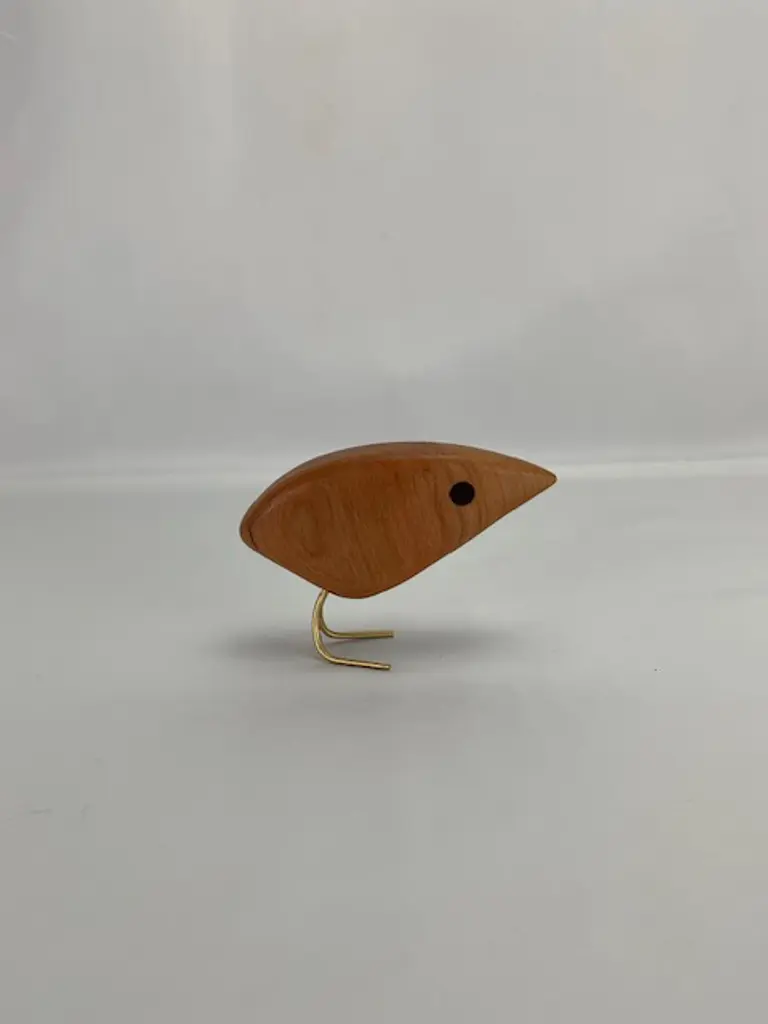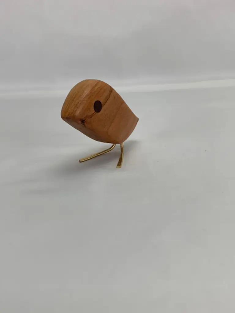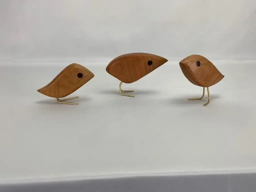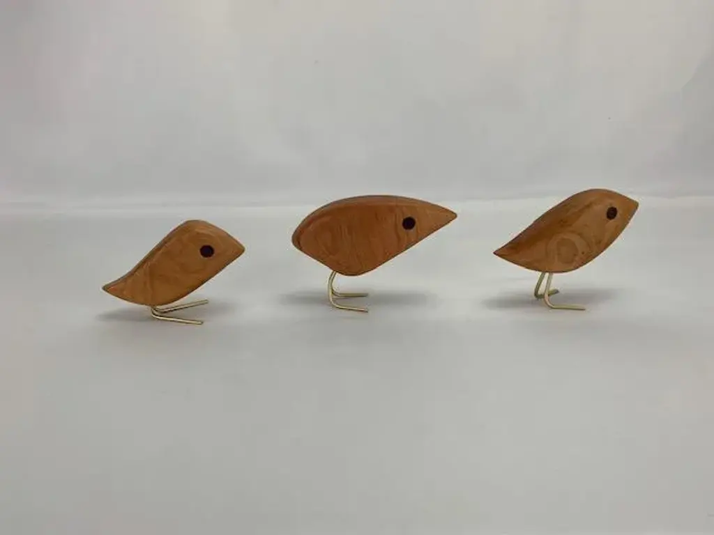 Mid Century Modern style "Trio of Birds" inspired by the wooden birds of Danish designer Jacob Hermann. The birds bodies are sculpted from Cherry hardwood, the eyes are inlaid Walnut and the feet are solid brass. Each bird has been sanded to a very fine finish and sealed with Danish oil. Creation Year: Made To Order - Please allow 7 days to process before shipping Medium: Cherry, Walnut, Brass Style: Folk art & Mid-Century Modern/ Danish, Coastal Grandmother Dimensions: The Tallest Bird is 2 1/2" tall The Widest Bird is 4" long from tip to tail The Bird Bodies are approximately 3/4" thick, the feet are spread slightly wider. Please refer to the listing photos for an idea of "Bird" dimensions. Milwerk Sculptures are inspired by the style of Mid-Century Modern Danish designers like Jacob Hermann and Svend Aage Holm‑Sørensen and American Mid-Century designers Charles and Ray Eames. In many pieces, the grain determines the subject and shape of the sculpture bolstering the organic quality of the wood. Each piece is an original, cut and shaped by hand. Each sculpture is signed (engraved) MILWERK with the year of manufacture. Thanks for checking out our shop. You obviously have great taste!