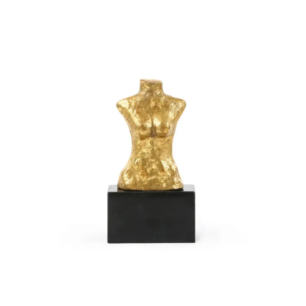 A monumental celebration of the human form. Like the sculptures of ancient Greece and Rome, the Milo Statue brings romantic spirit to the classical figure study. In both name and design, the bust is an homage to the iconic Venus de Milo, with a mix of materials that give it an archeological allure. Expertly cast in iron, it’s topped with an elemental finish of textured gold leaf, spotlighted atop a black marble pedestal that nods to the craftsmanship of its namesake. Rooted in art history, the Milo serves as a sophisticated and striking conversation piece for the home or office.