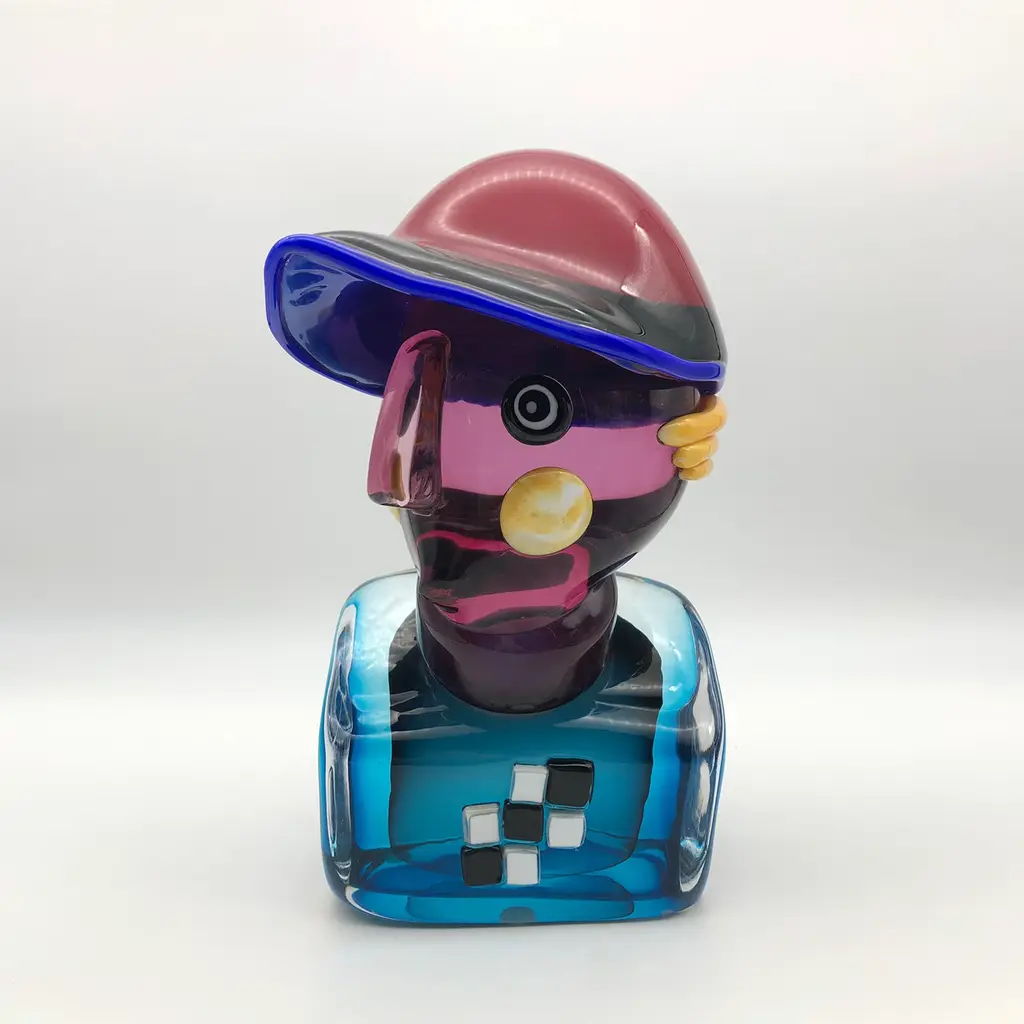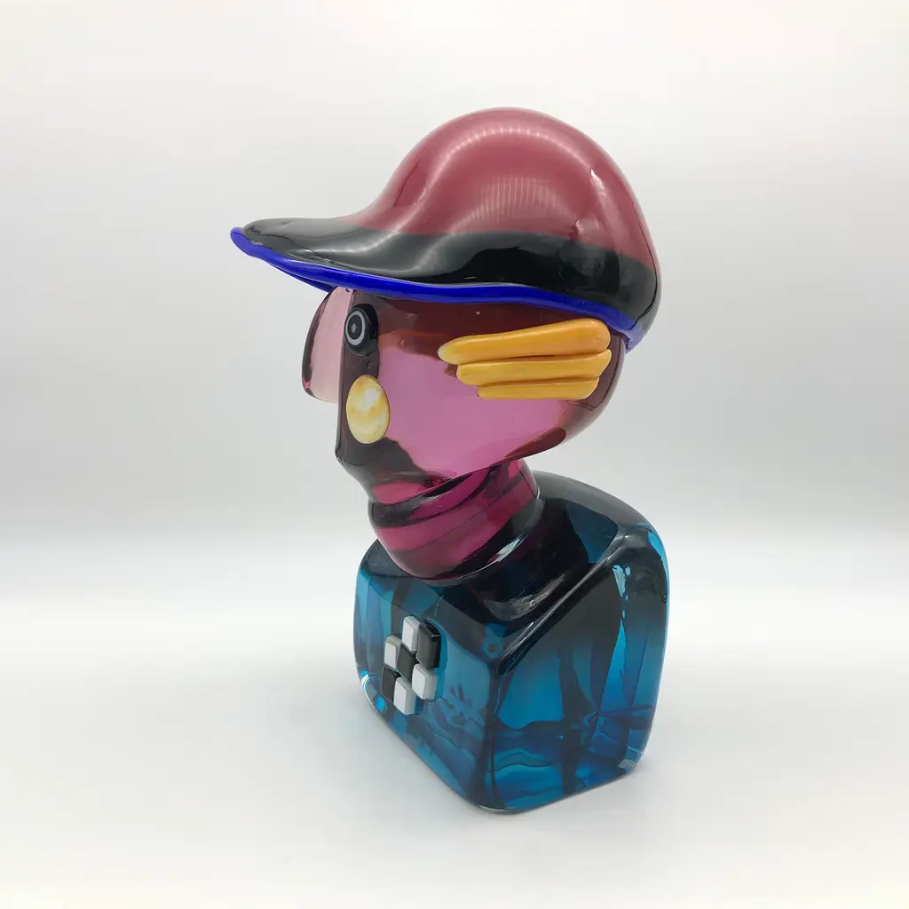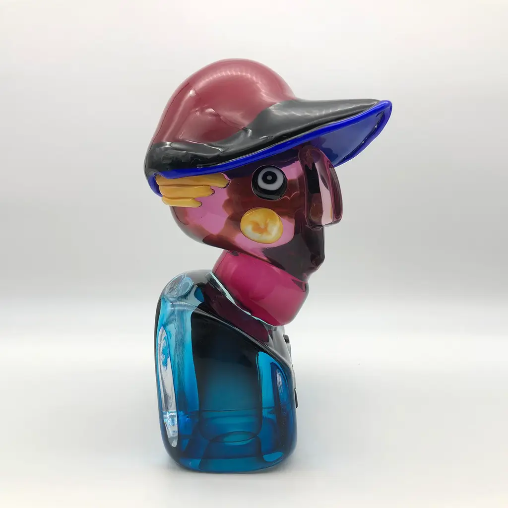 A playful and stylish objet d'art that will effortlessly adorn any modern or eclectic interior with its extravagant flair, this sculpture is the result of the precious collaboration between Cuban artist Alfredo Sosabravo and Ars Murano's expert glassblower Toso Cristiano. Entirely fashioned of colored glass, it depicts a young man donning a blue and red cap.