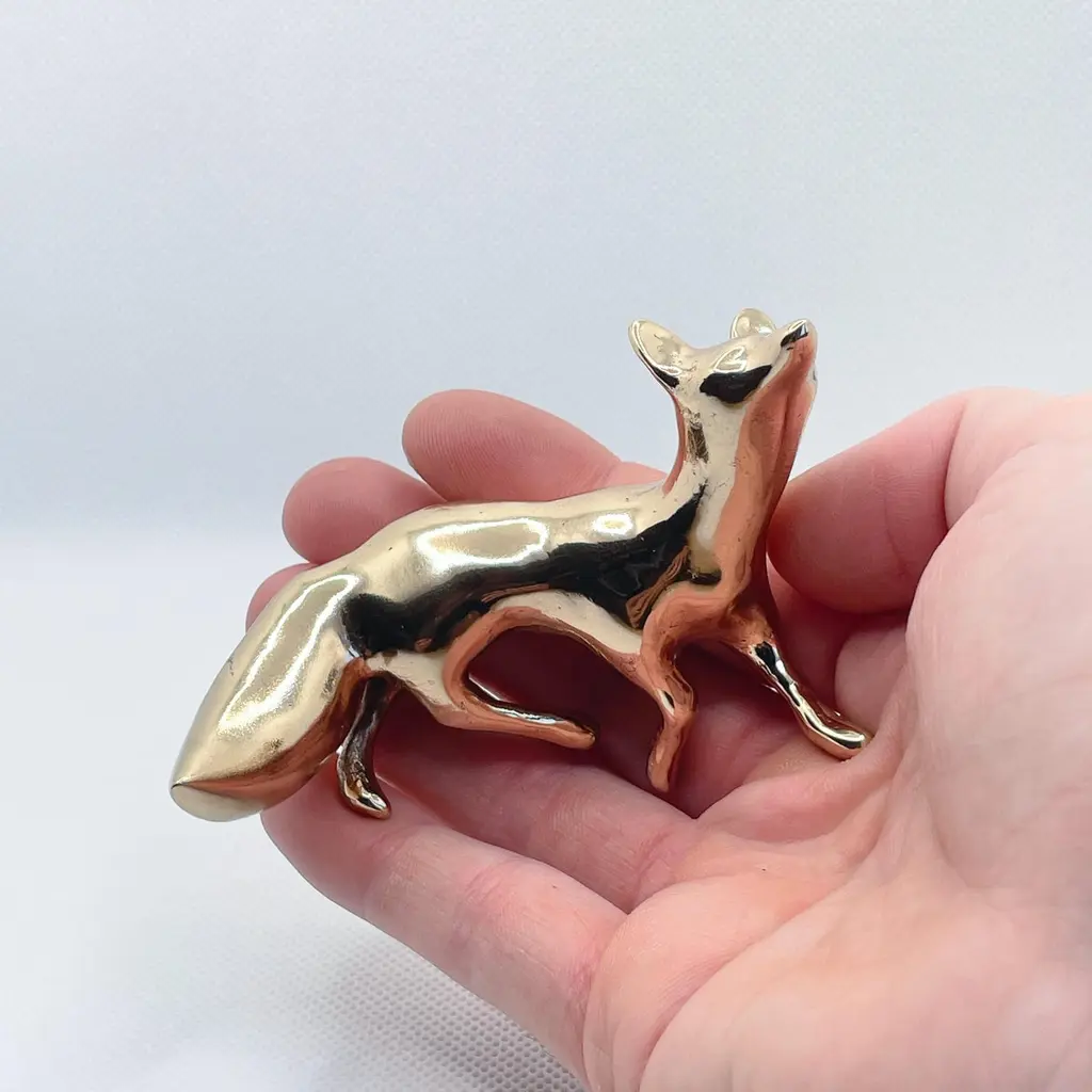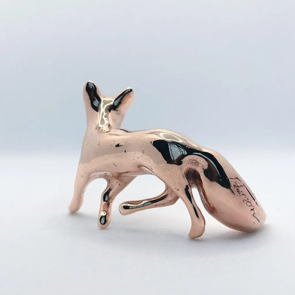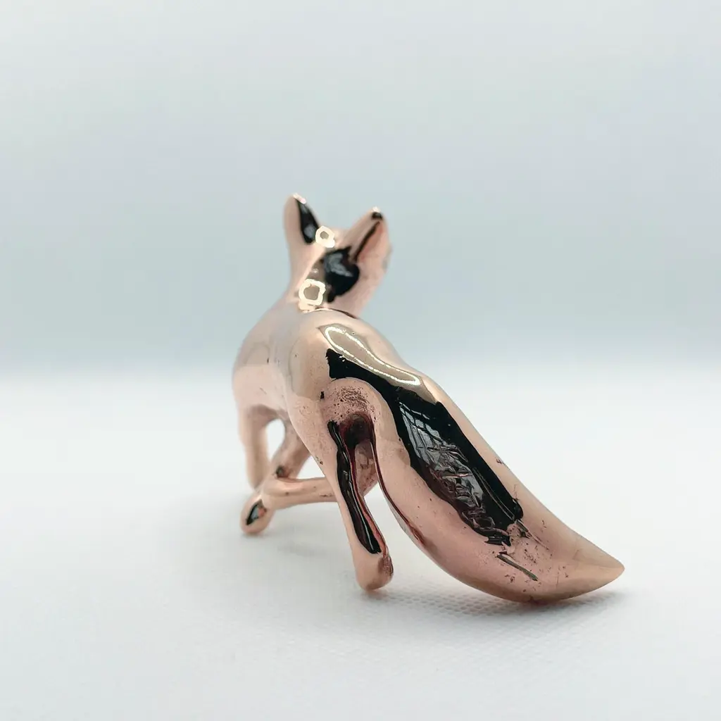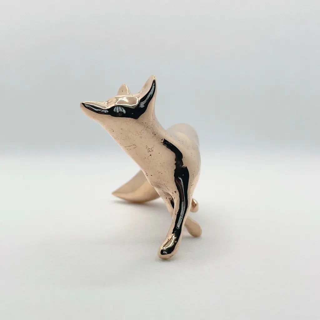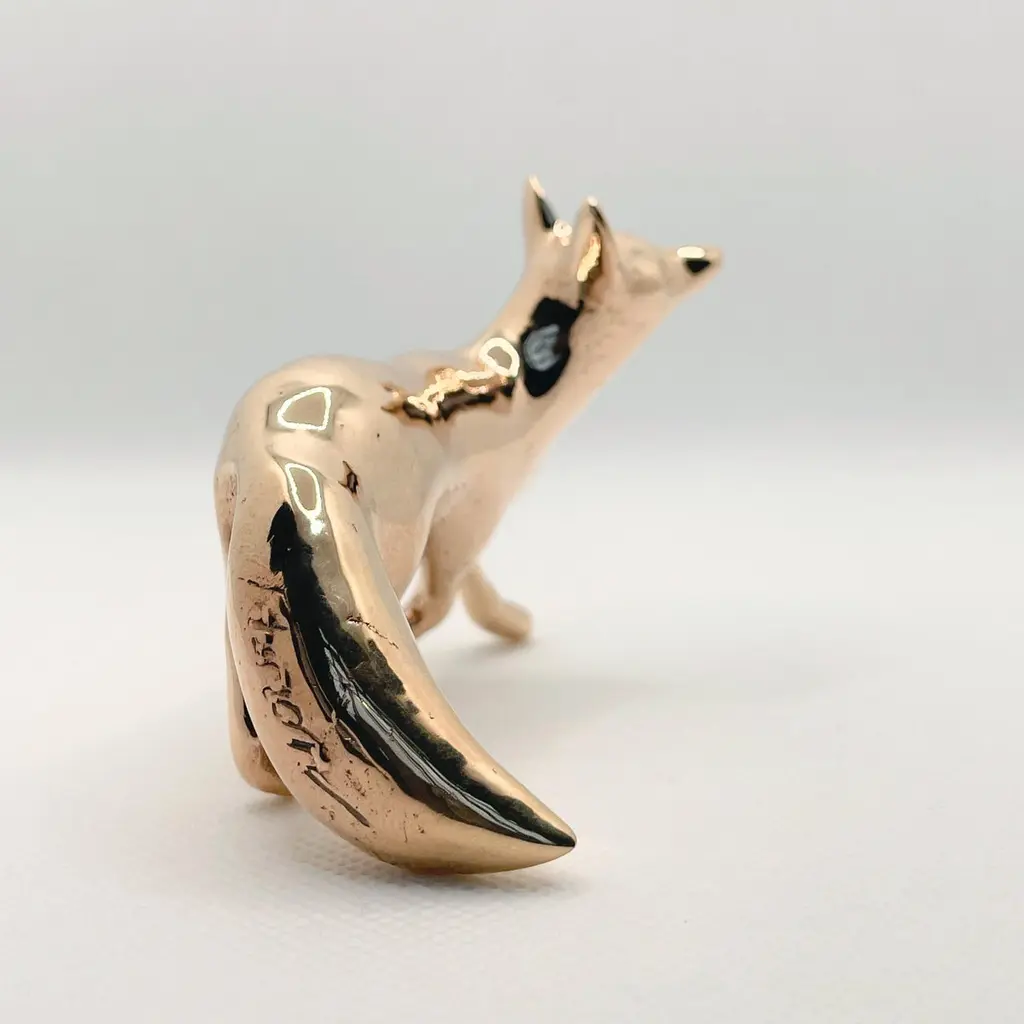 Polished bronze hand cast miniature fox sculpture by artist Javier de la Rosa.Javier De la Rosa has created a series of bronze cast miniature sculptures that celebrate animals and the beauty of the everyday. Each of these exquisite solid bronze pieces are handmade individually with incredible skill and detail by the artist using the lost-wax technique and polished by hand with the utmost care.Dimensions: 7.5cm H x 5cm W x 5cm D / 2.95in H x 1.97in W x 1.97in Materials: hand polished bronze.Please note that any shadows appearing on the sculpture's surface are the due to reflections. This piece is made of polished solid bronze only.ABOUT THE ARTIST AND THE PROCESSJavier de la Rosa (b. 1984, Madrid, lives and works in London, UK) graduated from the Faculty of Fine Arts at the Complutense University of Madrid (2007). De la Rosa explores the passing of time and the pulse of life through the study of both human and animal natures.De la Rosa’s skilled sculptures stand out for their ability to convey emotions through bronze, crafted using the lost-wax technique and polished by hand with the utmost care. Every curve and surface not only reflects the form of the animal but also the artist’s sensitivity in capturing the essence of life.The delicacy in the modelling of the bronze captures the softness of the lines and envelops the volume in a subtle manner, evoking an immediate connection with the viewer. With this sculpture, Javier de la Rosa succeeds in transforming an everyday object into a work of art that invites for reflection and visual enjoyment.Javier de la Rosa's works have been acquired by prestigious collections such as the Antonio Gala Foundation, the Rodríguez-Acosta Foundation, Jacinto Higueras Museum and the Valdepeñas Museum, among others.Note that prices on the website do not include local taxes and/or applicable import duties for deliveries outside of the United Kingdom.ORDERS OF MULTIPLE ITEMS OF THE SAME TYPE: Please contact us to receive a Packing and Shipping quote when ordering multiple mirrors of the same type. An order for multiple mirrors of the same type may not be accepted without extra packing and shipping fees. Thank you.