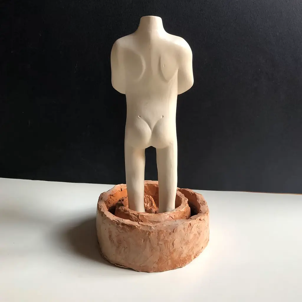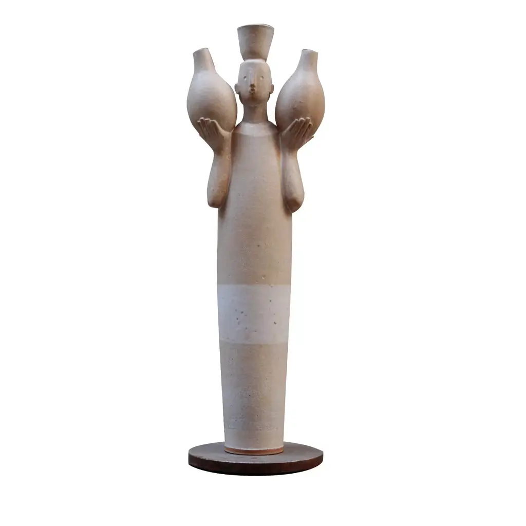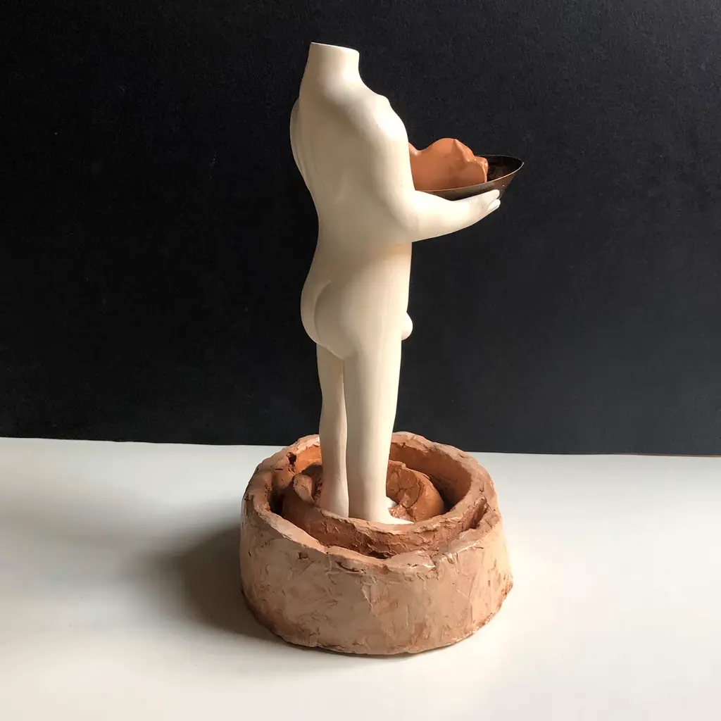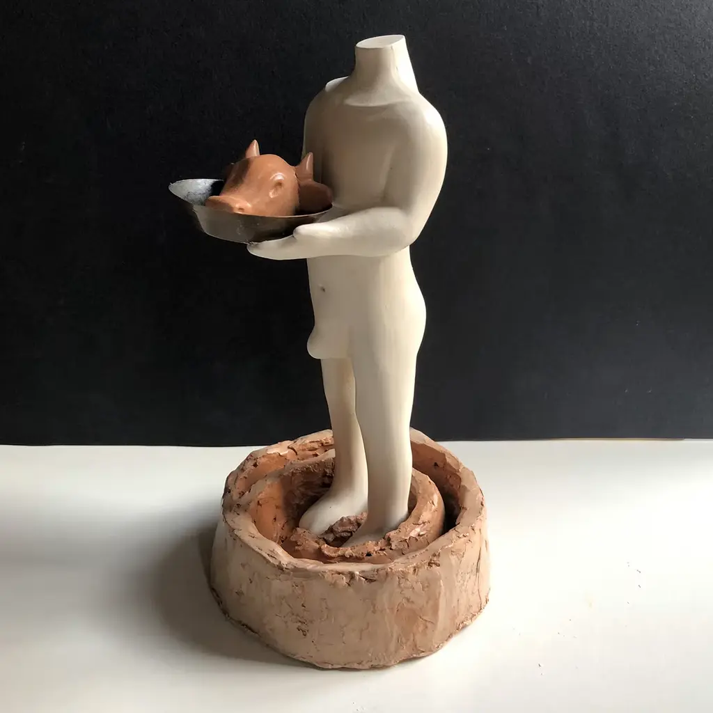 Consistent with the J.L. Borges' interpretation in his "The House of Asterion", this splendid ceramic statuette depicts the half-man, half-bull Minotaur from the Greek myth as a victim the moment he offers his head in a copper bowl while still stuck in the labyrinth to his executioner, Theseus. The bull's head and the labyrinth are crafted of green clay which turns red after the firing, while the human body is in ivory earthenware.