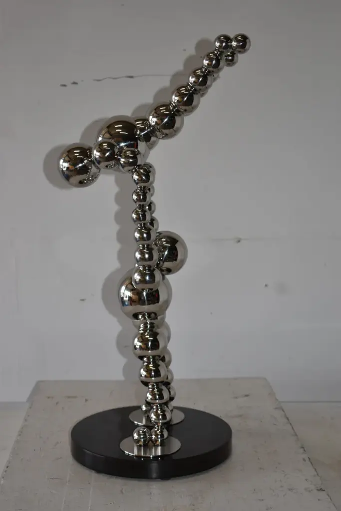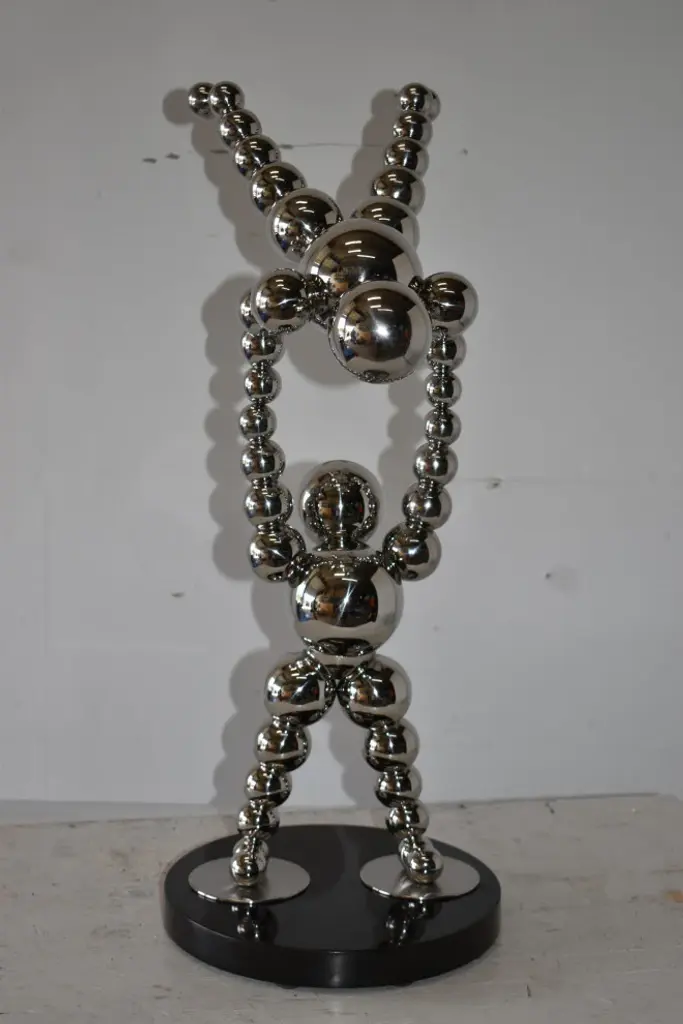 Decorate your home with this beautiful, tabletop, modern looking, stainless-steel abstract of Acrobat Couple in Action. These decorative abstracts made of Stainless-steel balls will become an extraordinary focal point to any kitchen, Livingroom, or patio! We sell a whole line of this style of modern art. You can be sure they will be a conversation starter and the topic of much appraised comments in your home. Size: 12"L x 14"W x 27"H. Weight is: 14Lb