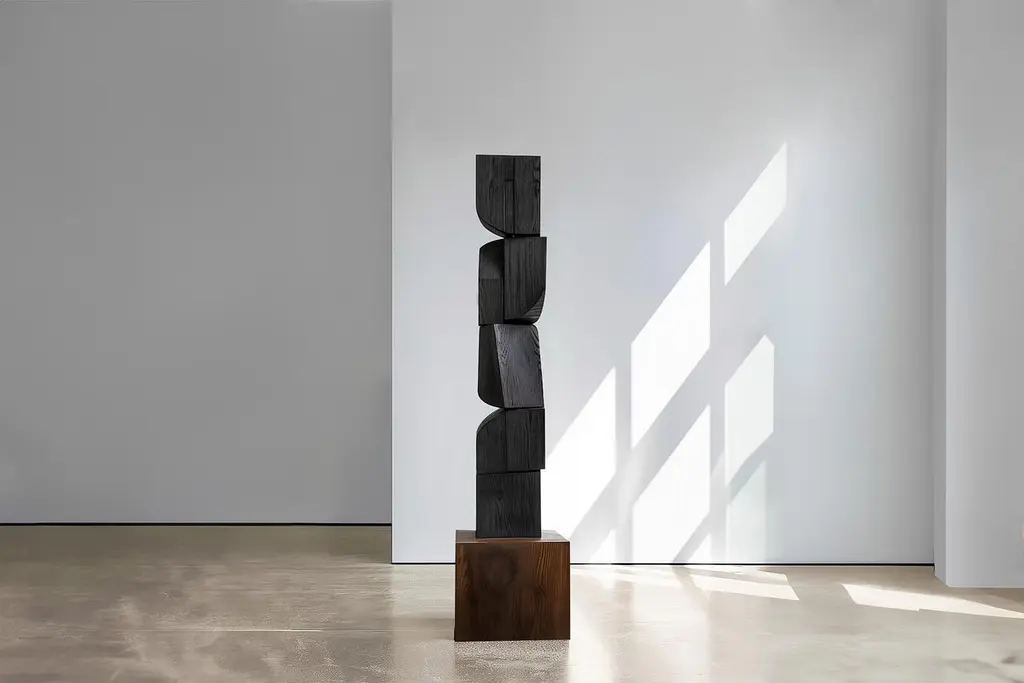 Modern Art Burn Wood Unseen Force No43 Abstract by NONO———This monolithic sculpture, designed by the talented Artist Joel Escalona, is a towering example of beauty in craftsmanship. Hand and digital machine made; the standing sculpture stands tall as a monument to the skill of the artist. The wood carved sculpture is a biomorphic pillar with an intriguing, wonderfully undulating surface, crafted with precision and care to create a wonderful patina.Inspired by masters of abstract carving like Constantin Brancusi, Isamu Noguchi and Jean Arp, this outstanding sculpture embodies the spirit of organic art. Each piece is made to order, specific for each client and takes around 3-4 months to complete. Although each sculpture is unique, they all maintain the same spirit, proportions, and dimensions that make them so exceptional.This sculpture, like a beautiful work of art, is prepared to be mounted on a plinth, which is included. The organic sculpture is a beautiful expression of art and nature, a testament to the wonder of the natural world and the power of human creativity. This hand-crafted wood sculpture is a true masterpiece and a magnificent addition to any collection.——NONO is a Mexican design brand with more than 10 years of experience dedicated to the production of interior furnishings, editions, and custom-made projects. At NONO, we create pieces of extraordinary beauty, accommodating the particular needs and tastes of each client with exclusive high-quality designs.————Some details to consider when placing an order with us:• Catalog images are digitally generated. Actual products may slightly vary in texture, grain, and final finish due to natural material differences. Despite these variations, our expertise ensures each piece maintains high quality and matches the intended design.• All of our products are made to order, and the lead time for standard products is estimated to be 9 to 12 weeks, plus shipping time. However, special pieces or sculptures may require a longer lead time.• We offer customization in dimensions and finish for all of our furniture pieces, which may result in additional charges.• We only facilitate freight services by a third party. The client is solely responsible for any associated import/export taxes, as well as any necessary customs paperwork.• We are not responsible for any damages that may occur during shipping or for any customs-related delays.