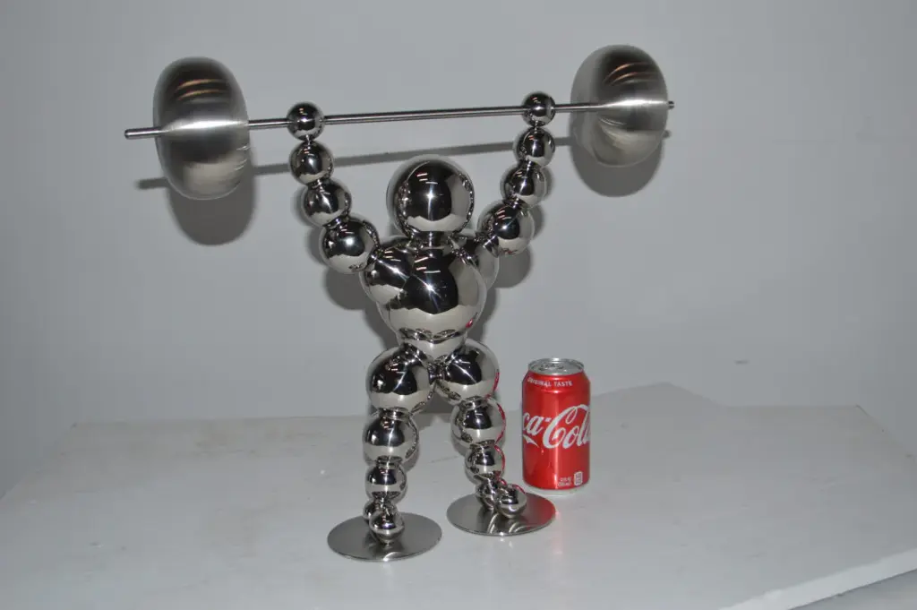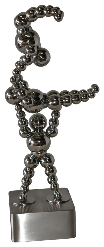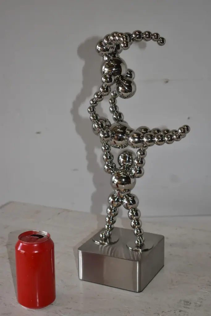 Decorate your home with this beautiful, tabletop, modern looking, stainless-steel abstract of Acrobat Couple in Action. These decorative abstracts made of Stainless-steel balls will become an extraordinary focal point to any kitchen, Livingroom, or patio! We sell a whole line of this style of modern art. You can be sure they will be a conversation starter and the topic of much appraised comments in your home. Size: 6"L x 8"W x 18"H. Weight is: 3Lb