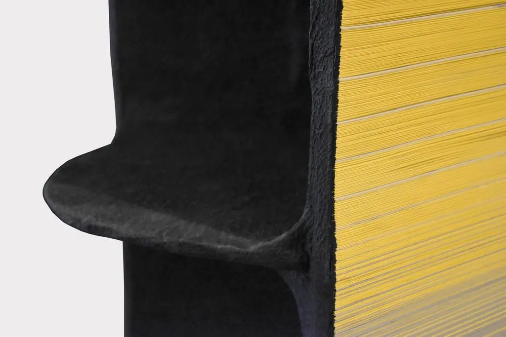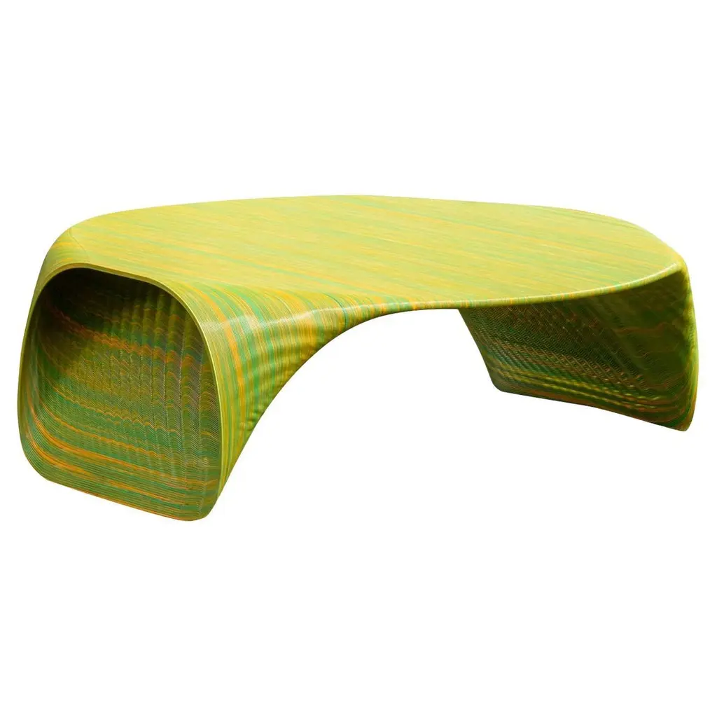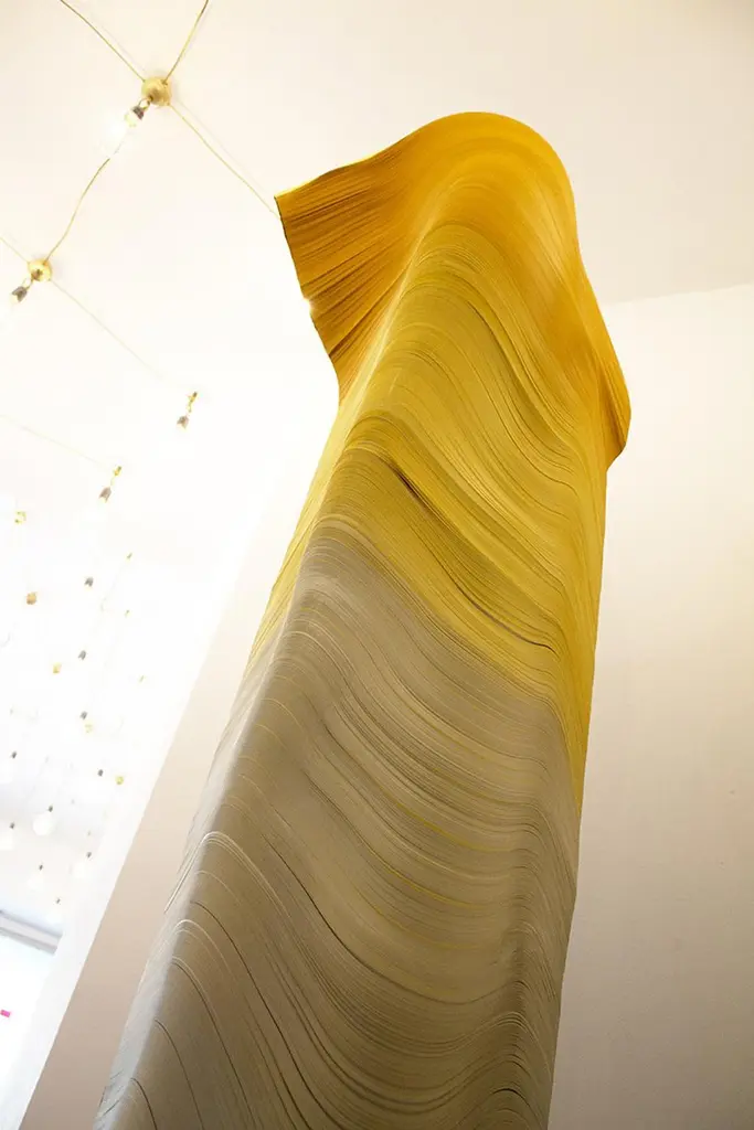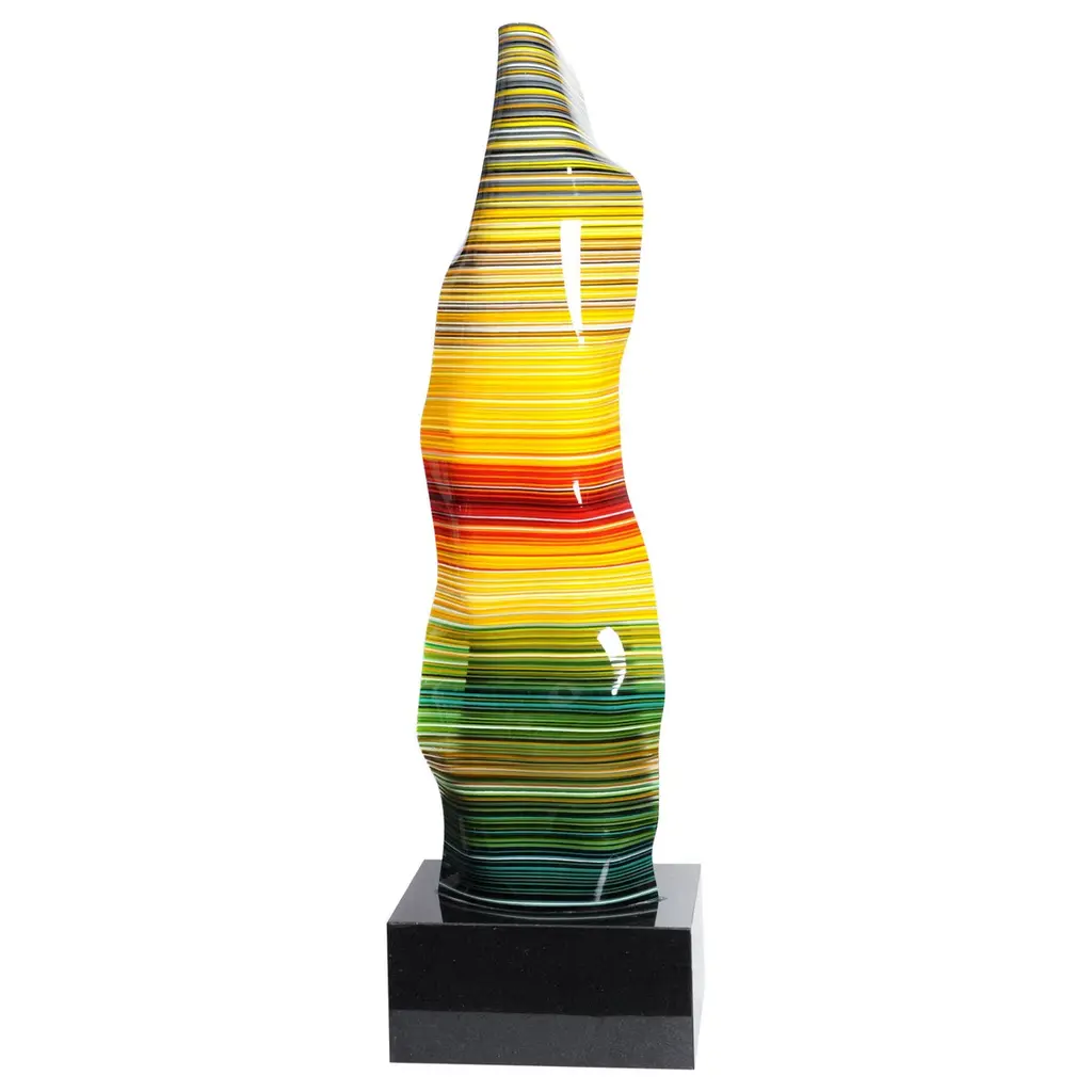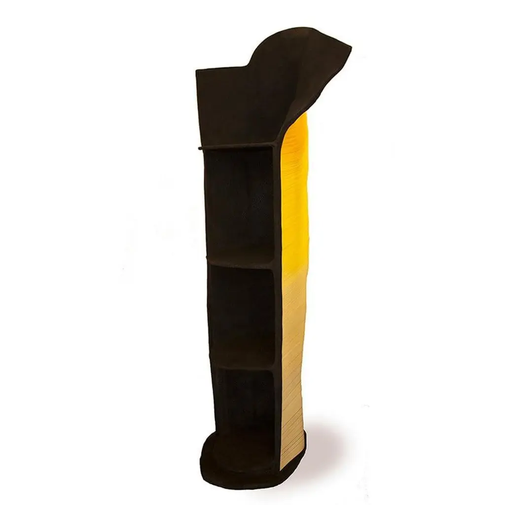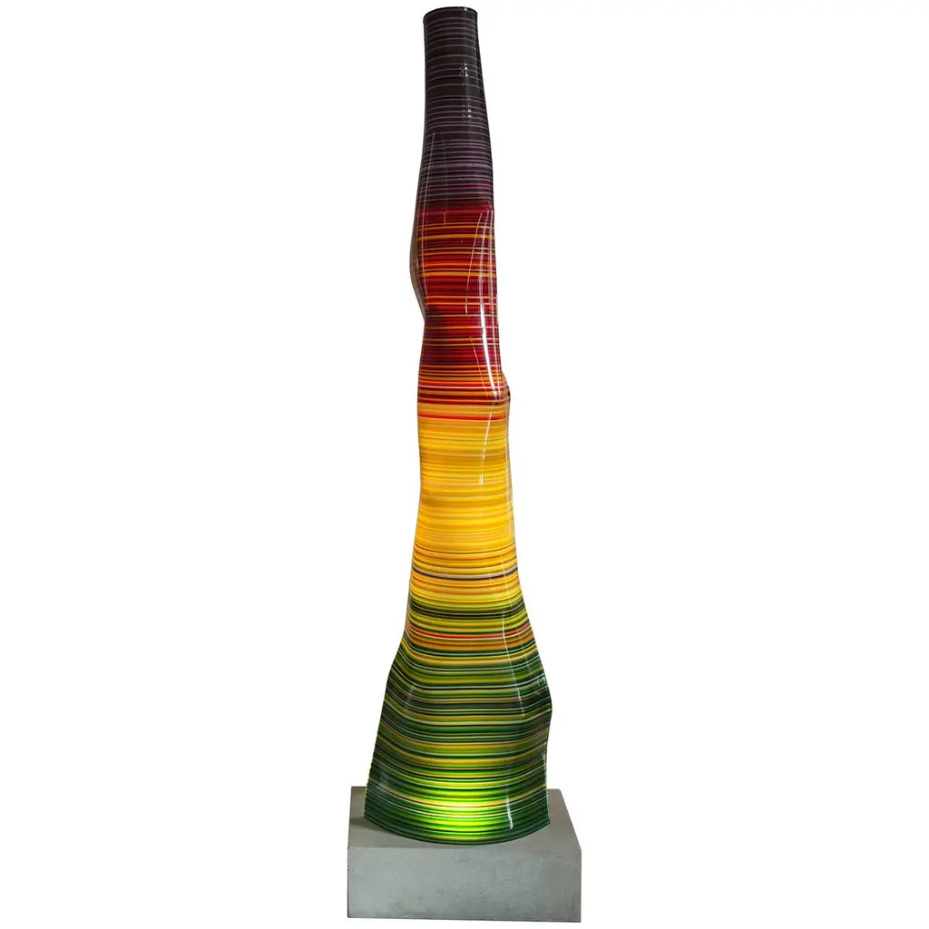 Totem sculpture of angular shape with support on the ground, made with strips of selected paper for weight and color for Dilmos Milnao. The Totem is equipped with an internal, laminated lamellar structure with three shelves. Metria is a single vertical element which in composition with several elements, it becomes a modular partition wall.Signed by the designer.Available in blue, green and red finishes.Size:cm 50 x 50 x 210 H.