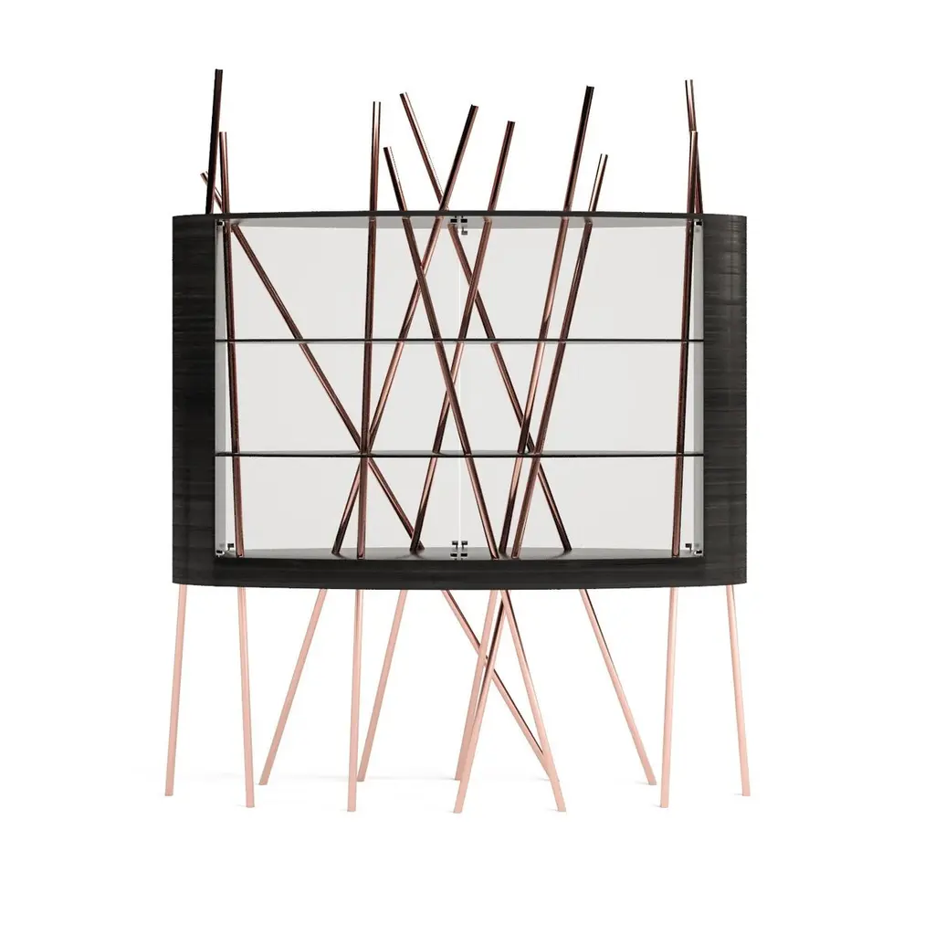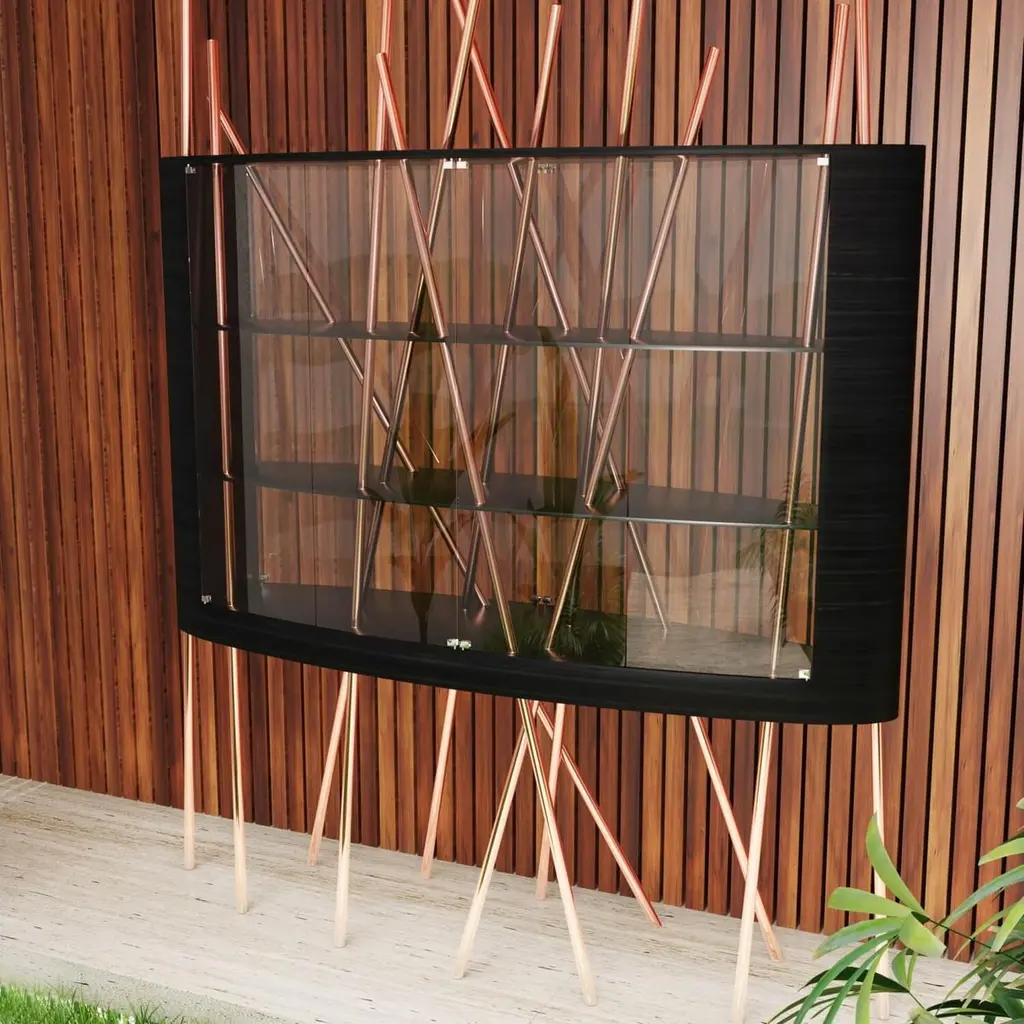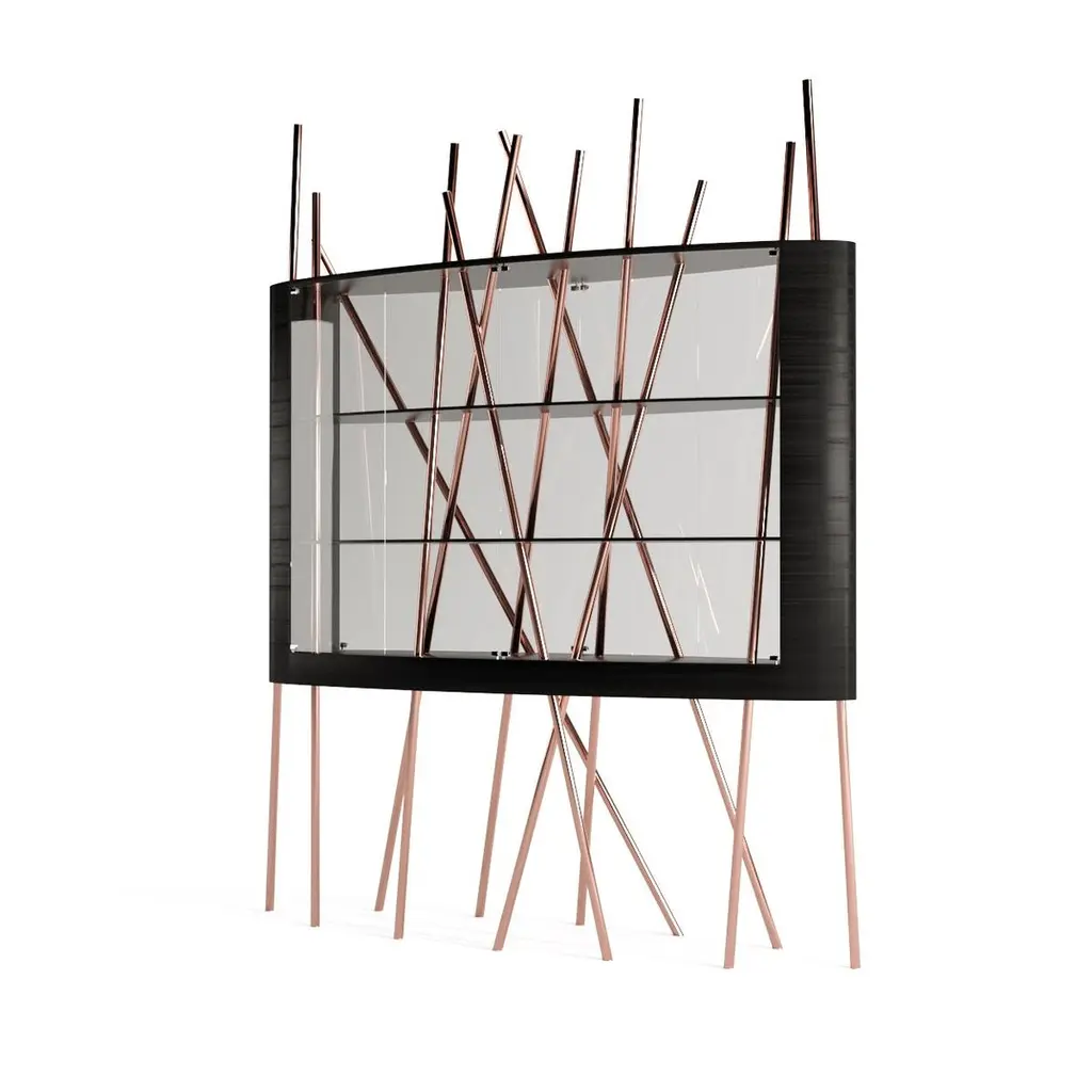 The Mikado Collection is inspired by the game "Pick a Stick" we used to play in childhood. Tubes of thick copper, which remind us of the Mikado sticks game, are cut at precise angles and fitted with great accuracy in the furniture, providing much-needed support. This vitrine, "Mikado Display Case XL", is a beautiful way to showcase those collectables we love — unique pieces that shouldn't be in a drawer, sometimes filled with sentimental value. Its form is light and fluid, with the vitrine appearing to float over the finely crafted legs. Many consider this piece a work of art, like a sculpture. The listed piece is mastercrafted of carefully selected black oak wood, black lacquered wood, and handmade brushed copper. Copper furniture is not just a trend; it will last long. It's perfect for creating a warm and inviting ambience in any space. Also, copper is 100% recyclable, eco-friendly, and highly durable.However, we can also manufacture this vitrine using customised options and larger sizes. Structure: Stainless steel (polished or brushed); brass (polished or brushed); or copper (polished or brushed). The polished or brushed finish is handmade by the author.Body: Another kind of wood (ebony macassar, tineo, walnut, ironwood) or lacquer colour.Smaller size (50 x 150 x 205 cm - 59,1 x 19,7 x 80,7 in).Custom dimensions are only available after analysis.Needs simple assembly.You can try this piece in your space using Augmented Reality on your mobile phone (available on our Mikado Collection website).In 2018, it won a "Silver A' Design Award" in the "Furniture, Decorative Items, and Homeware Design" category.This piece is entirely made in Portugal and manufactured artisanally. The author carefully executed or supervised every process step in a small workshop context.Labour of love from Portugal.Designer/Author - Joao Faria/Emotional Objects.Manufacturer - Joao Faria/Emotional Objects.At Emotional Objects, we don't follow trends or fashion. Instead, we create distinct and timeless objects with solid ideas and concepts. Every Emotional Object has a meaningful story behind it. Made to last for generations, we proudly see our objects as future furniture classics that will stand the test of time.Working in Portugal with the best artisans, Joao Faria's work is difficult to distinguish between functional and fine art. He uses the finest materials and techniques, but most importantly, he only makes pieces he would want for himself.Art Furniture, Unique, Tailored, Emotional, Truly Yours.