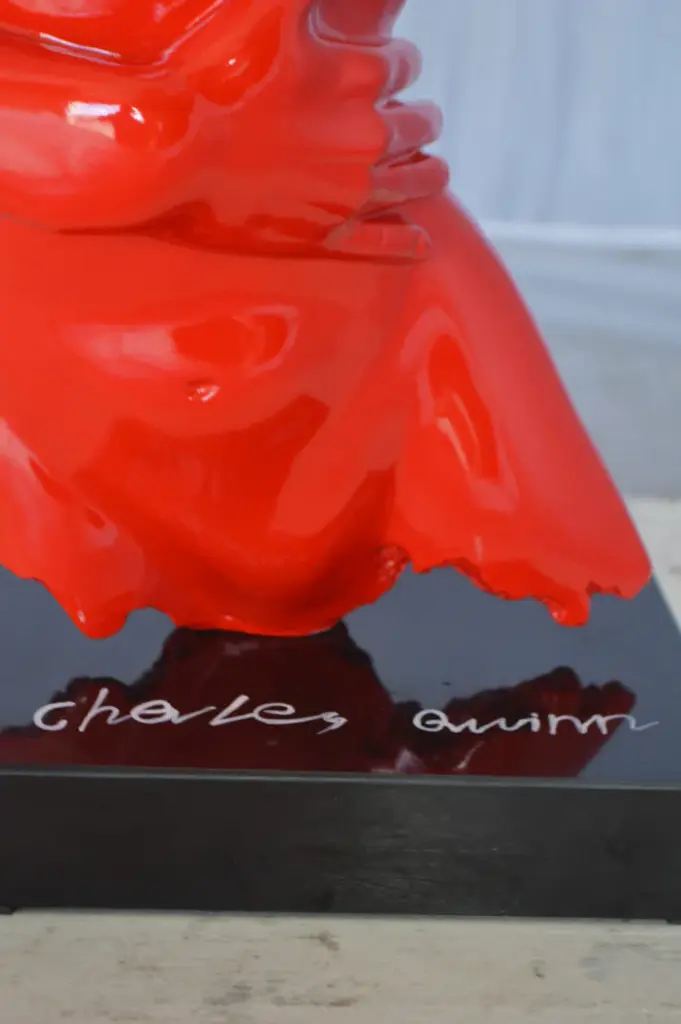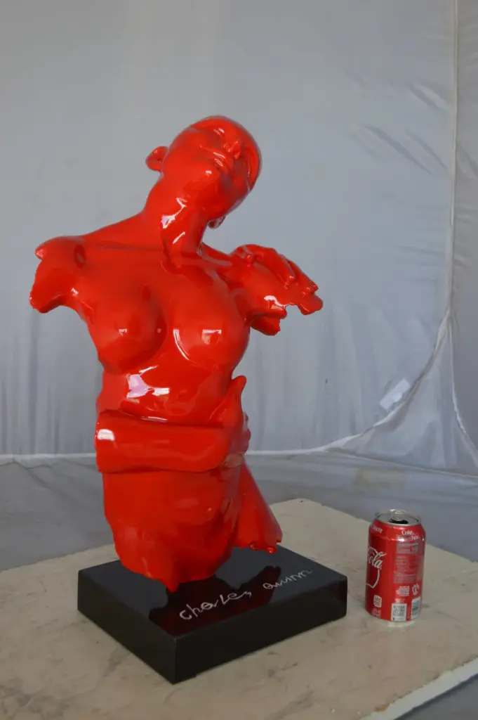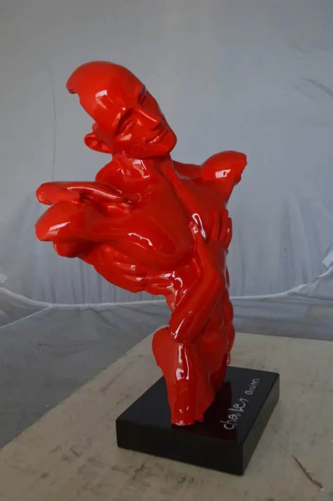This modern-style red resin statue is an extremely artistic piece signifying the bust of the woman with arms surrounding her, connoting an abstract expression based in reality. This beautiful work of art is a wonderful fit for any art enthusiast and would work wonderfully in any home or office. Many customers choose to purchase the Modern resin statue of a man hugged by a woman as well, creating a set of sculptures to add to your space. Size: 13"L x 9"W x 24"H. Weight is: 10Lb