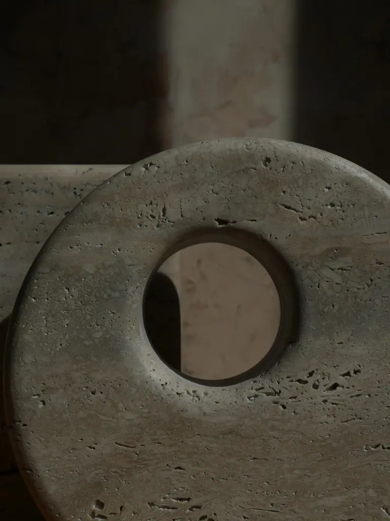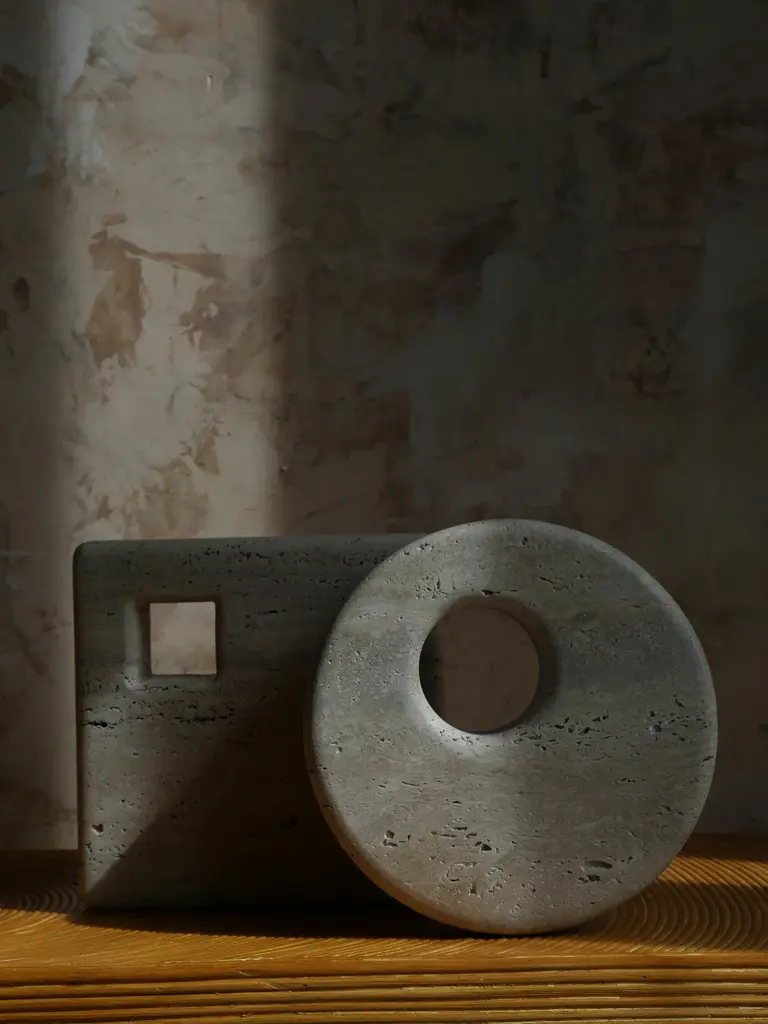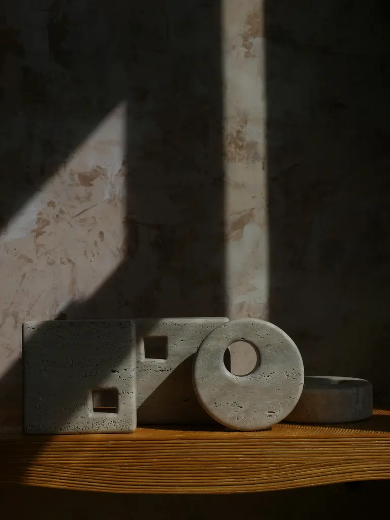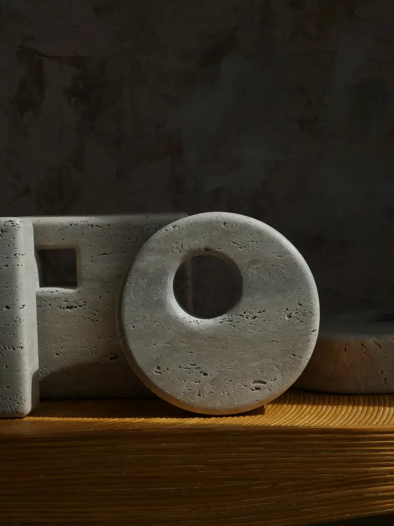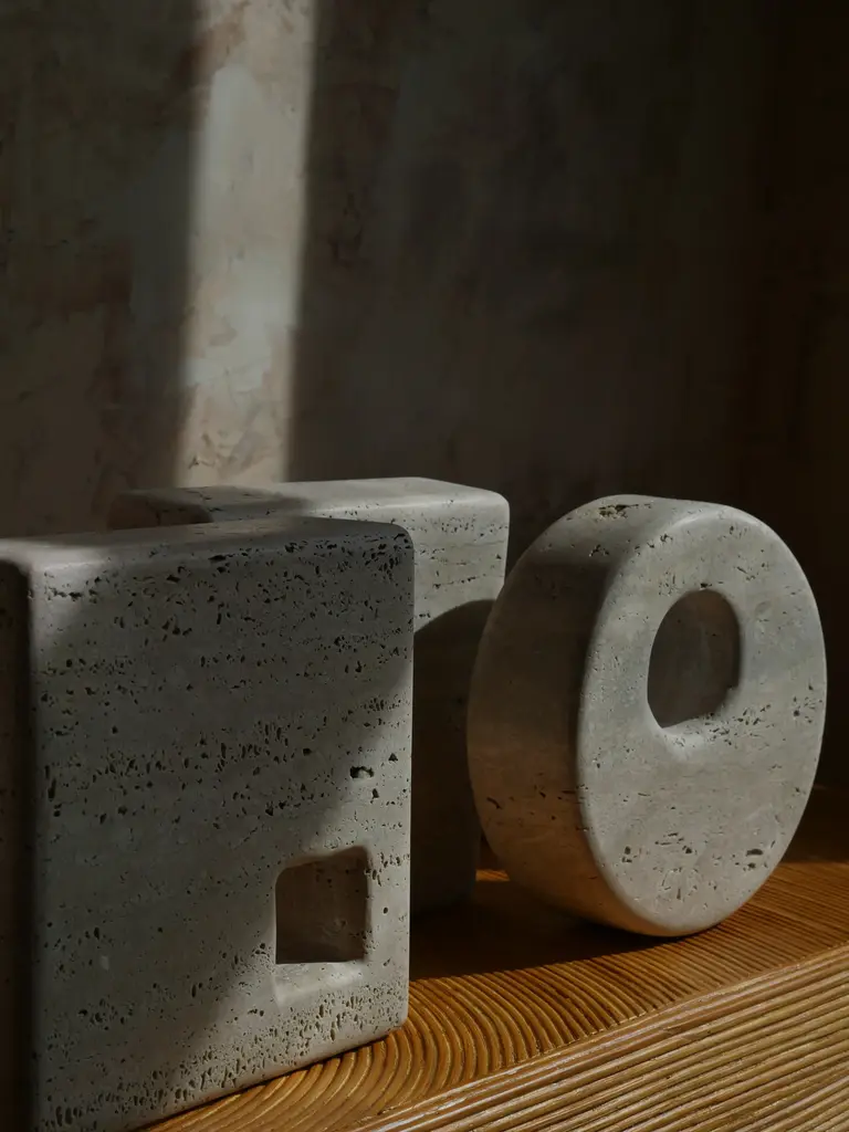 Introducing our custom-made geometric decorative sculpture, created with an artistic vision of simple elegance to elevate your space. Made from Roman Marthe travertine quarried from the mountains of Tivoli, Italy. The solid, unfilled travertine blocks were shipped to Miami , where a seasoned fabricator in business since 1968, honed and handcrafted them to perfection. Each travertine piece features offset holes within their shapes, professionally cored with edges that have been smoothed by hand. This process imparts an organic feel and look to each piece, ensuring a unique and natural touch Our beautiful geometric travertine decor pieces will be made in a limited edition run, with a lead time of three-four weeks.