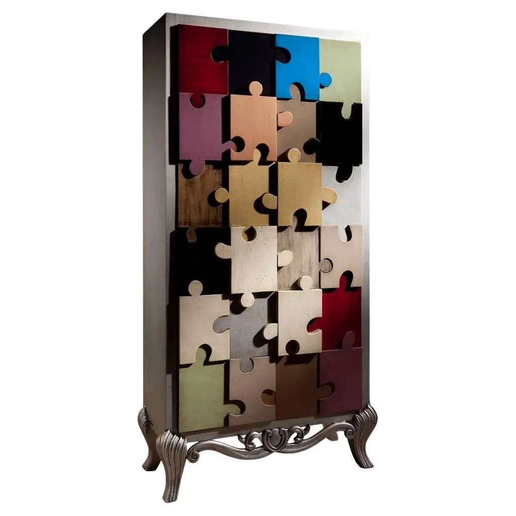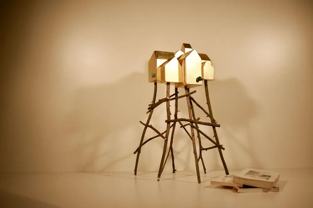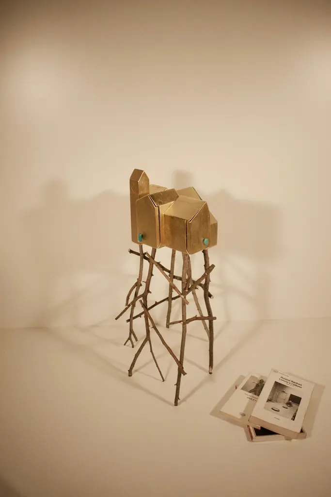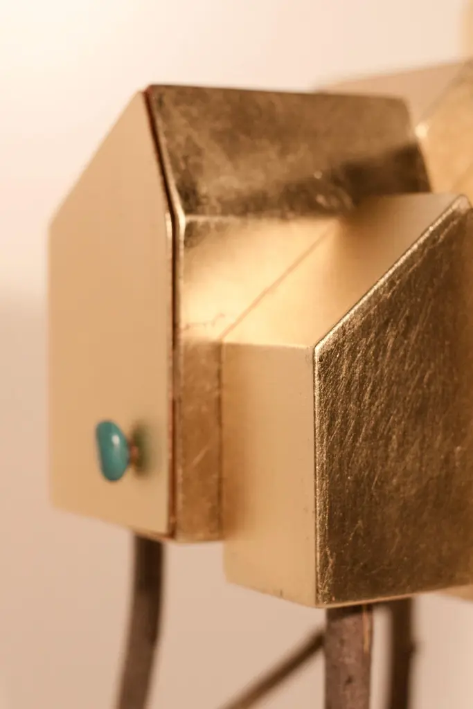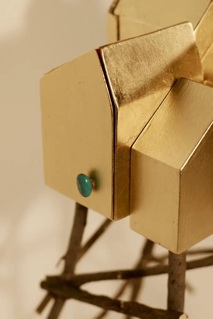 Free standing sculpture with small openings made of hard wood completely covered by the designer in gold leaf; The sculpture is on sticks that represent a banch of wood sticks. The knobs are made with natural Turquoise stone.The works, handmade by the author, can be customized both in size and finish, available in gold, copper or silver leaf.Size available now:cm 30 x 35 x 77 HUnique piece signed by the designer.