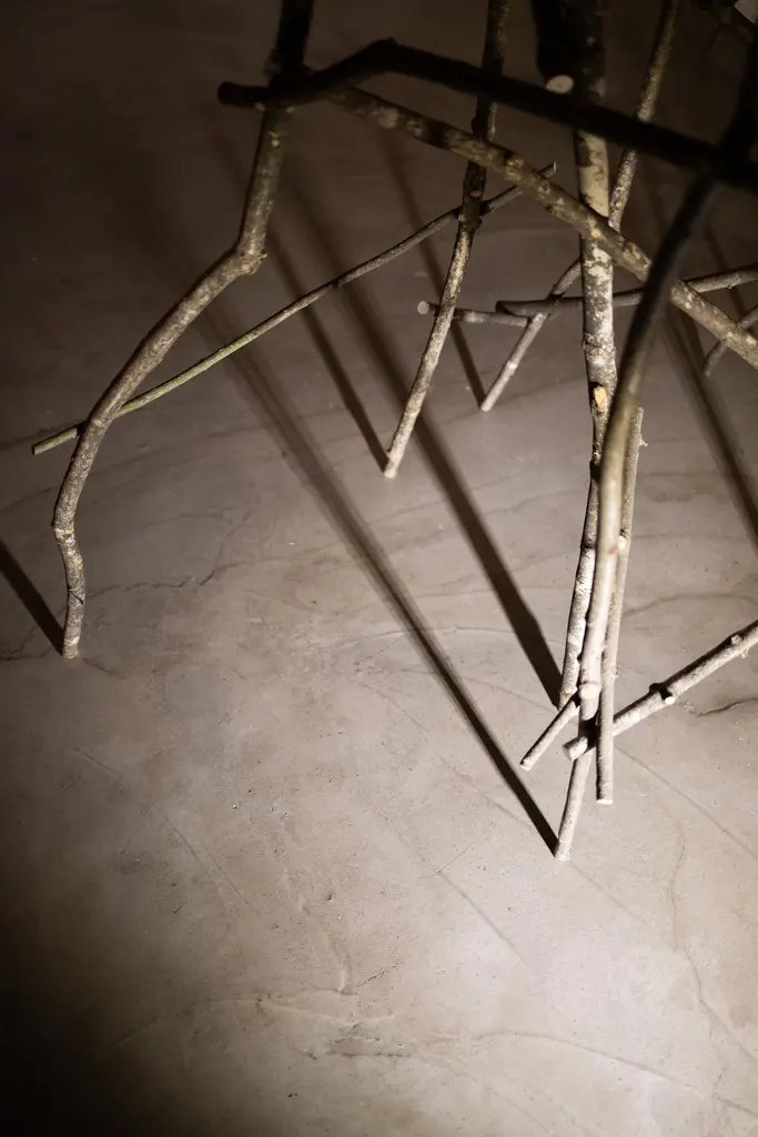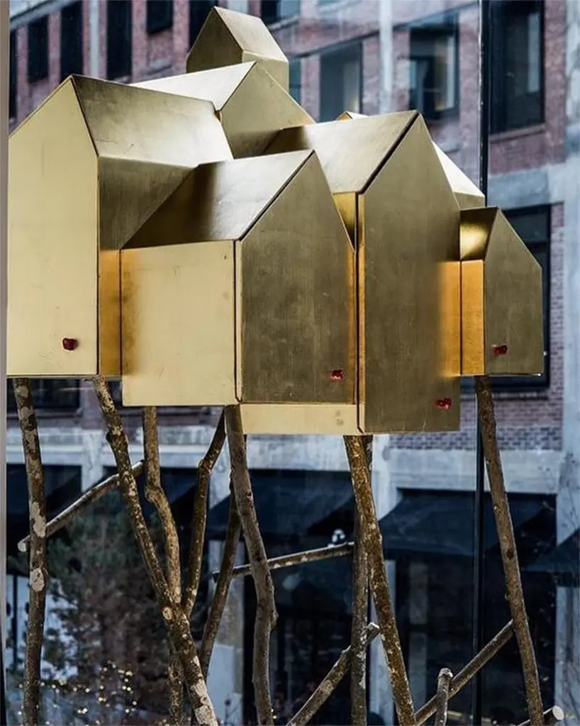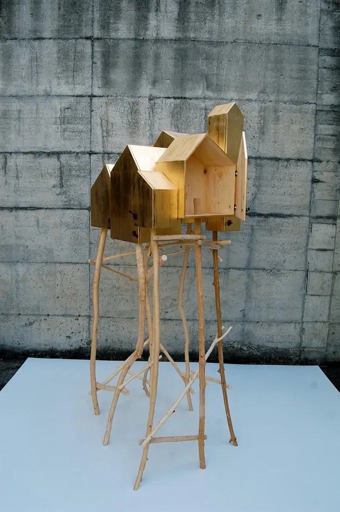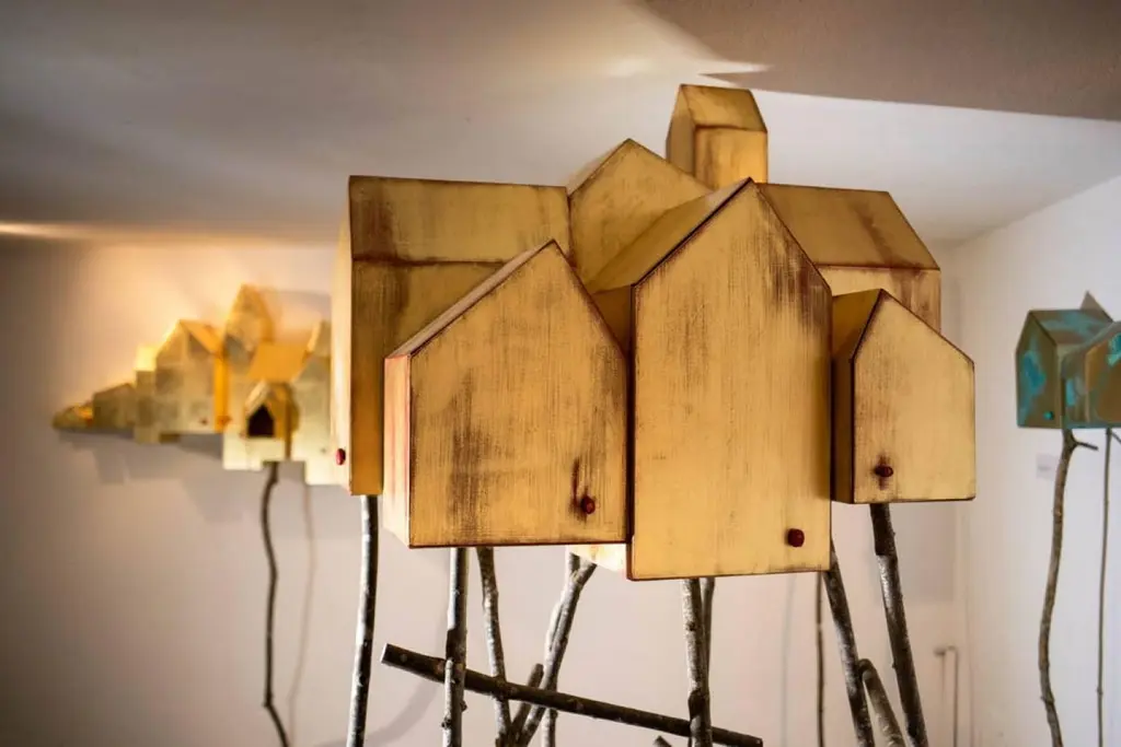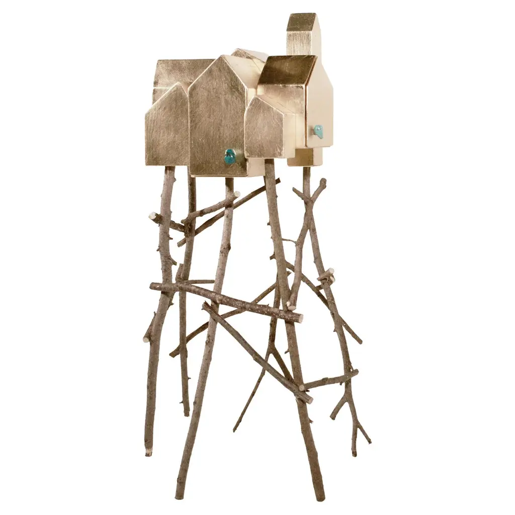 Wooden cabinet for Dilmos Milano, coated in gold leaf, preciously applied by the hand of the designer Umberto Dattola. Supported by a series of branches of ashwood, found in the woods surrounding the Atelier. By connecting the urban places to our own emotions with an invisible thread, we reveal the “ideal cities” that each of us guards in our own soul.Each little door can be opened, thanks to special handles made in red coral.Inside finished in wood.Signed by the designer.Size:cm 90 x 80 x 210 H.