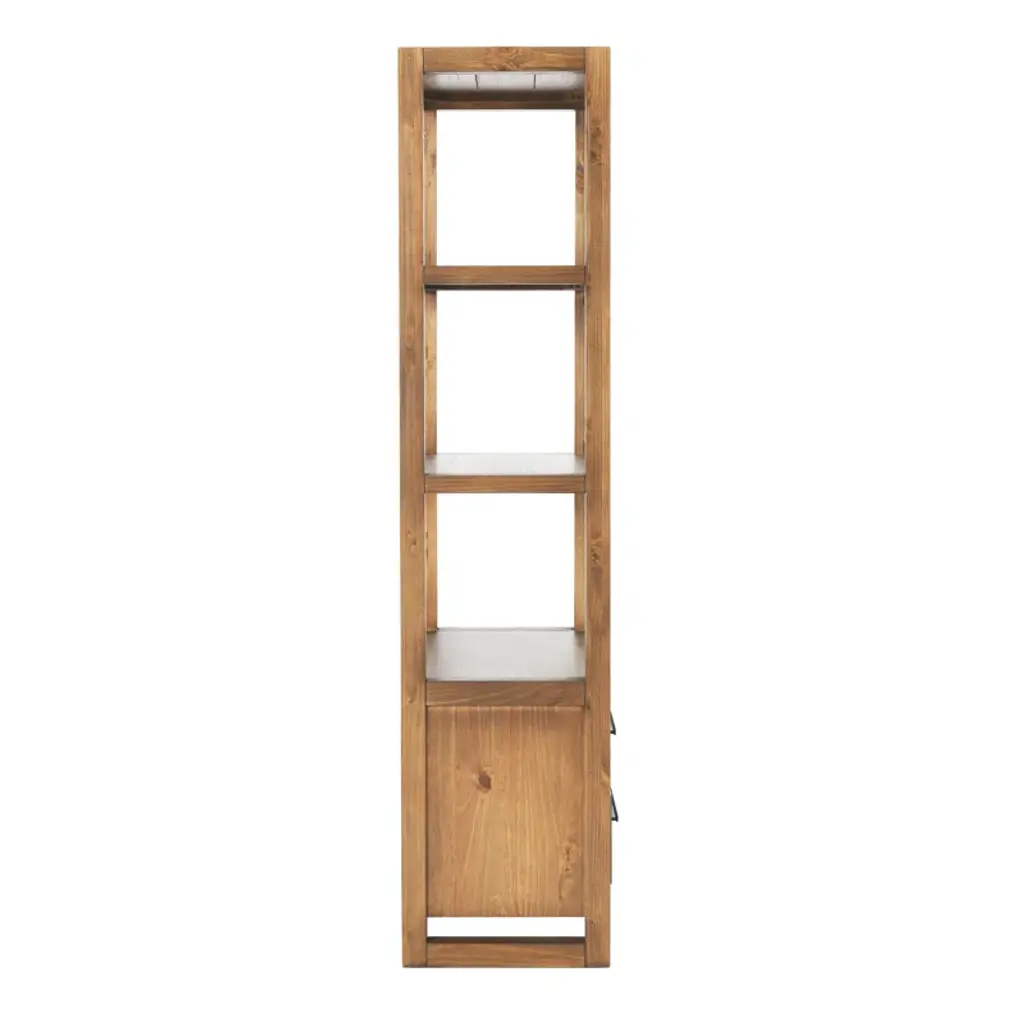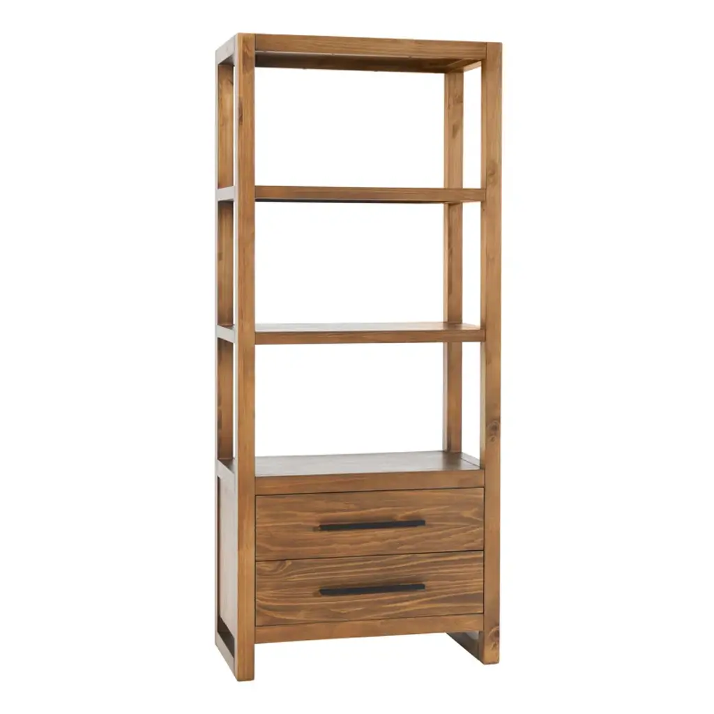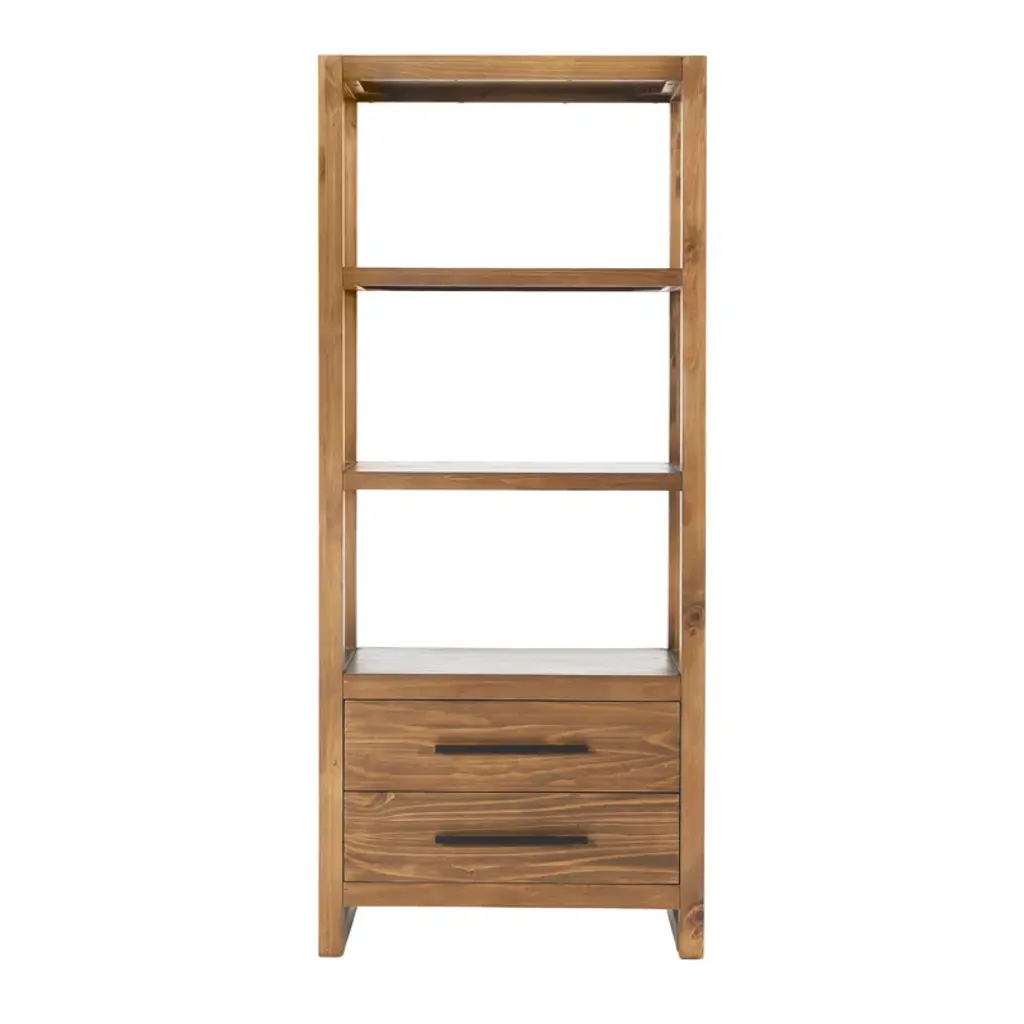 Ample storage space and an airy, inviting silhouette give this bookcase its warm, welcoming vibe. It's made from solid pine wood with a rich caramel-brown finish. We love the way the neutral finish shows off the wood's grain color variation. At the bottom, two drawers offer out-of-sight storage and organization potential. Two shelves provide a place to show off sculptures and potted plants or keep books easily accessible. Best of all, this bookcase arrives fully assembled. It also includes a tip-over restraint device for safety.