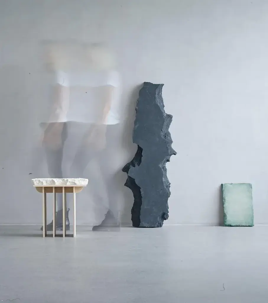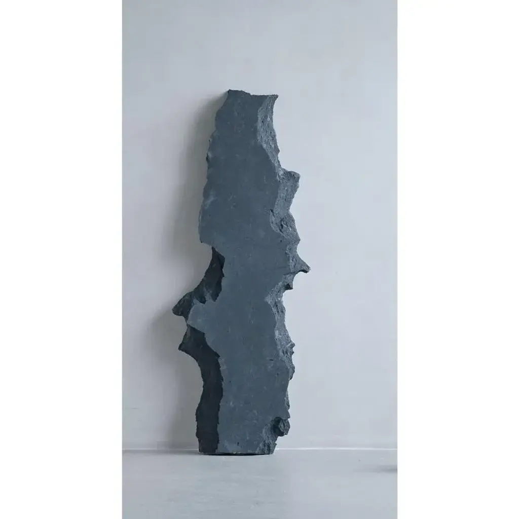 Momentum sculpture by Andredottir & Bobek Dimensions: L 1400 x B 320 x H 120 cm Materials: Reused Foam/Mattress and Jesmontite Hardner in color dark gray. Our work aims to encourage art and design as symbiotic disciplines, giving us as performers free rein to go beyond our professional background and develop a new and experimental art and design language together. We are curious about the borderland between art and design and are focused on the definition and use of the objects we surround ourselves with daily. Our artworks focus on material study, design language, object, and function. We believe that our work can contribute to society and raise social awareness of material research in design, art, and architecture. We believe that our work can contribute to engaging artworks that create less waste and focus on high quality and sustainability in objects. We believe that our works can push ourselves and others to question the definition of objects by using modern material research in hand-built shapes and structures. We see ourselves as an art and design generation of material researchers. Our works aim to explore how objects and materials are used today in products and how we can cross the borders and use materials to their full potential.