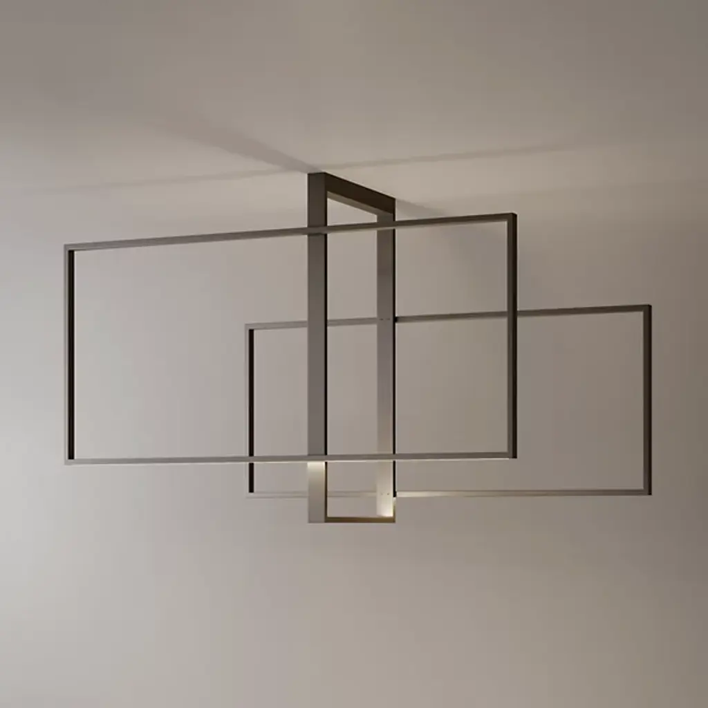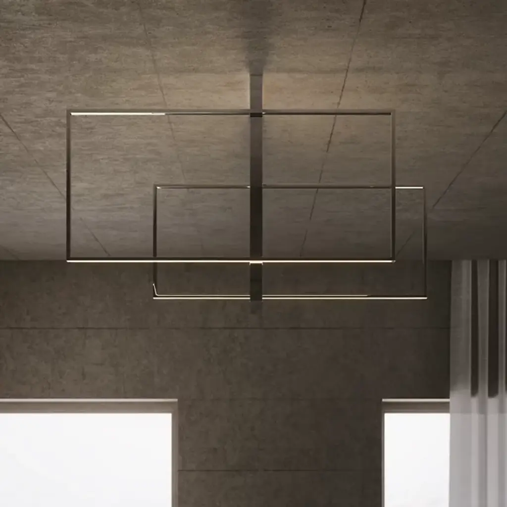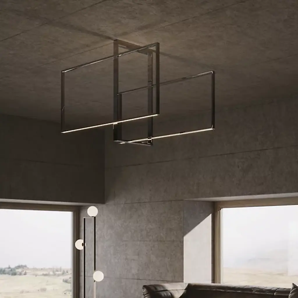 The Mondrian LED Flushmount from Venicem is a clever contemporary design that evokes the interlocking artistry of its namesake. An inspired, rectangular framed sculptural piece descending from a single ceiling mount, threading inset LED lamping inside each arresting frame. This arrangement focuses on fine intersections of the geometric shapes, creating a three-dimensional sculpture that casts slender, angular shadows around it, accompanied by a compounded wash of reflected radiance and strong, energy-friendly illumination.