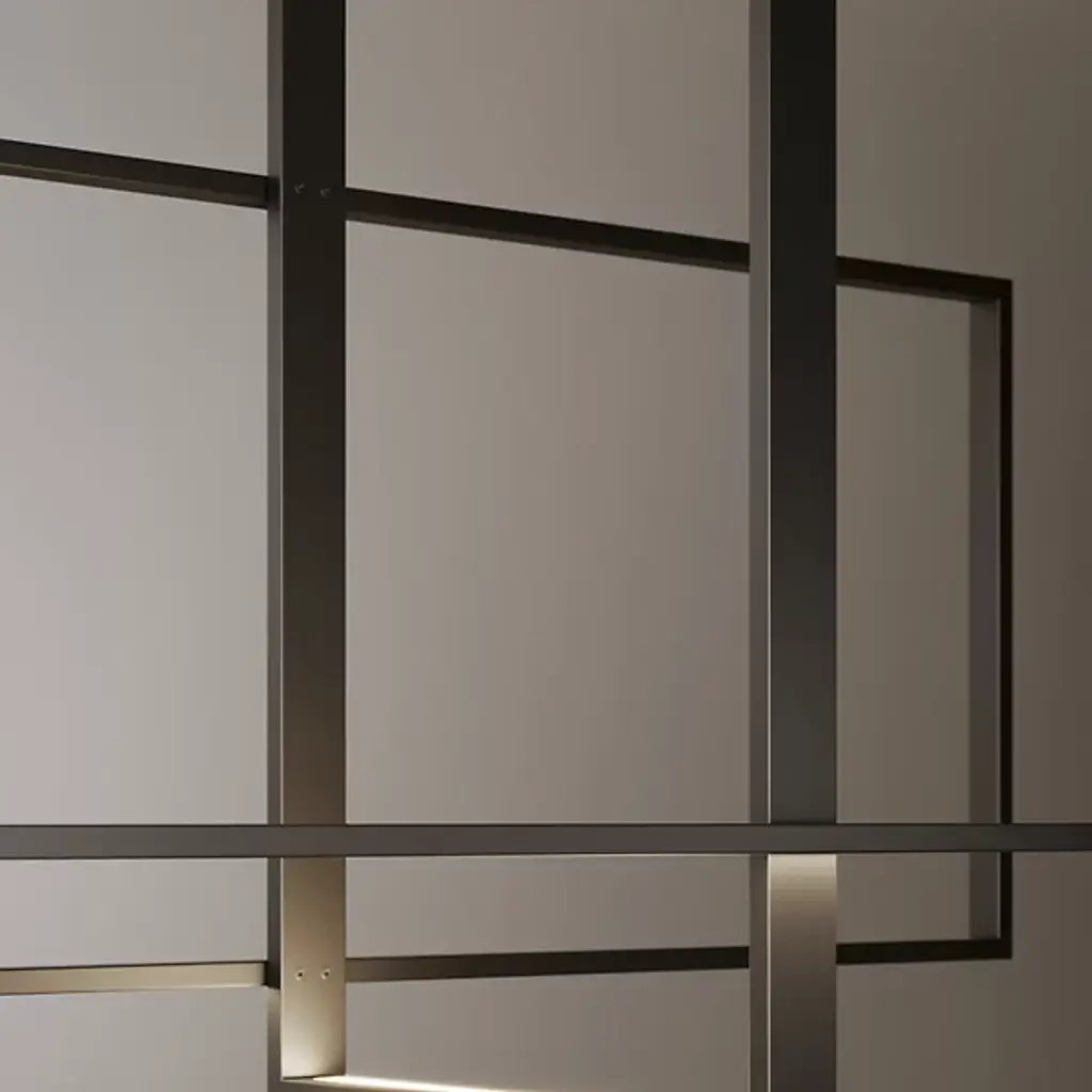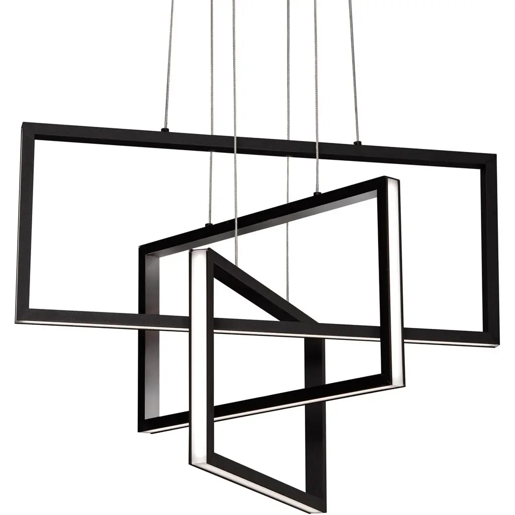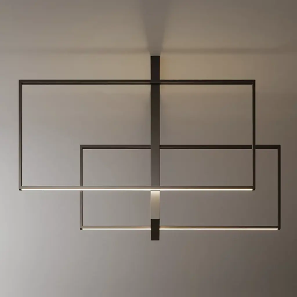 The Mondrian LED Flushmount from Venicem is a clever contemporary design that evokes the interlocking artistry of its namesake. An inspired, rectangular framed sculptural piece descending from a single ceiling mount, threading inset LED lamping inside each arresting frame. This arrangement focuses on fine intersections of the geometric shapes, creating a three-dimensional sculpture that casts slender, angular shadows around it, accompanied by a compounded wash of reflected radiance and strong, energy-friendly illumination.