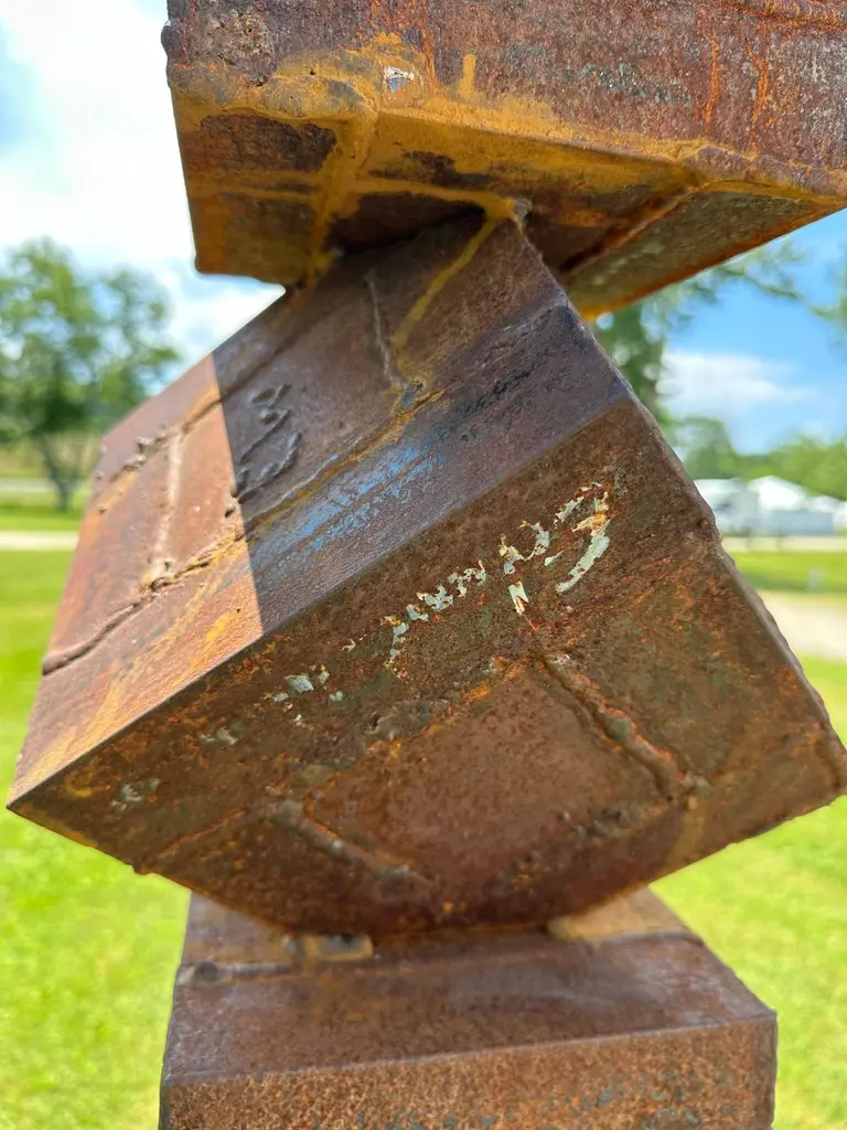 Monumental Brutalist Stacked Cube Steel Garden Sculpture, after David Smith / Paul Evans.. Signed and dated bUT unfortunately illegible. Amazing use of color, texture and space, Eight Stacked and welded cubes with brutalist design measuring 8" cubed,,add sense of modernity and fashion to the garden complementing the traditional greenery. PLEASE NOTE SCULPTURES PRICED PER SCULPTURE ,,, Can be used as Interior sculpture as well,,