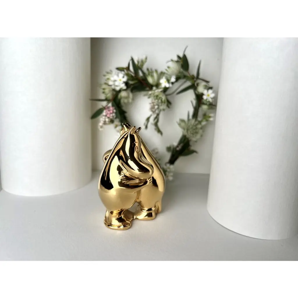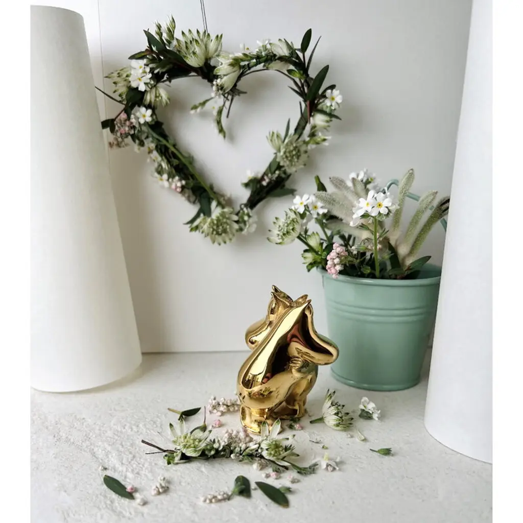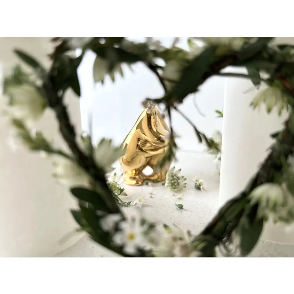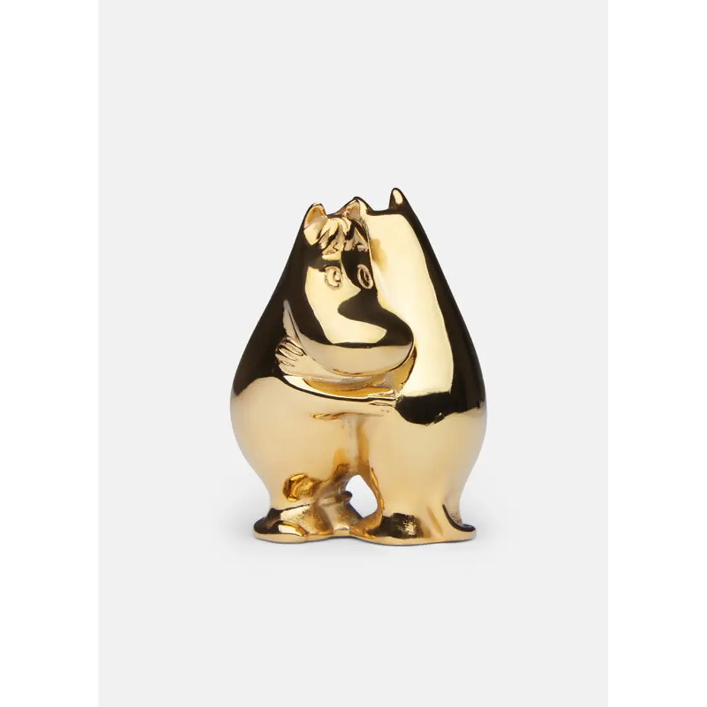 Skultuna's Moomintroll & Snorkmaiden figurine is part of the Moomin x Skultuna collection. Tove Jansson's most beloved Moomin characters have been given an elegant golden glow: the small sculptures are made of steel and plated with genuine 18-carat gold. The high-quality materials and luxurious finish make the figures timeless and durable – they bring a dose of playful elegance to everyday life, both in the children's room and in other rooms of the home. Brighten up your desktop with your favorite characters or decorate your bookshelf with the entire Moomin Family! The embracing characters also make a great wedding or engagement gift or a present for your own significant other.