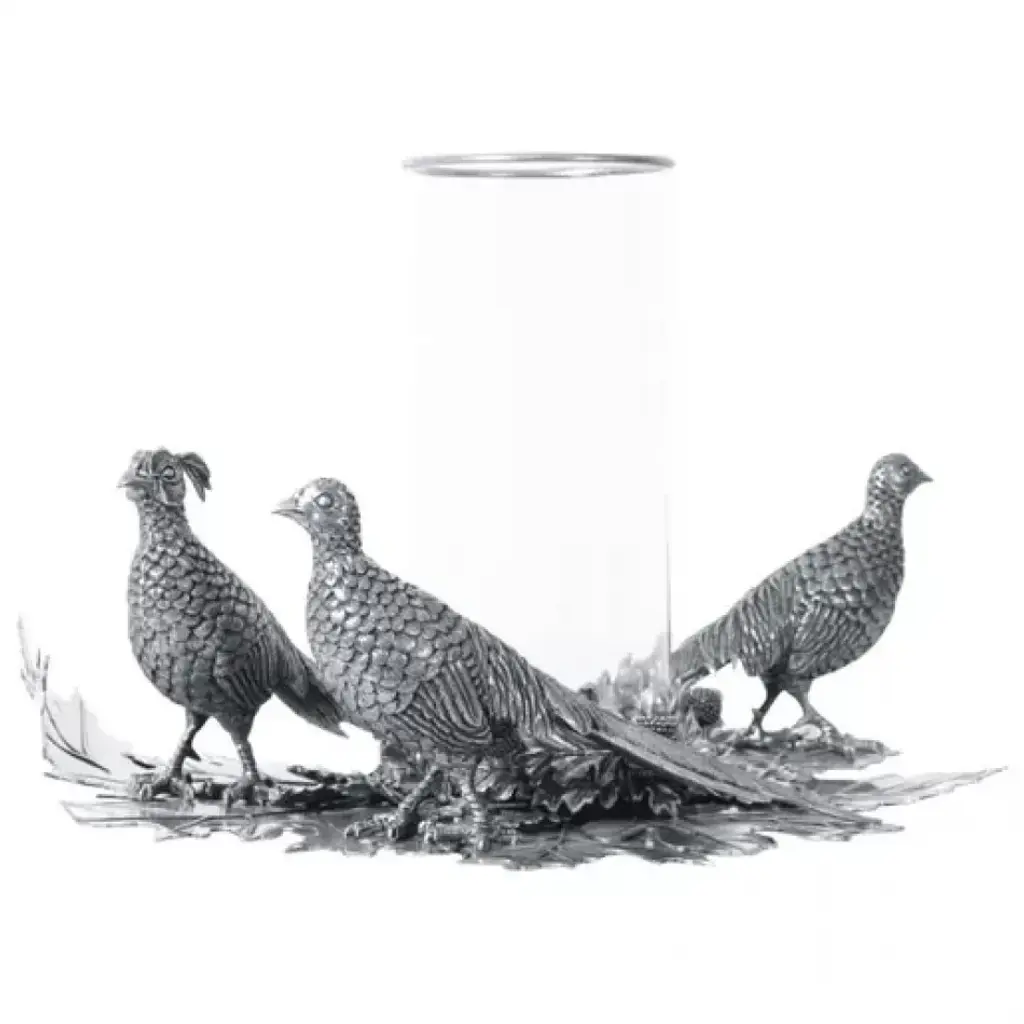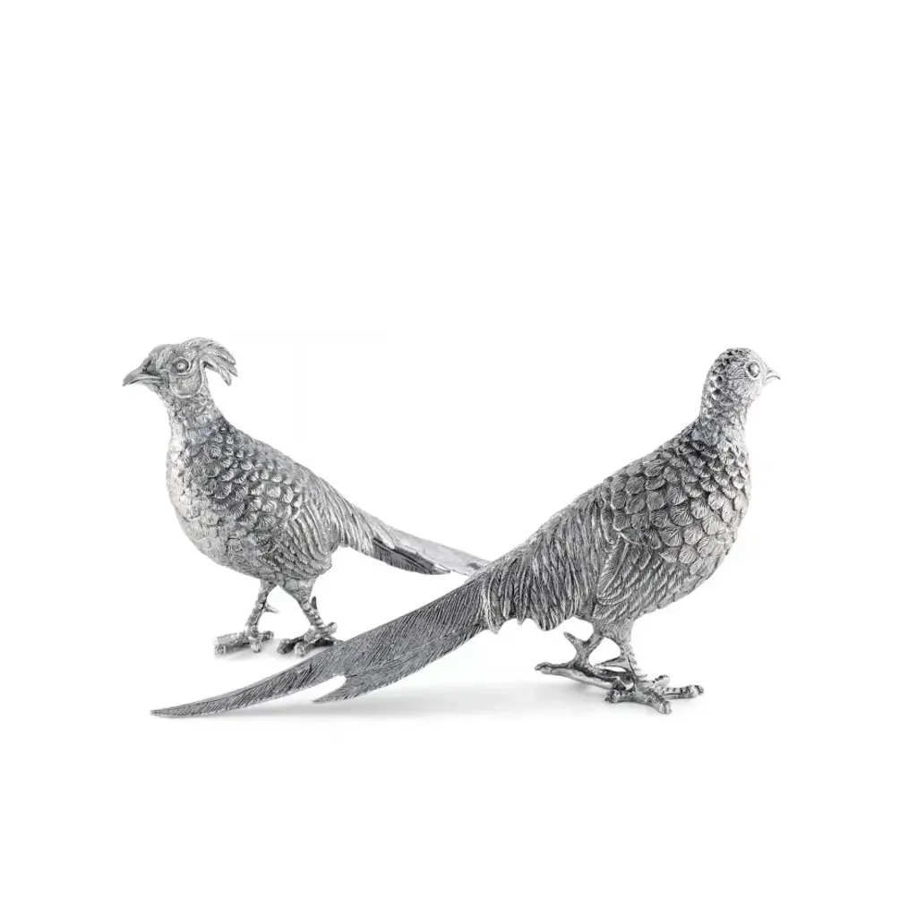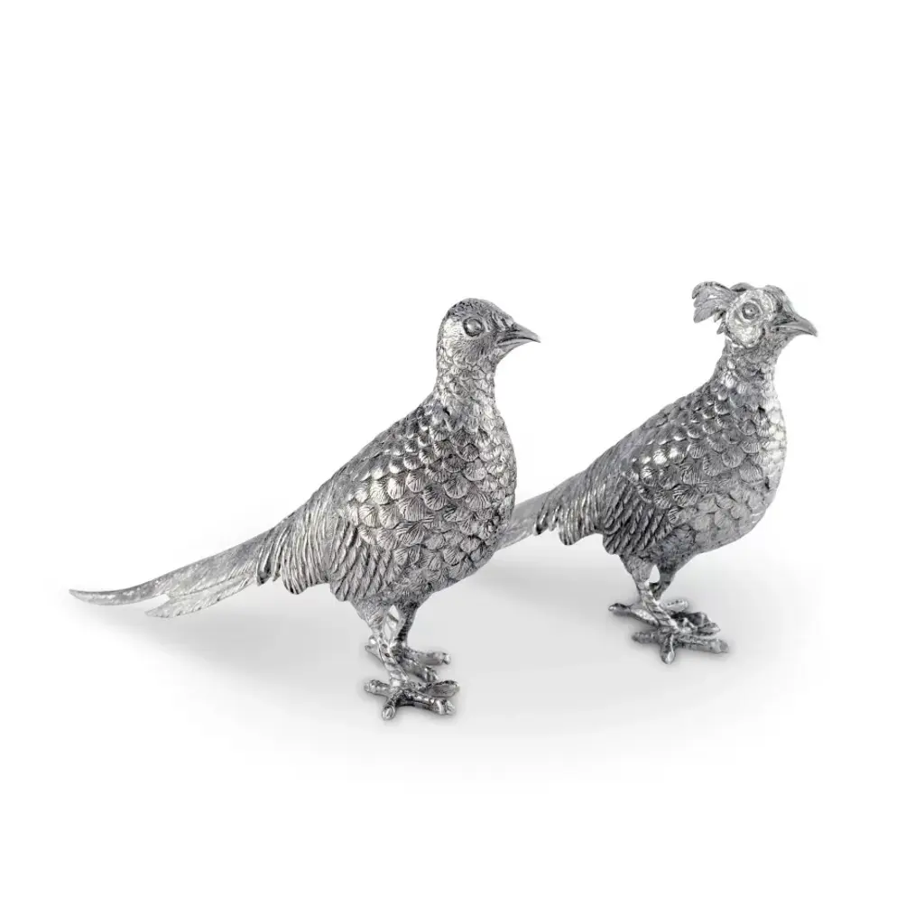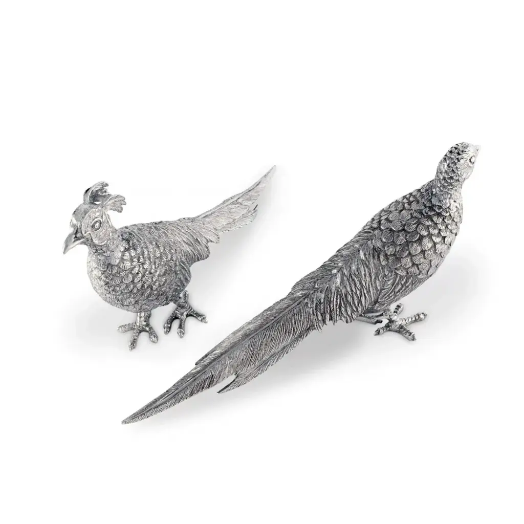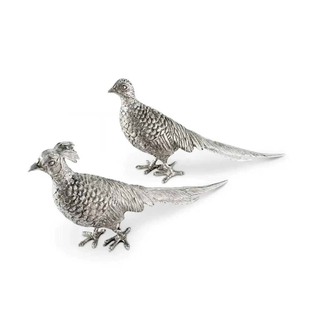 This pair of intricately detailed pure Vagabond House pewter pheasant statuettes are so realistic you may want to offer them some bird seed! Crafted with our signature dedication to capturing the exquisite details, beauty and nature of wildlife in pewter and finely hand-finished. Vagabond House is a family-owned American company specializing in fine pewter tableware, servingware and giftware. Largely inspired by nature, their exclusive products are designed to be unique, functional heirlooms for those who seek to express tradition and style in both family and formal entertaining.