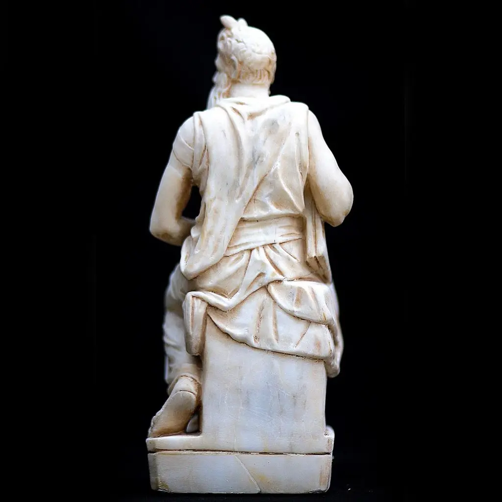 This alabaster work recreates one of the most famous statues of Renaissance Italy, Michelangelo's Moses. The bearded prophet is seated with his head facing left. His right foot is resting squarely on the ground, while the left one is dynamically placed slightly back. The statue expresses the solemn majesty of this famous biblical character.