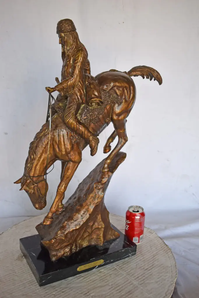 This is a medium size, pure bronze Statue of the Mountain Man replica by Frederic Remington mounted on a marble. The Mountain Man depicts a dramatic moment in the daily life of a frontier trapper, in which he and his mount work together to descend a precarious slope. Cast in the lost-wax technique, the Mountain Man statue is sharply delineated with a rich variety of textures, from the fringed buckskin garment to the animal"™s hairy coat to the rocklike base. This replica will add another perspective of the American history to your home. Size: 18"L x 8"W x 28"H. Weight is: 40Lb