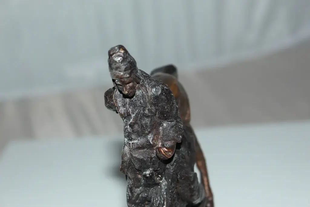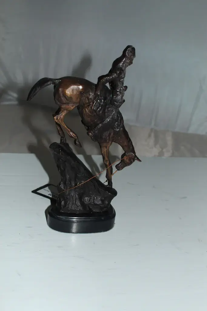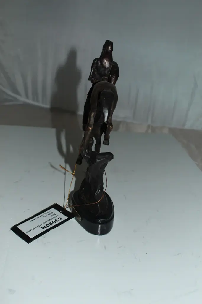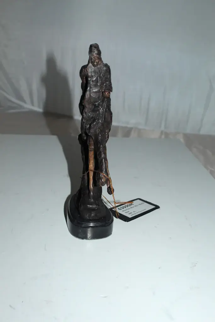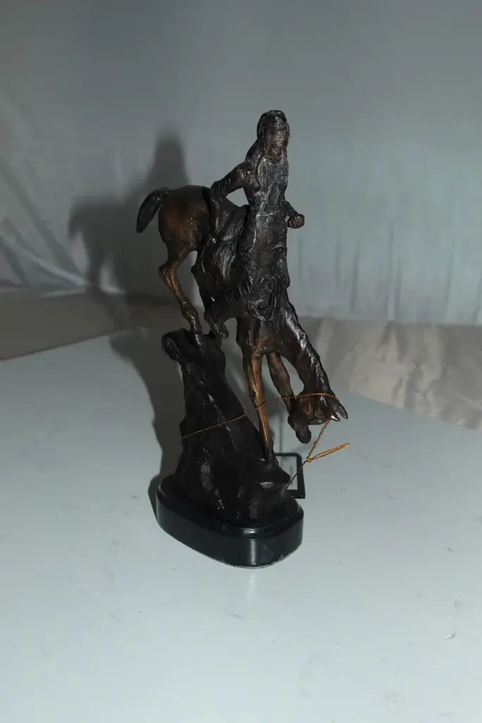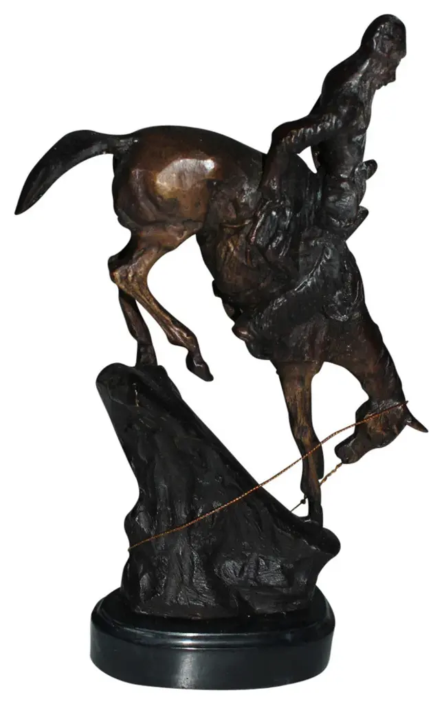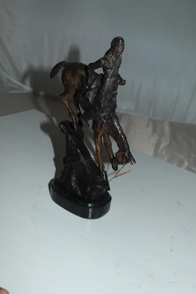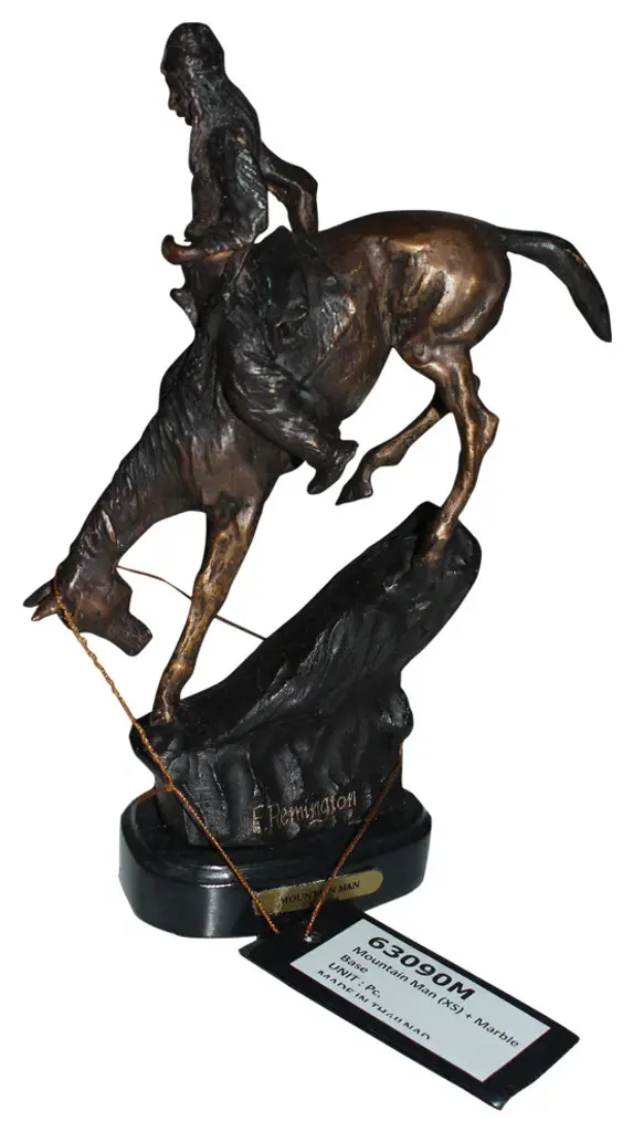 100% Bronze Sculpture Statue Mountain Man By Frederic Remington Replica. The Mountain Man depicts a dramatic moment in the daily life of a frontier trapper, in which he and his mount work together to descend a precarious slope. Cast in the lost-wax technique, the Mountain Man statue is sharply delineated with a rich variety of textures, from the fringed buckskin garment to the animal"™s hairy coat to the rocklike base. Size: 7"L x 2.5"W x 11"H. Weight is: 3Lb