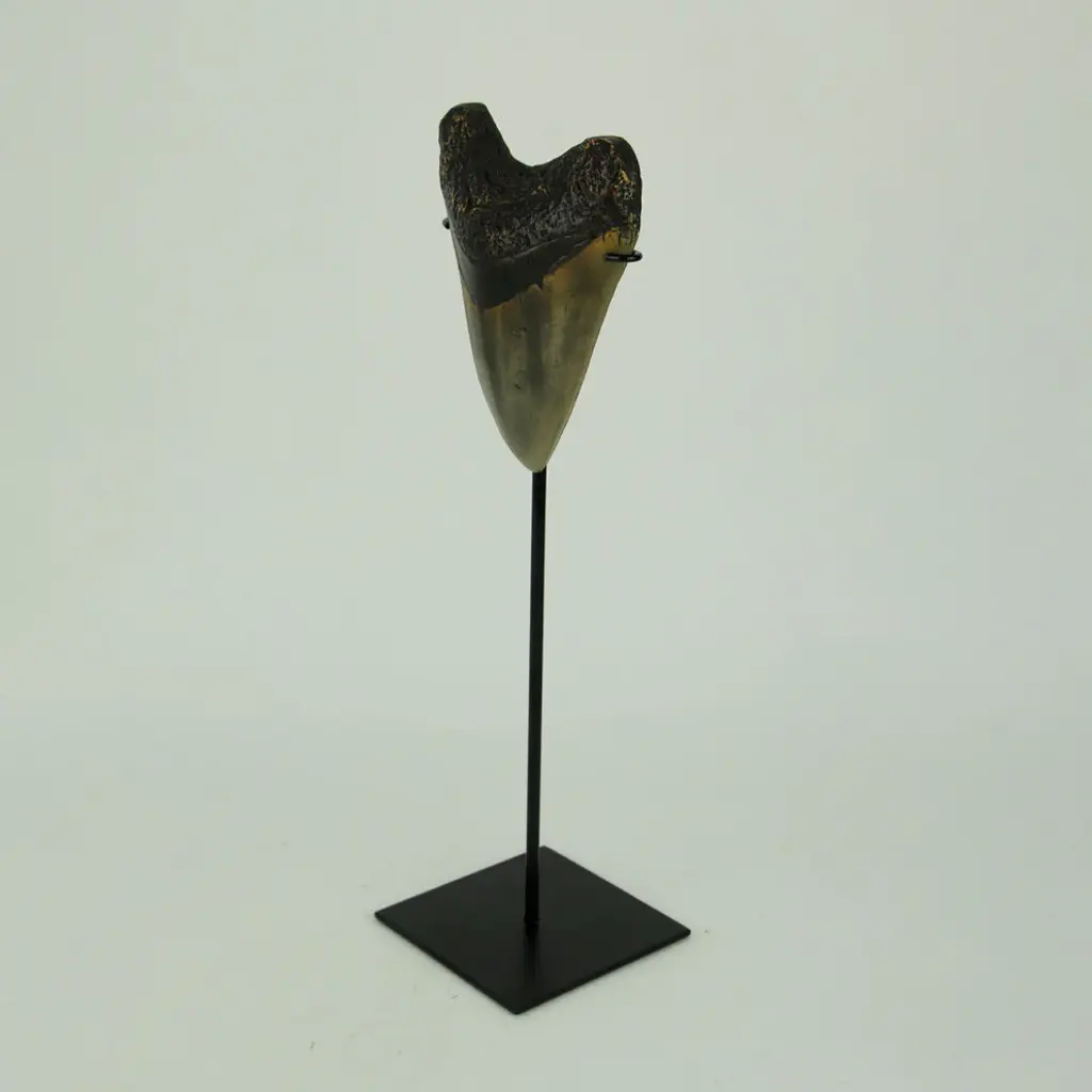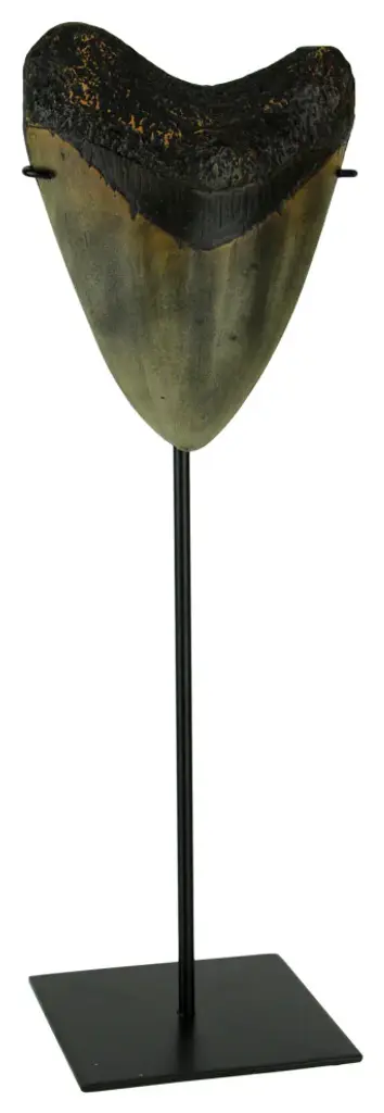 OVERALL SIZE - 13.75 Inches High, 4.5 Inches Long, 4 Inches WideCreatively Cast in Resin and Displayed On a Black Metal Museum Mount StandHand Painted Finish in Black, Beige and Grey Gives it the Look of an Old Fossilized Shark ToothA Stunning Decor Accent Perfect for Any Coastal Inspired Home or OfficeSure to Spark Curiosity and Become a Captivating Conversation PieceThe megalodon is an extinct shark species that lived from the early Miocene era (23 million years ago) to the end of the Pliocene (3.6 million years ago). The name Megalodon means big tooth, a fitting name. Their teeth were often found embedded in rocky formations, leading to the belief they were the petrified tongues of dragons and snakes, and later were recognized as shark teeth. Megalodon fossil teeth can still be found in fossil beds, as well as on the ocean floor, and can be worth thousands of dollars. This cool-looking replica megalodon shark tooth fossil looks like an ancient specimen with its beige, black, and grey finish that takes on a lifelike look. It''s beautifully cast in resin and presented on a heavy-duty black metal museum mount stand. The tooth measures approximately 6 inches high, 4.5 inches long, and 4 inches wide, and with the display mount, it stands 13 inches high. Displayed on a coffee table, end table, or bookshelf, it will be sure to spark curiosity as a captivating conversation piece.